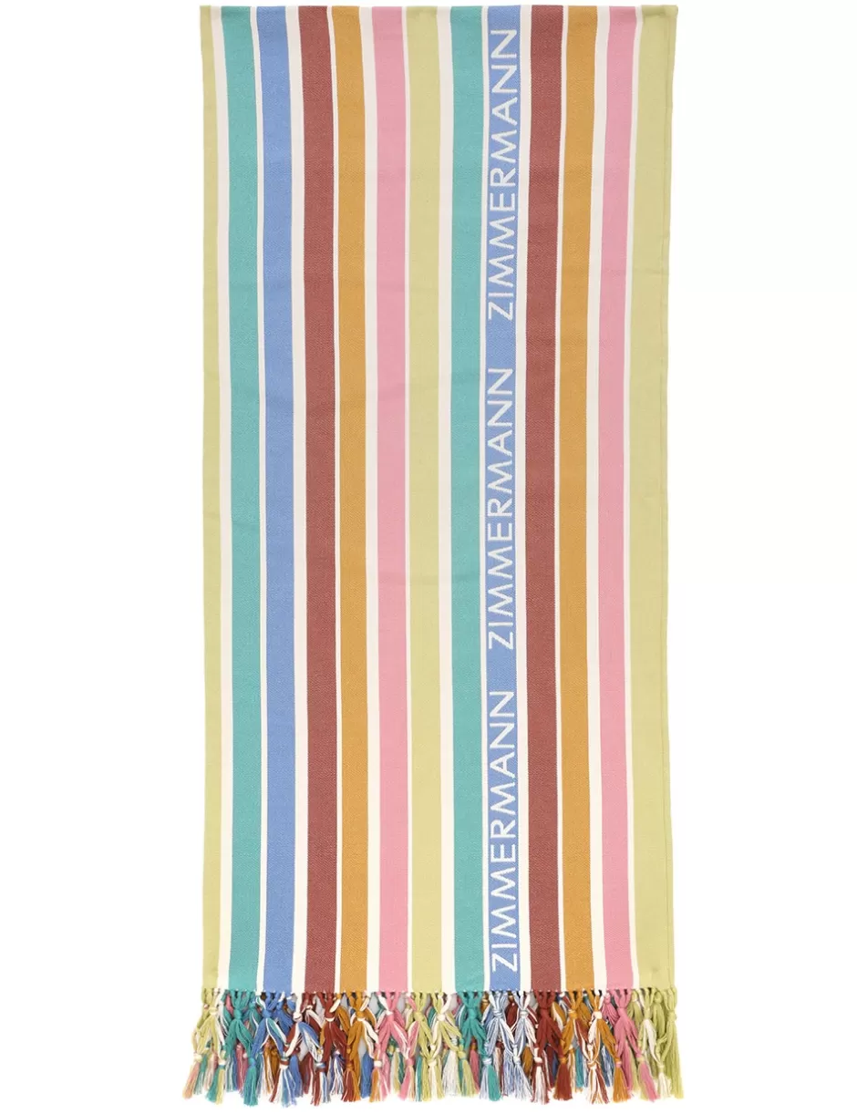 The Jacquard Stripe Towel in Multi Stripe from our Resort Swim 2025 Collection. A cotton jacquard towel with striped patterns, featuring fringed edging and branding throughout.