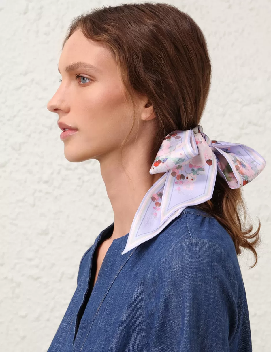 The Printed Silk Ribbon Scarf in Blue Floral from our Resort Swim 2025 Collection. A silk thin scarf featuring a contrast, custom prints.