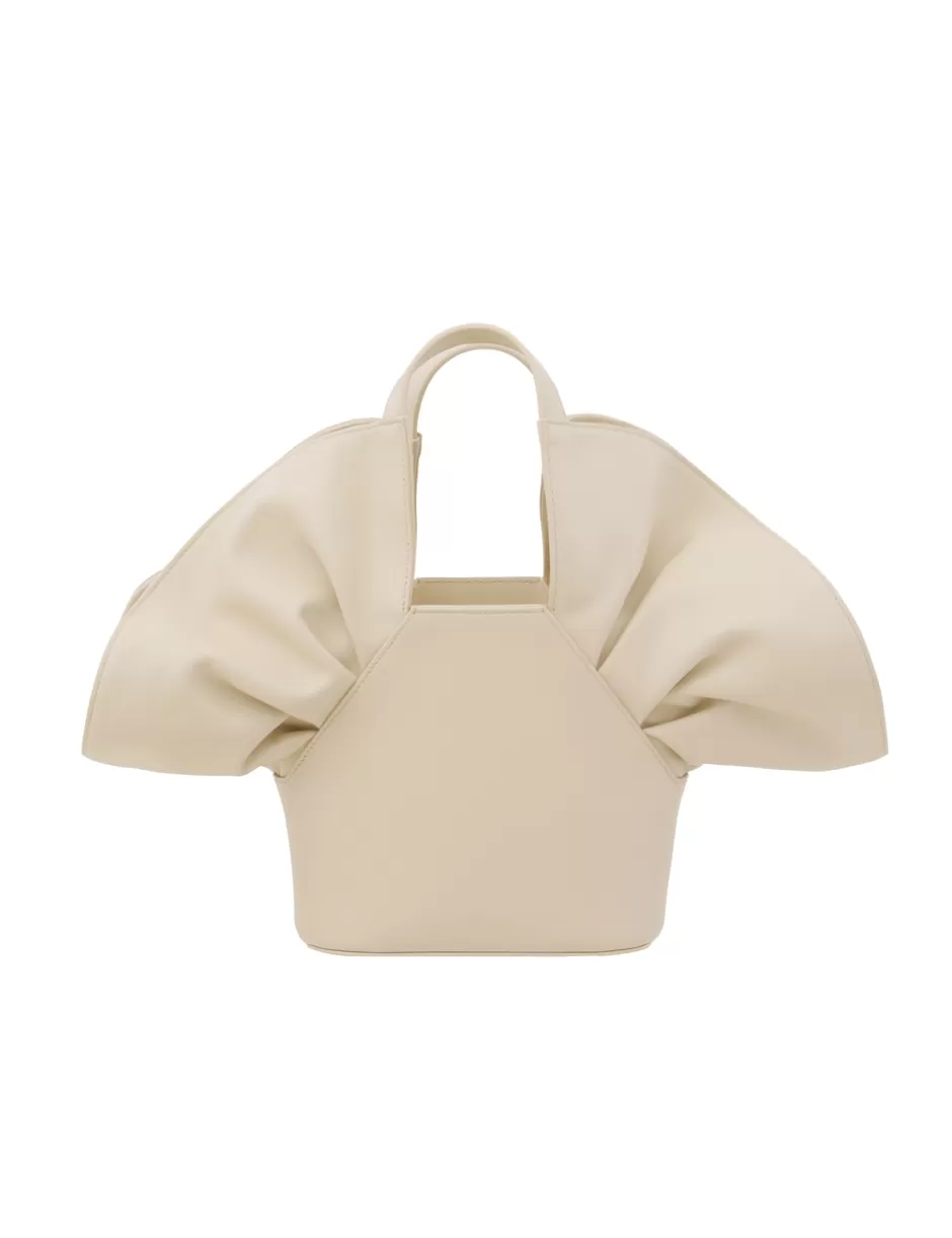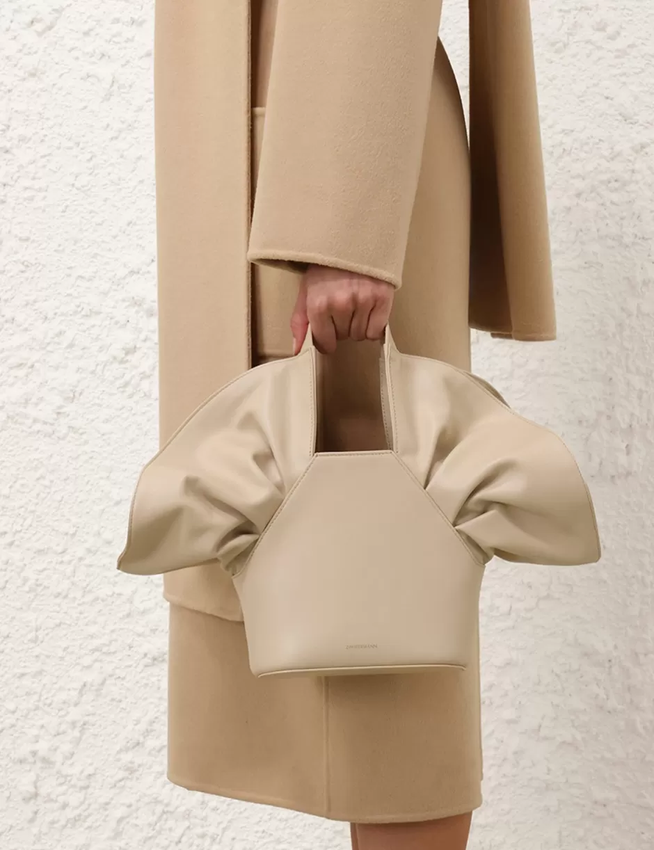 The Zimmermann Calyxe Bucket in Almond from our Fall 2024 Collection, In Illustration. A leather bucket bag with a distinctive ruffle shape, short handle, and detachable shoulder strap.