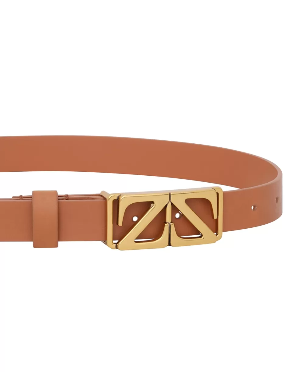 The Monogram Belt 25 in Tan from our Fall 2024 Collection, In Illustration. A leather belt featuring a custom gold double Z hardware.
