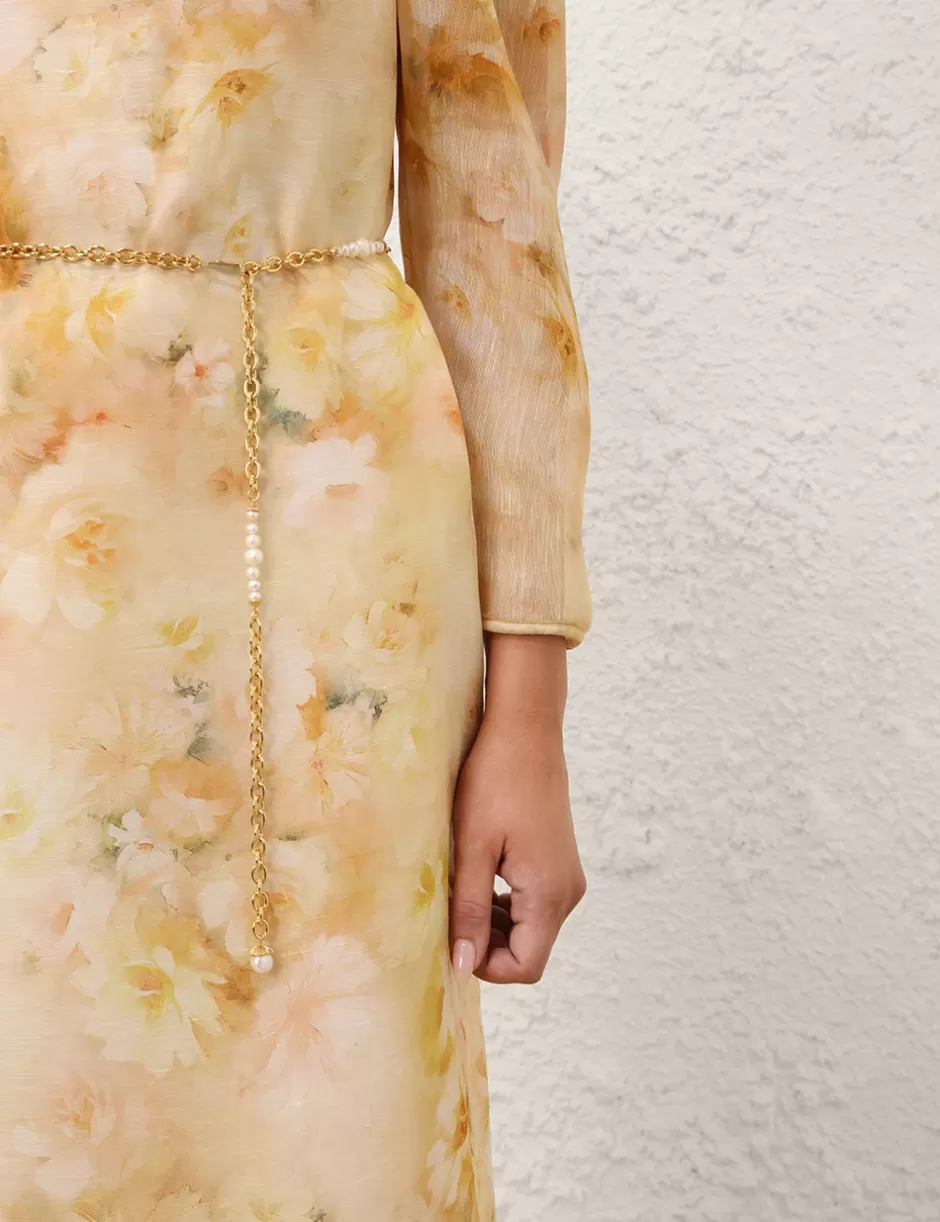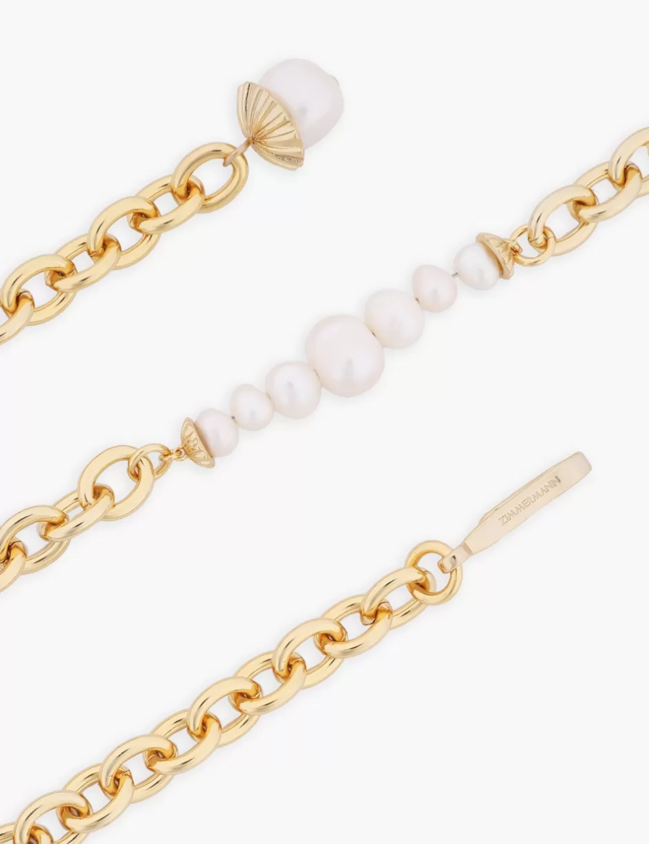The Pearl Belt in Gold/Pearl from our Resort 2025 Collection, Crush. A chain waist belt with custom pearl hardware and pearls on the toggle end.
