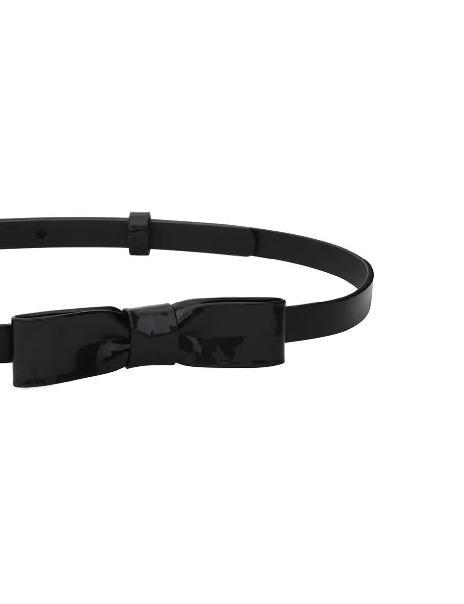 The Tux Belt 12 in Black from our Resort 2025 Collection, Crush. A skinny leather belt featuring bow detailing.