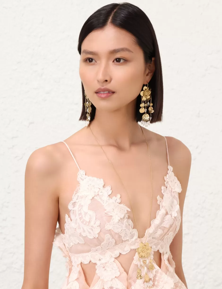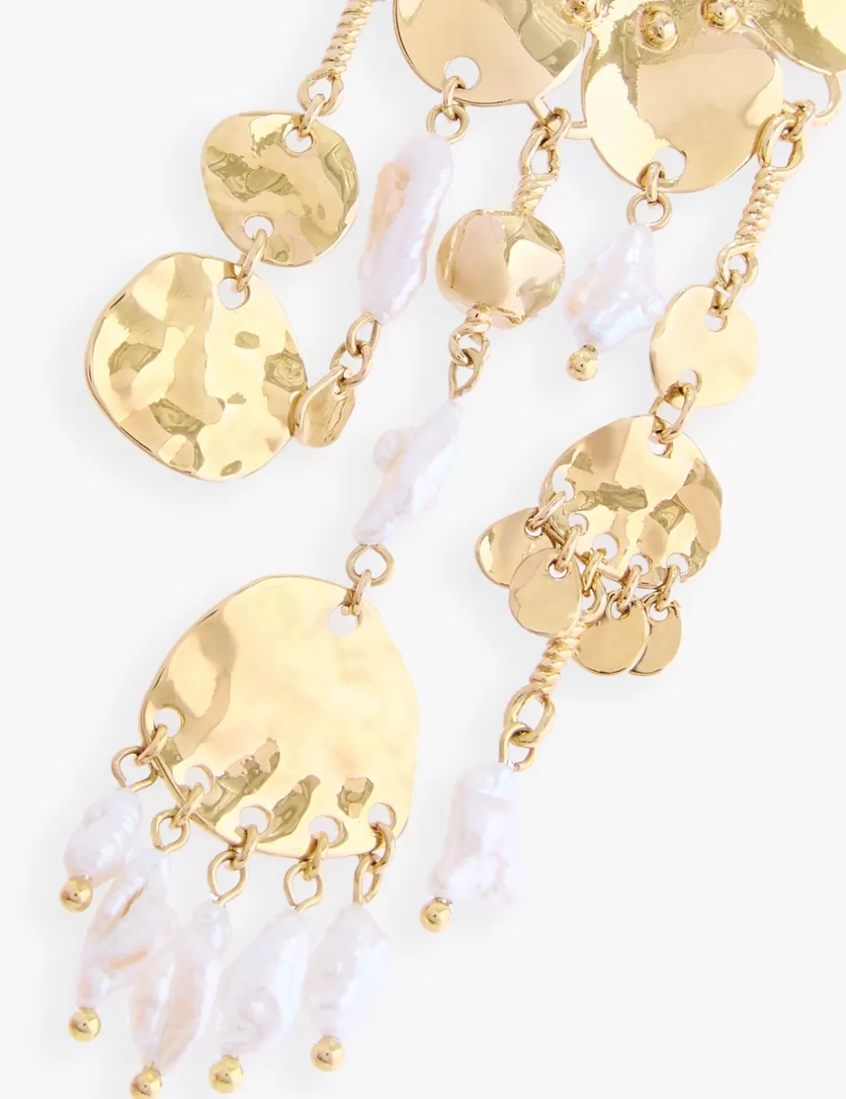 The Zimmermann Bellis Chandeliers in Gold/Pearl from our Resort 2025 Collection, Crush. A gold plated statement earring featuring fresh water pearls and a French hook clasp.