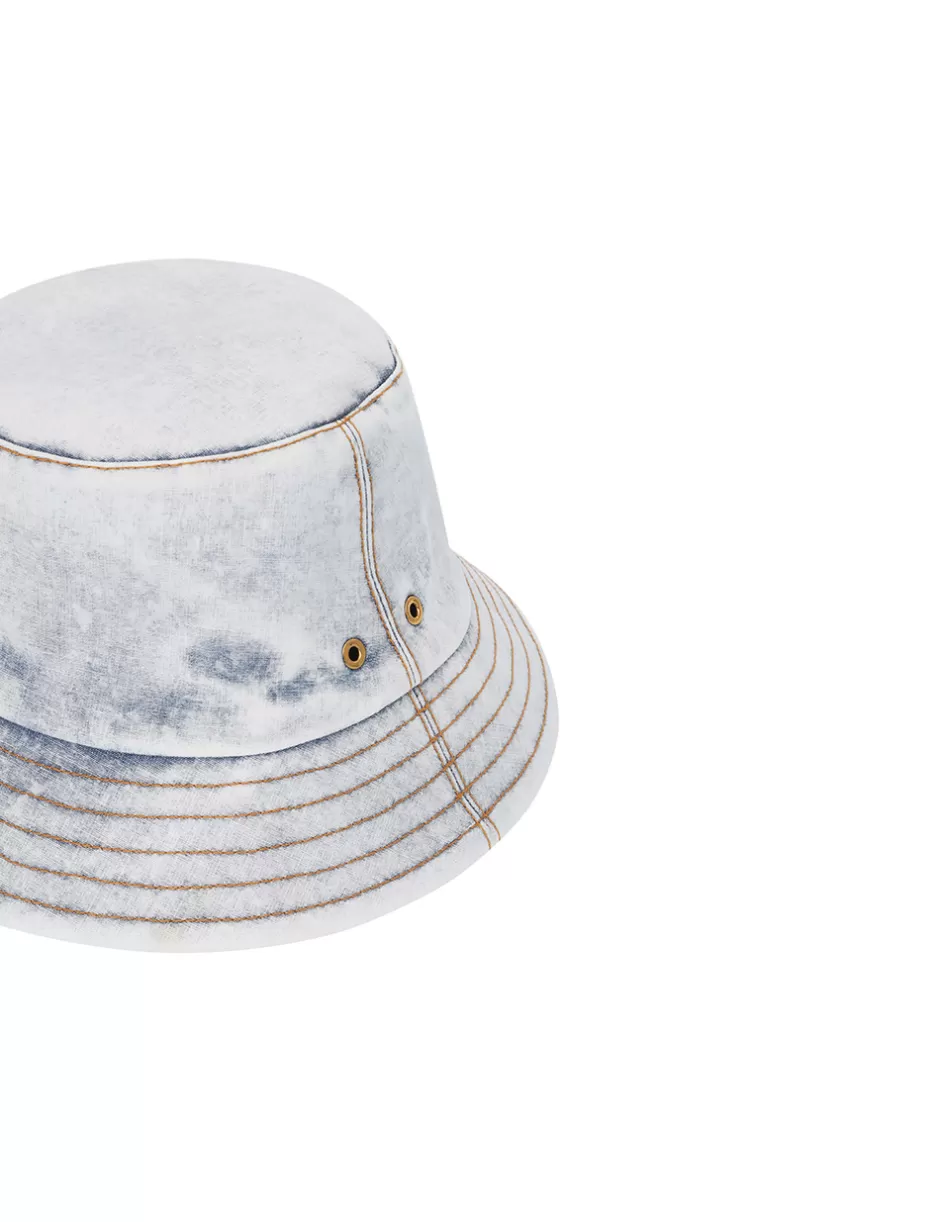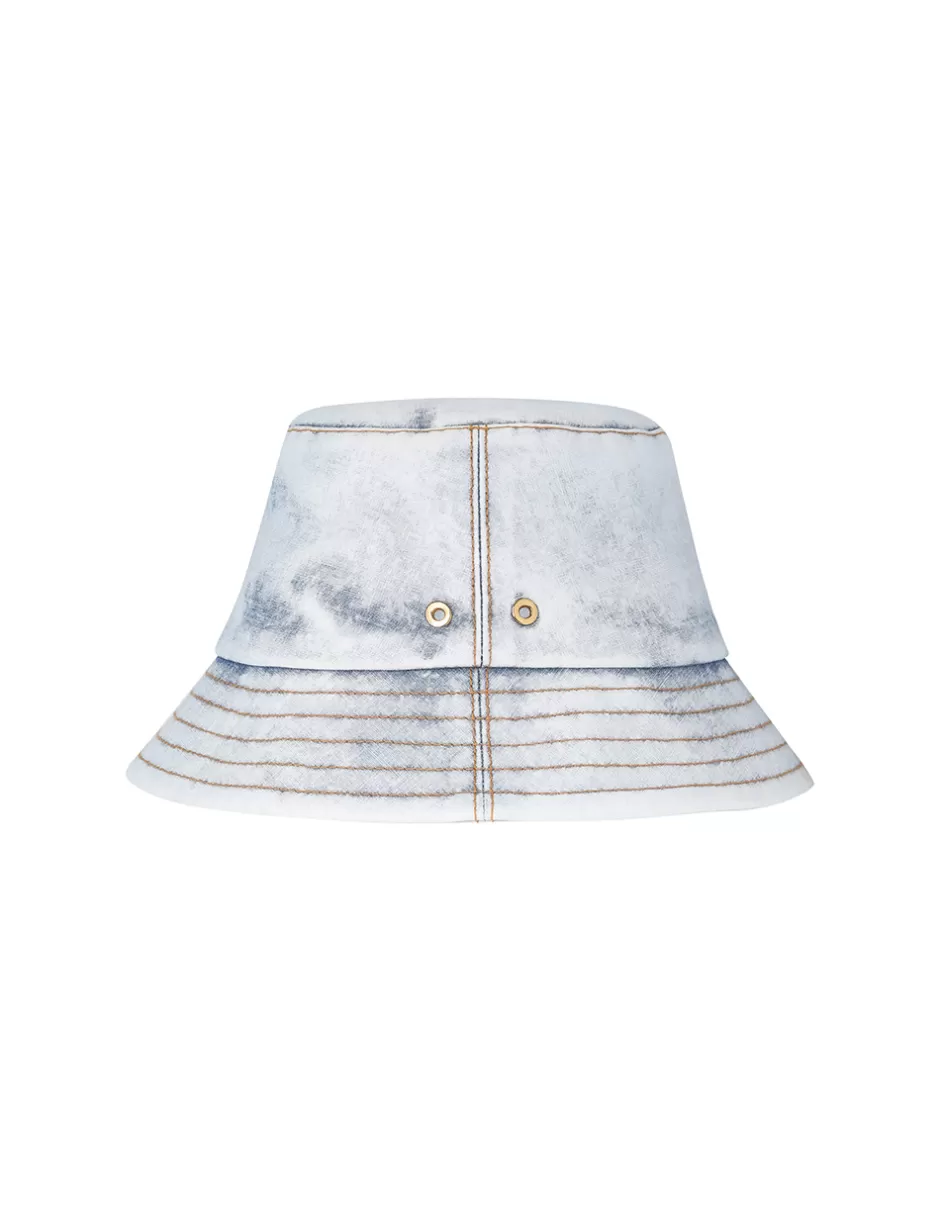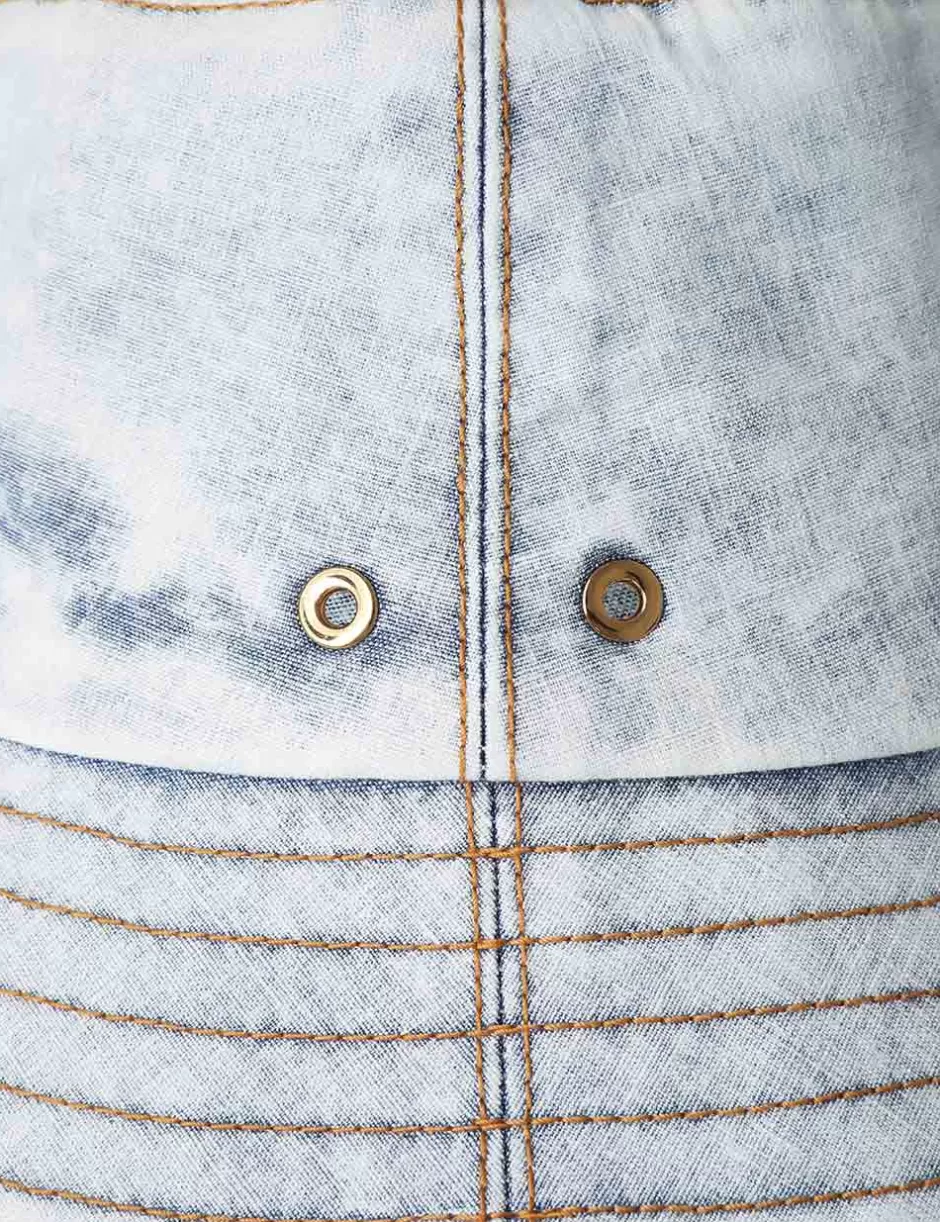 The Denim Bucket Hat in Denim from our Summer Swim 2024 Collection. A denim bucket hat featuring topstitching around the brim and ventilation in the crown.