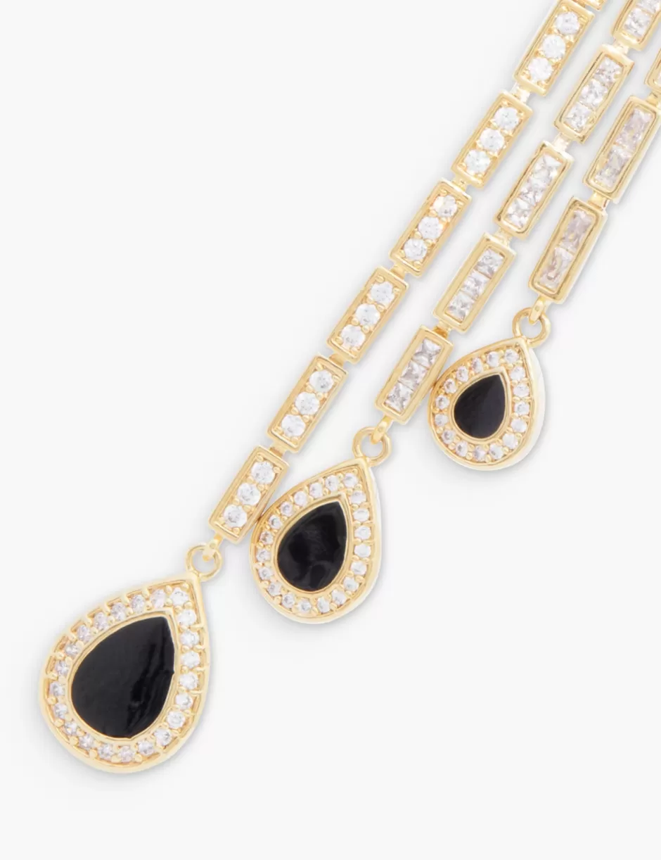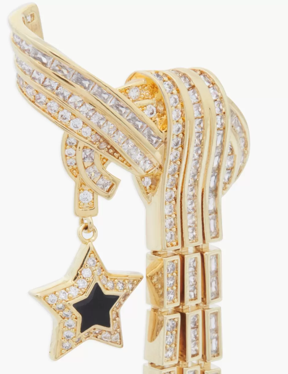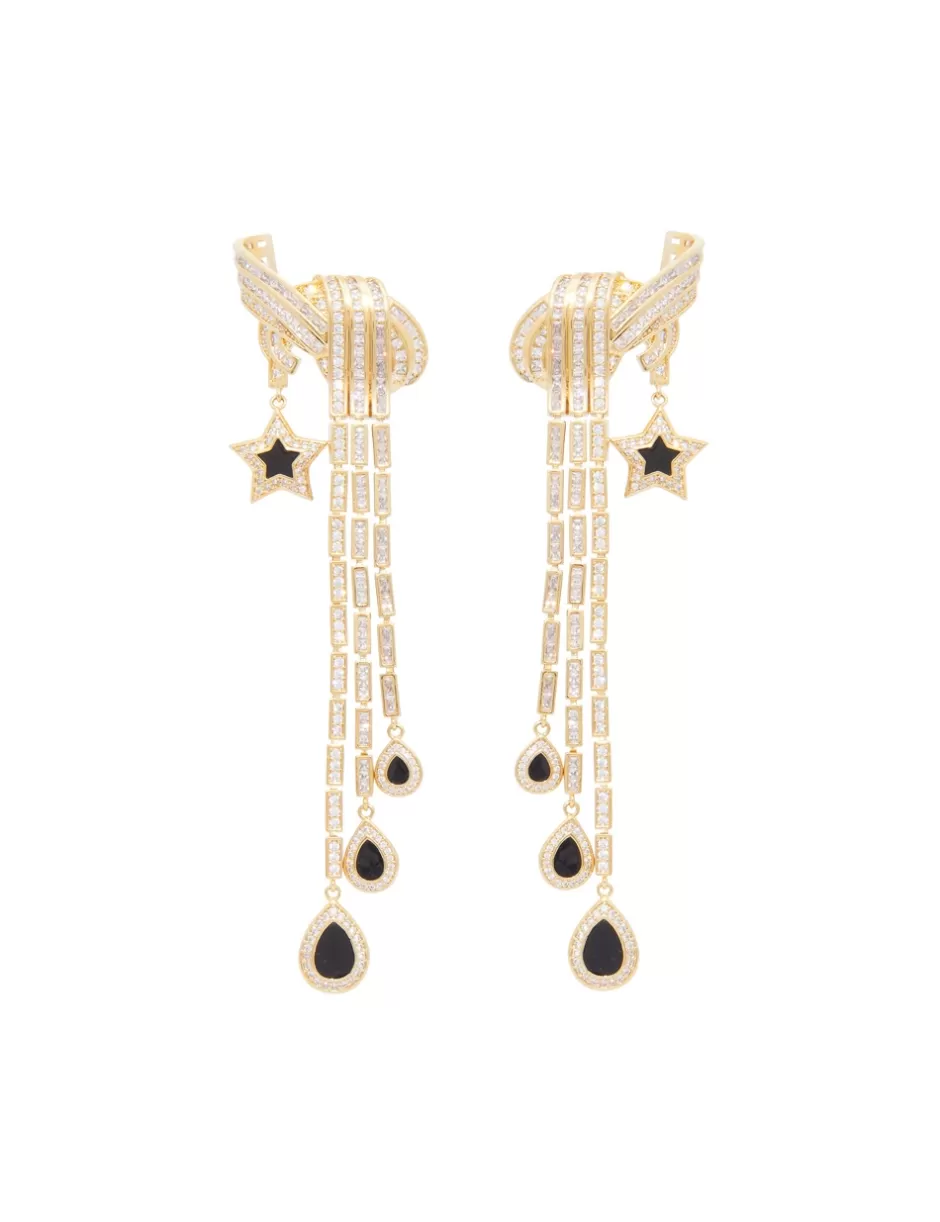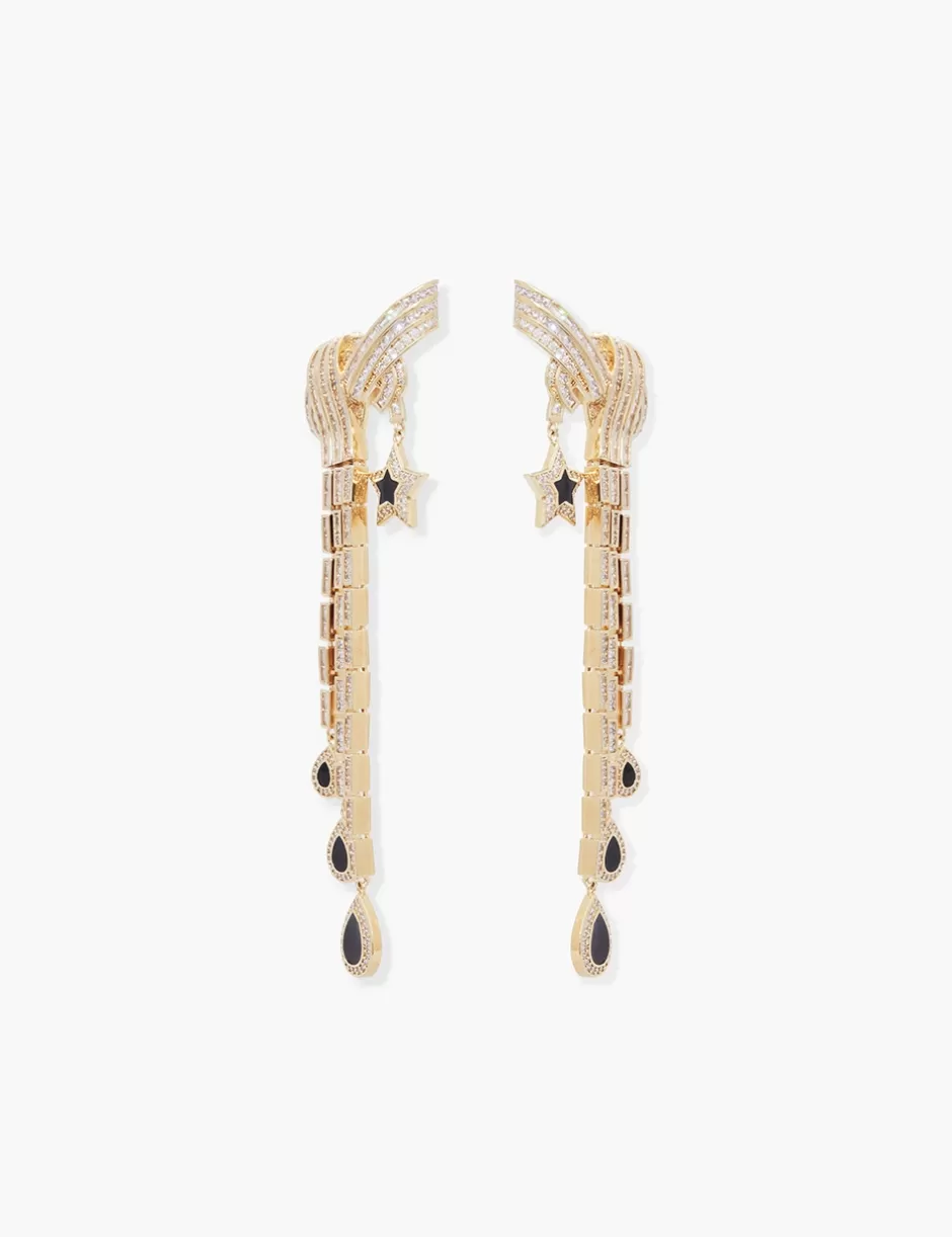 The Zimmermann Stella Drops in Gold/Black from our Fall 2024 Collection, In Illustration. A gold plated statement earring featuring white cubic zirconia stones and black enamel detailing throughout.