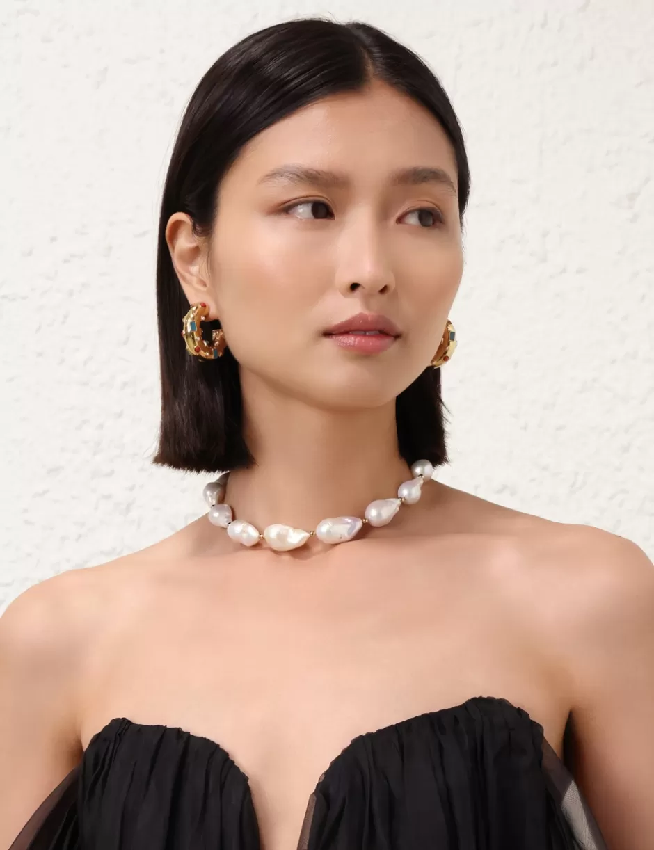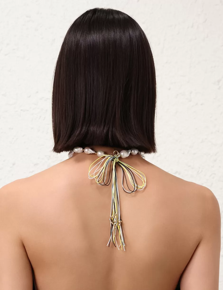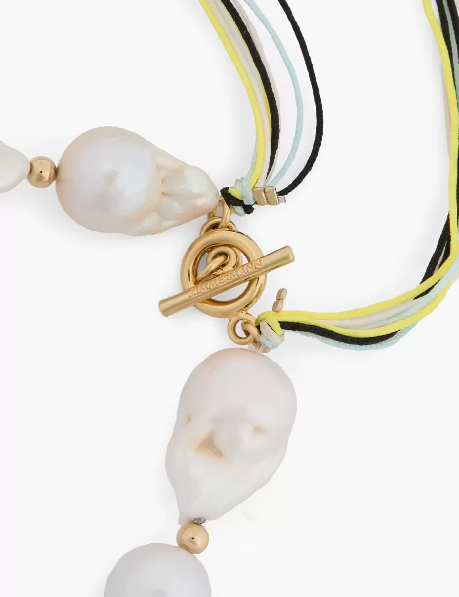The Zimmermann Wish Necklace in Gold/Pearl from our Resort 2025 Collection, Crush. A gold plated chain necklace featuring baroque pearls throughout with coloured rope detailing at the ends.