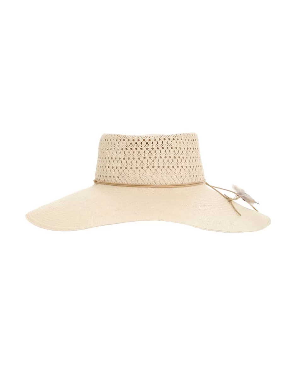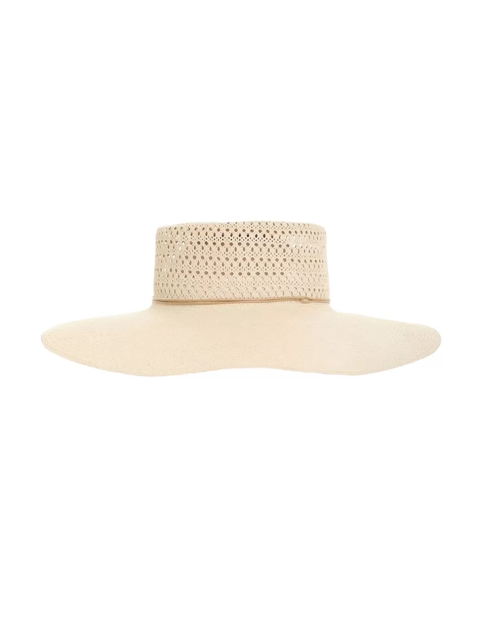 The Open Weave Crown Boater in Natural from our Summer Swim 2024 Collection. A wide brim straw hat with vents in the crown and a raw brim.