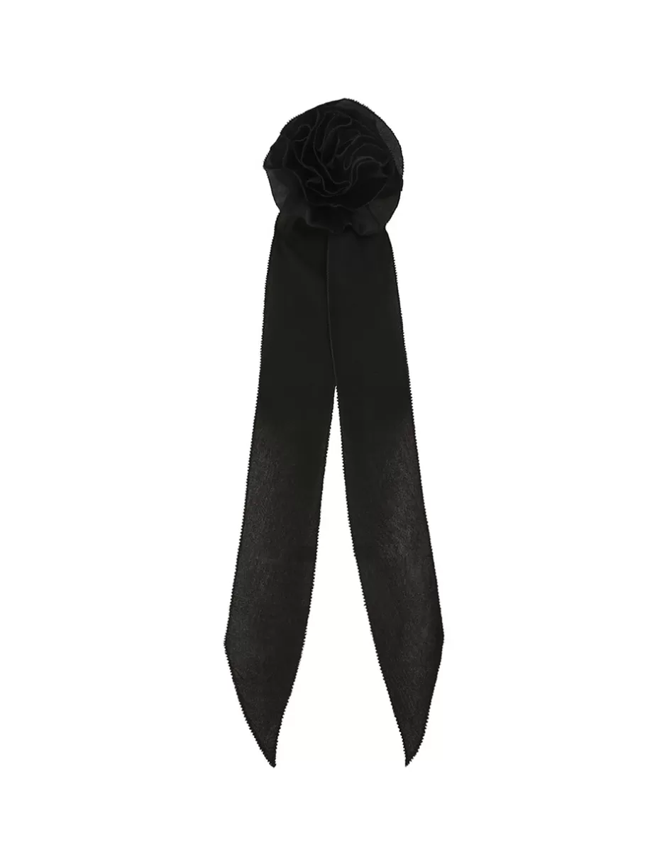 The Flower Neck Scarf in Black from our Resort 2025 Collection, Crush. A skinny scarf with a statement rose design at the front.