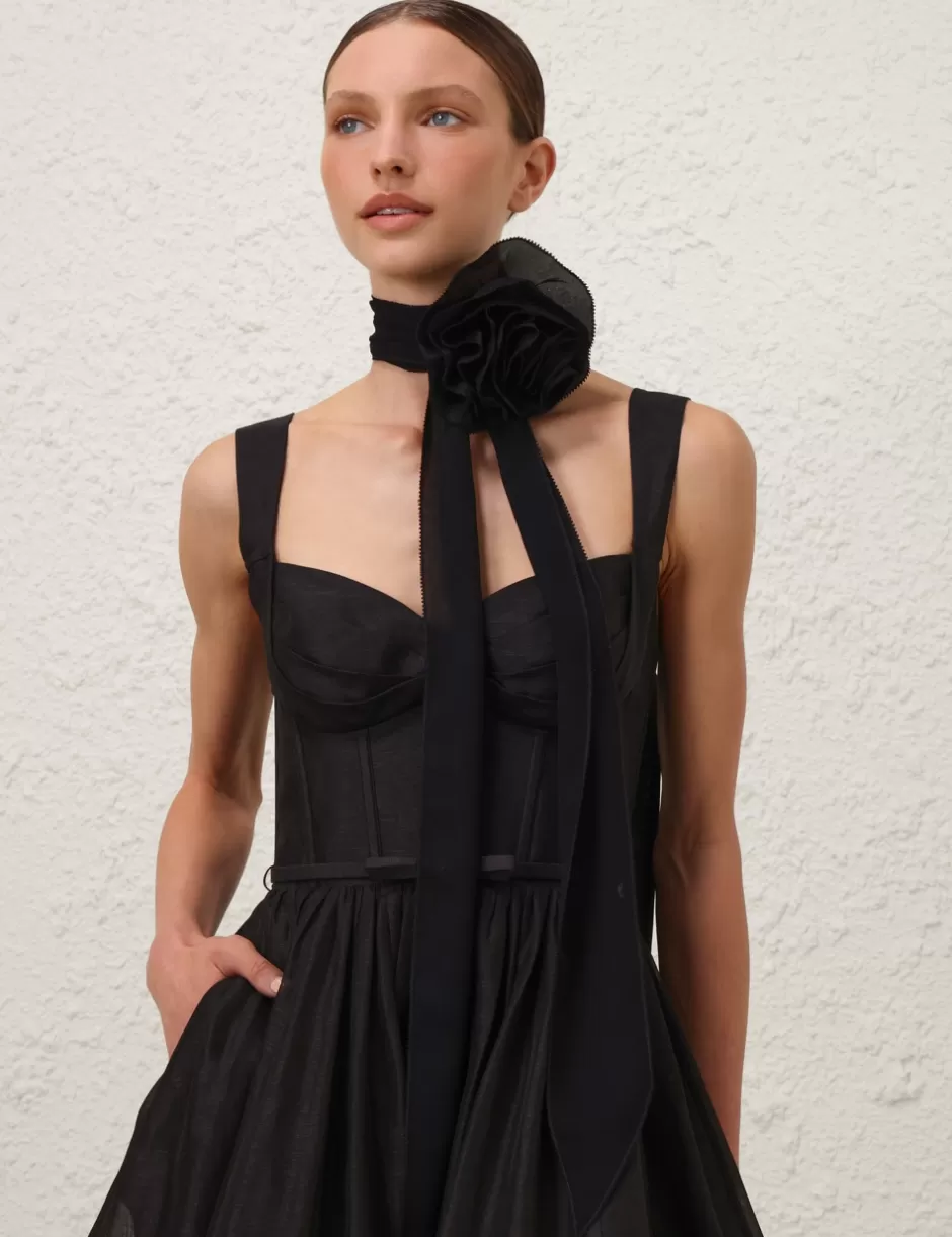 The Flower Neck Scarf in Black from our Resort 2025 Collection, Crush. A skinny scarf with a statement rose design at th…