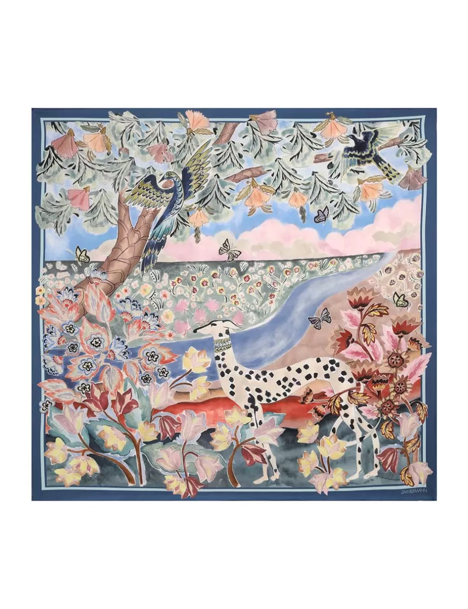 The Printed Silk Square 90 in Eden Garden from our Fall 2024 Collection, In Illustration. A silk square scarf featuring a customised placement print and fine rolled hem.