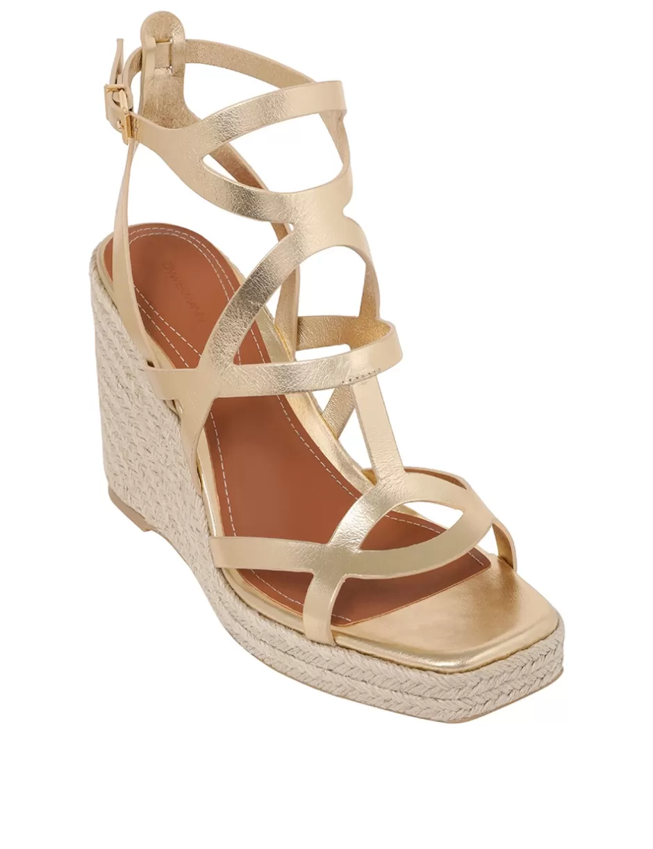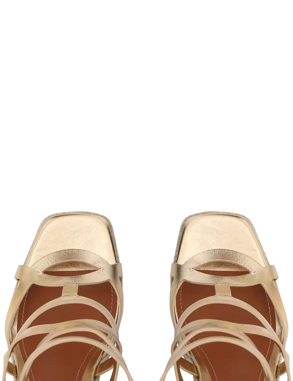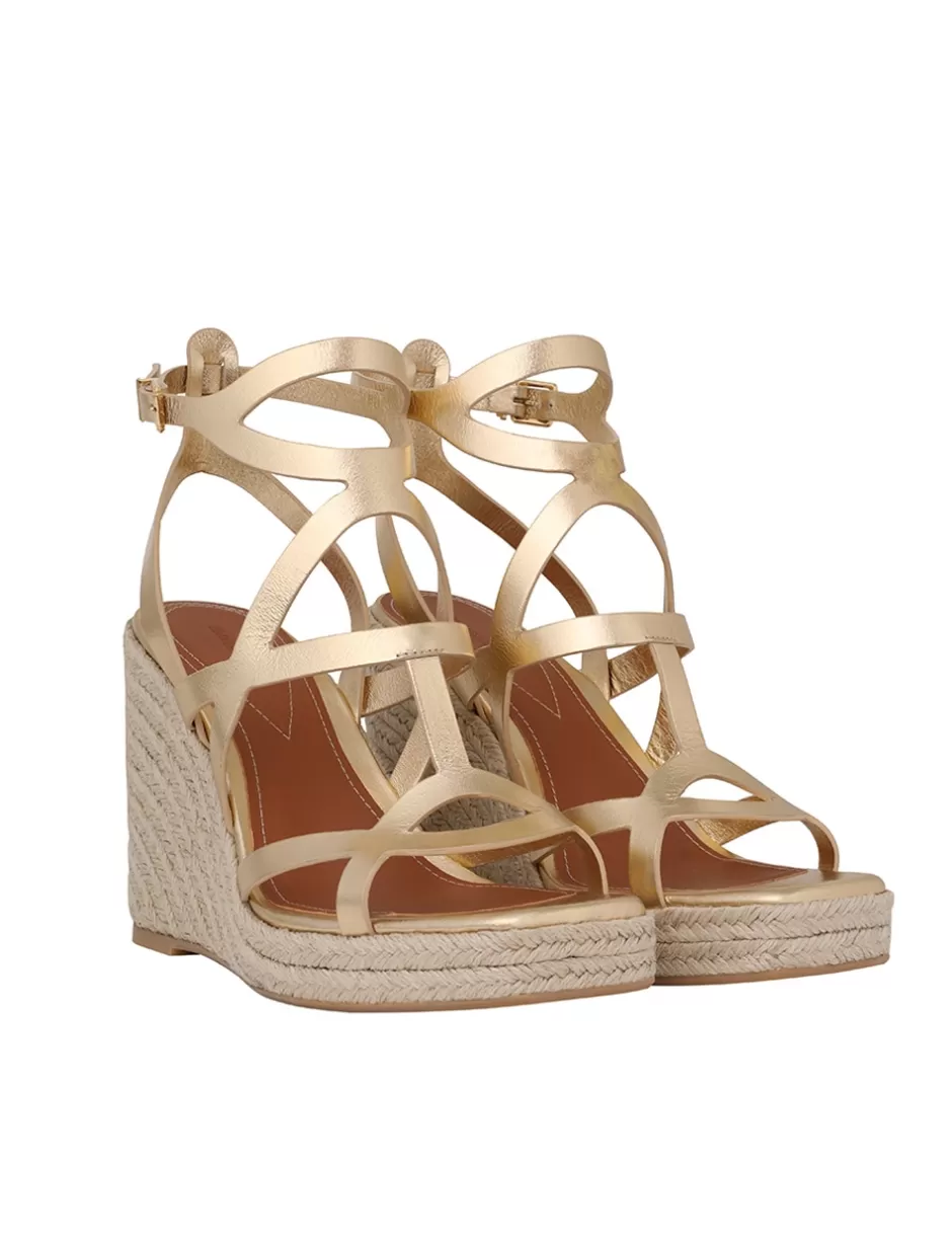 The Zimmermann Bay Espadrilles 110 in Gold from our Spring 2024 Collection, Natura. A wedge heel featuring criss-crossed metallic leather straps and a buckle ankle fastening.