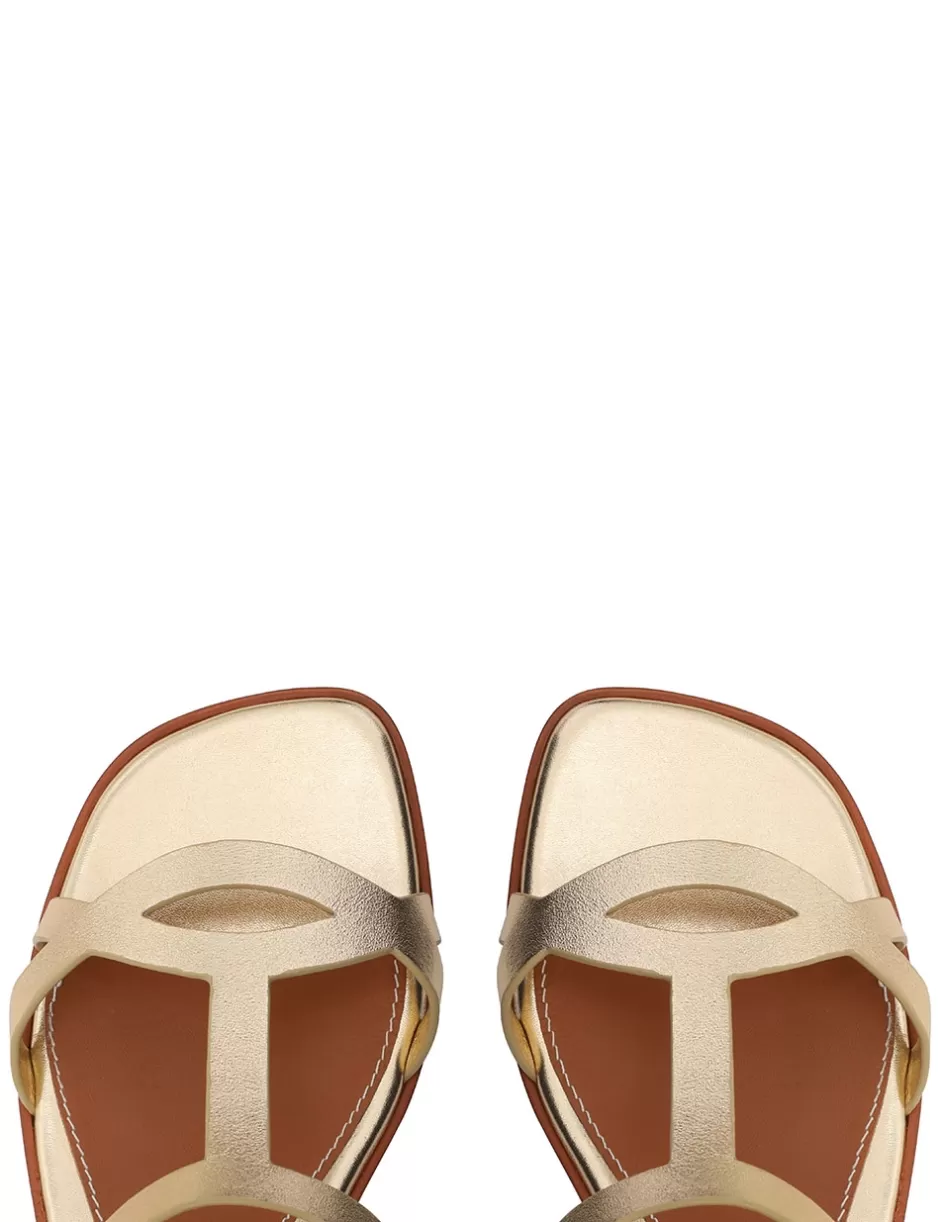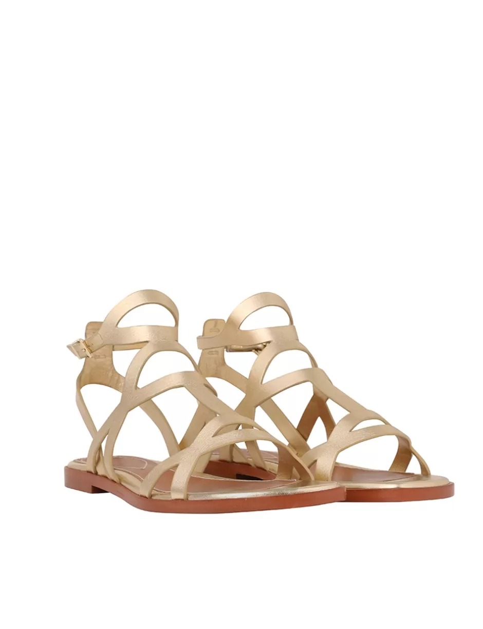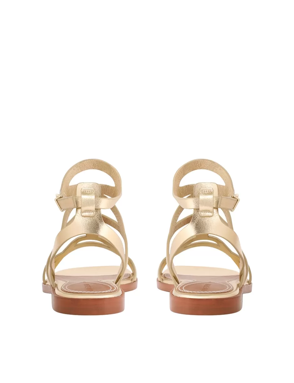 The Zimmermann Bay Sandal in Gold from our Spring 2024 Collection, Natura. A leather sandal featuring criss-crossed straps and a buckle ankle fastening.
