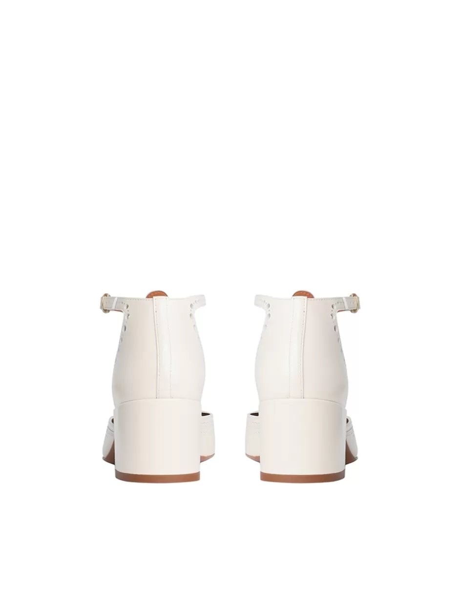 The Zimmermann Eliot Pump 50 in Almond from our Fall 2024 Collection, In Illustration. A leather pump heel featuring a T-bar detail.