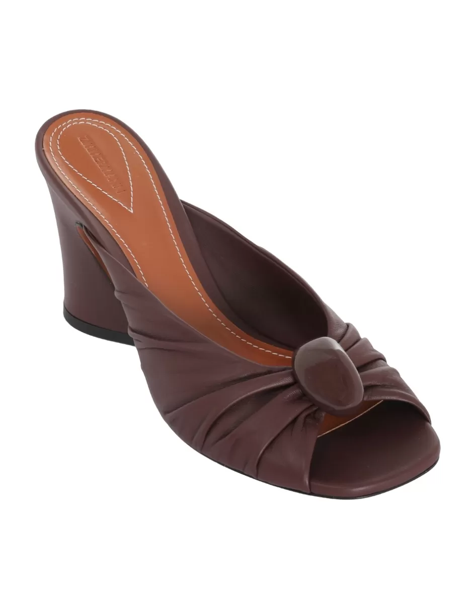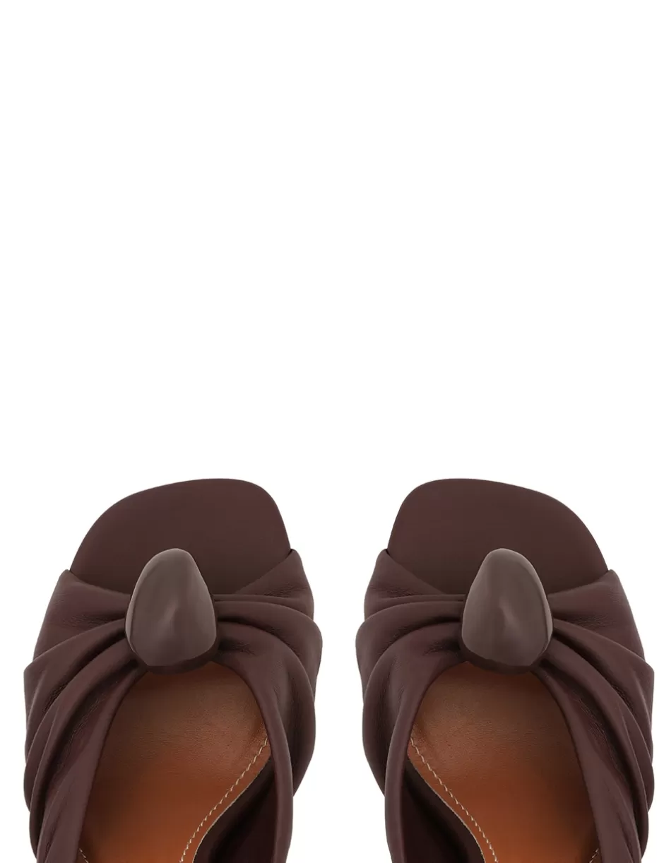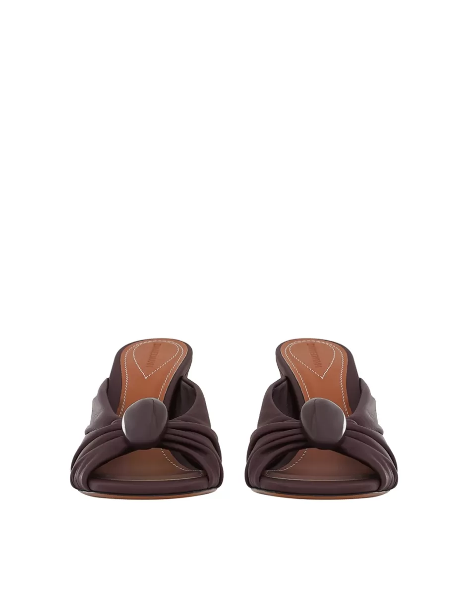 The Zimmermann Gleam Mule 85 in Bordeaux from our Fall 2024 Collection, In Illustration. A leather mule featuring heavy gathering at the front shoe with a statement pebble hardware design.