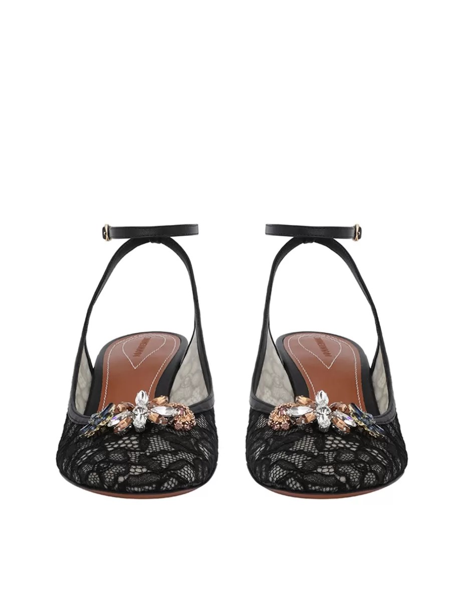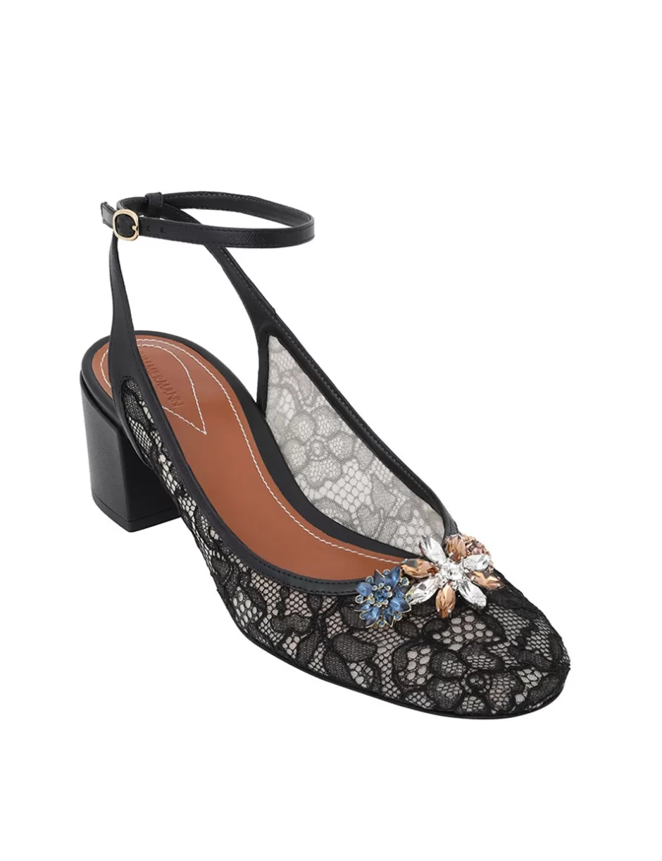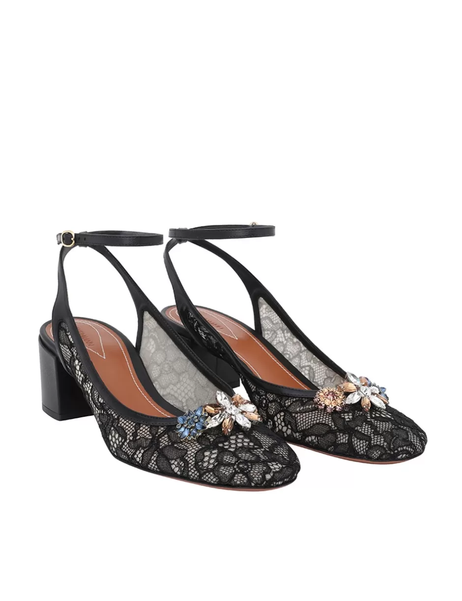 The Zimmermann Pixie Mary Jane 50 in Black from our Resort 2025 Collection, Crush. A lace Mary Jane shoe featuring jewel flower detailing at the front and an ankle strap.