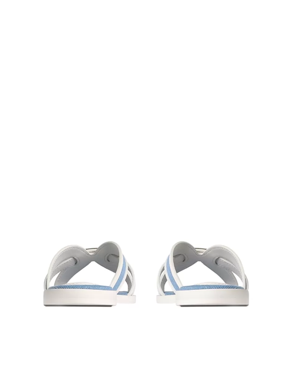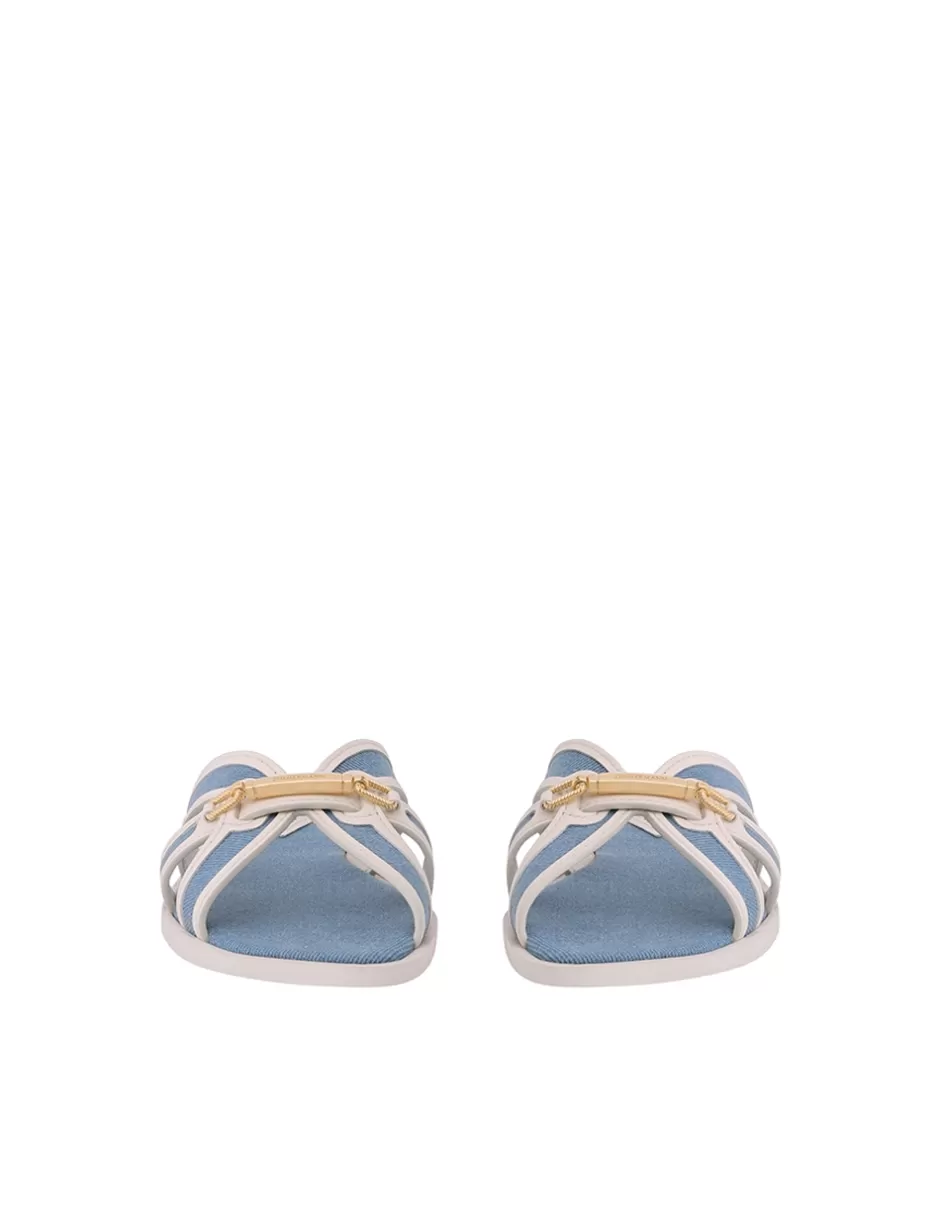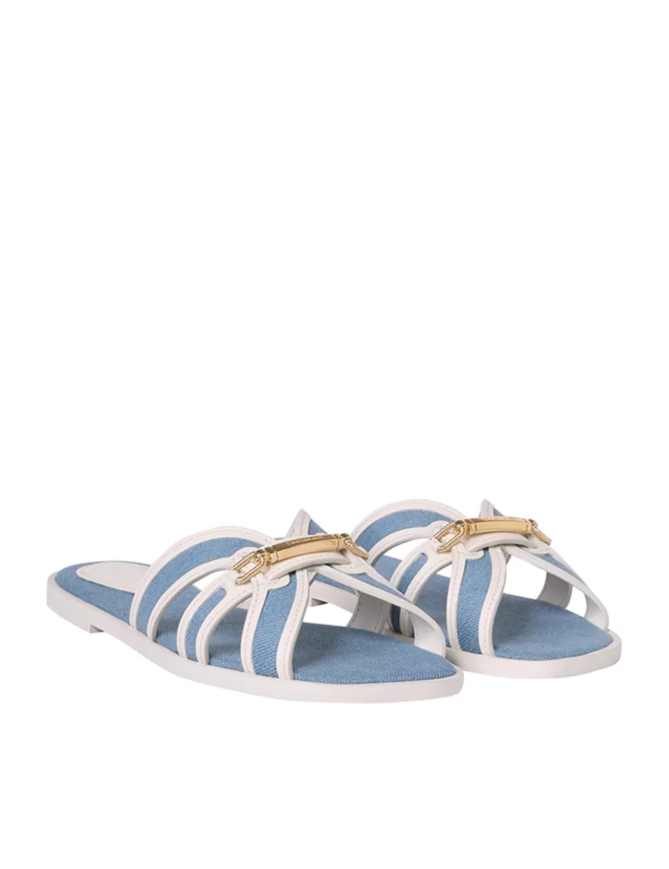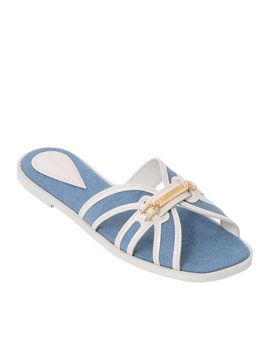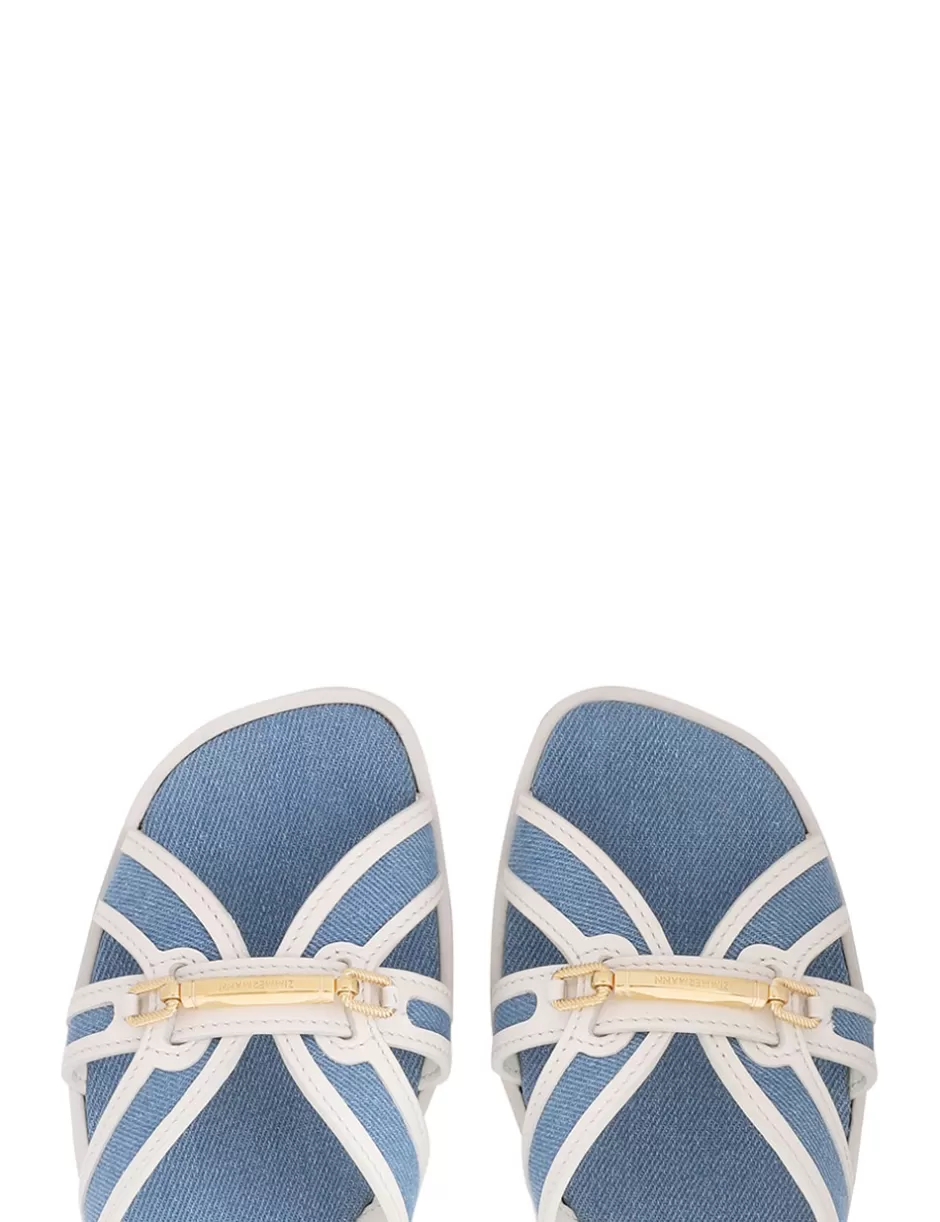 The Zimmermann Prisma Slide in Denim from our Spring 2024 Collection, Natura. A leather slide sandal featuring contrast denim throughout and ZIMMERMANN branded hardware.