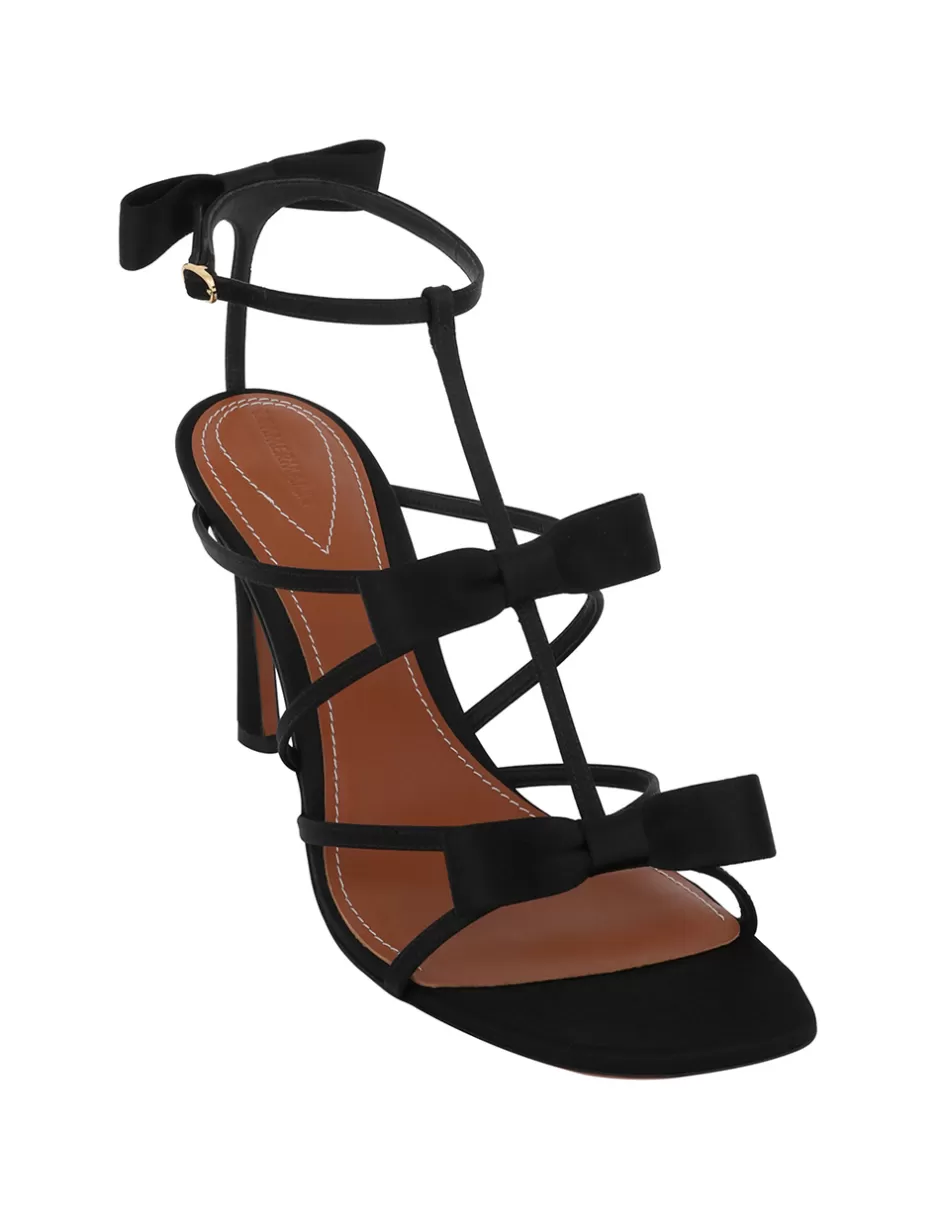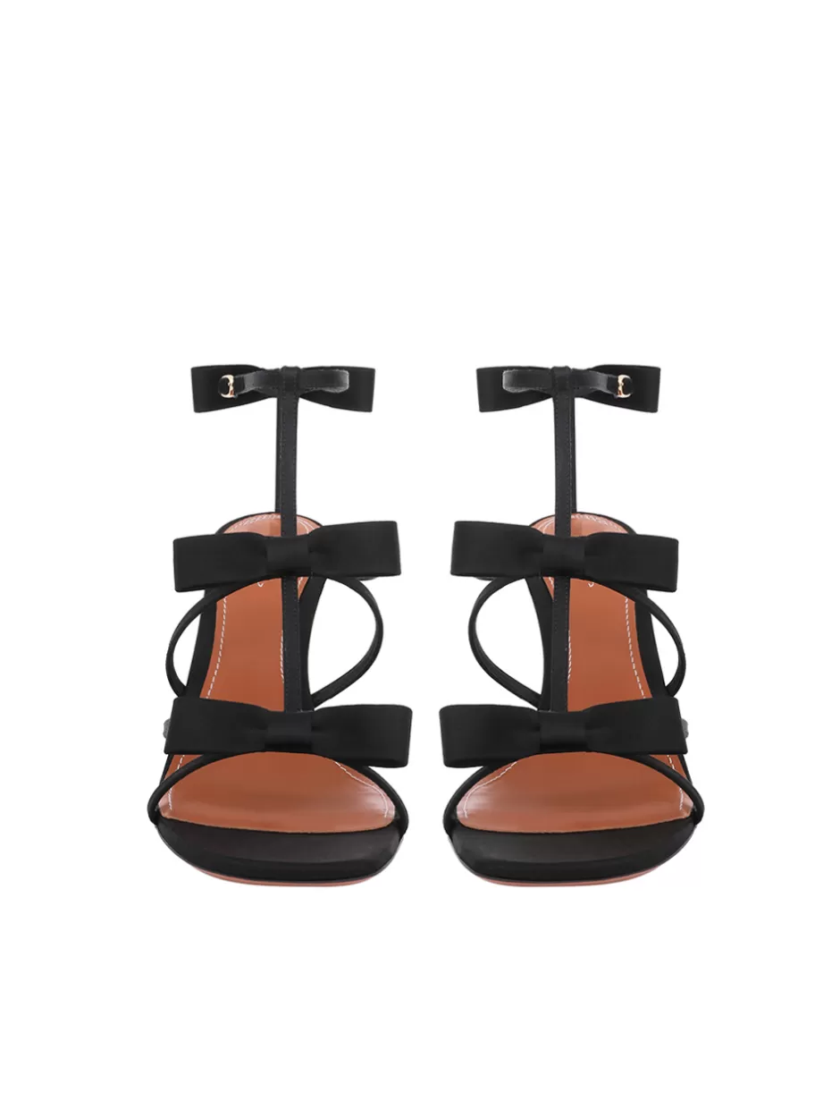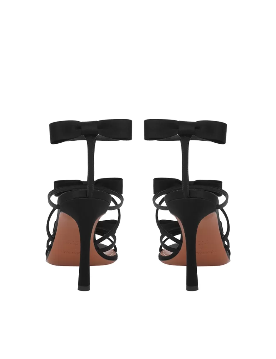 The Zimmermann Tux Sandal 85 in Black from our Resort 2025 Collection, Crush. A satin leather heeled sandal featuring statement bow details at both the front and back, along with a T-bar design.