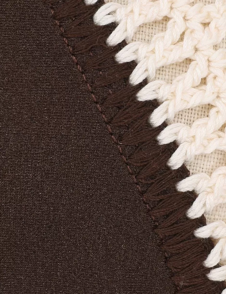 The Acacia Crochet Tri Bikini in Chocolate from our Resort Swim 2025 Collection. A crochet lycra bikini set featuring crochet edging and self tie straps with toggle ends.