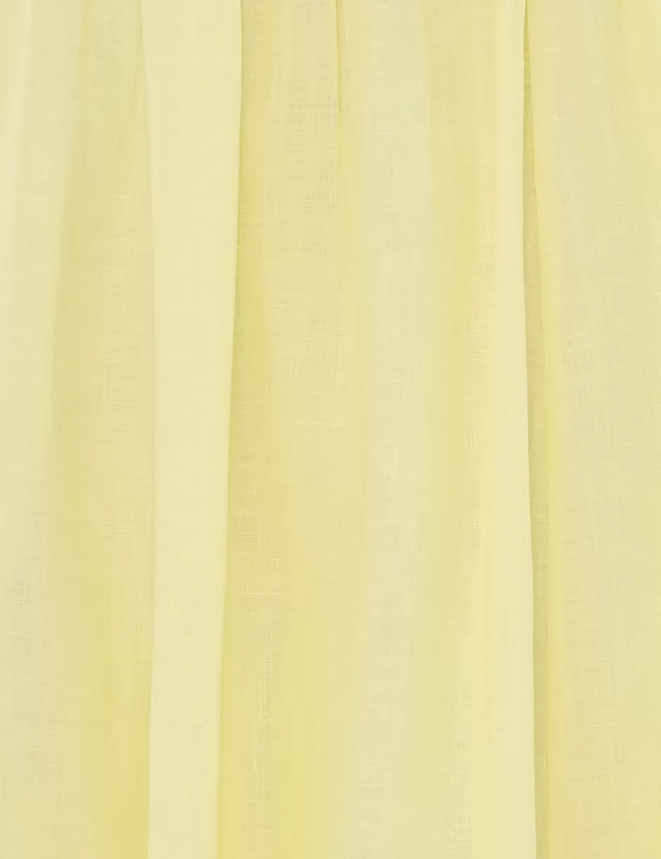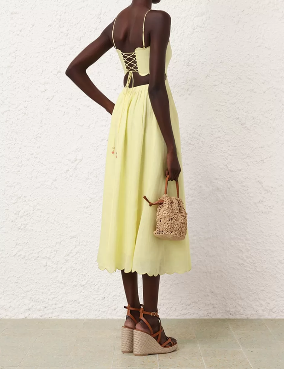The Halliday Scallop Midi Dress in Yellow from our Summer Swim 2024 Collection. A linen midi dress featuring waist cut outs, side seam pockets and lace up back bodice, finished with embroidered scalloped edging throughout.