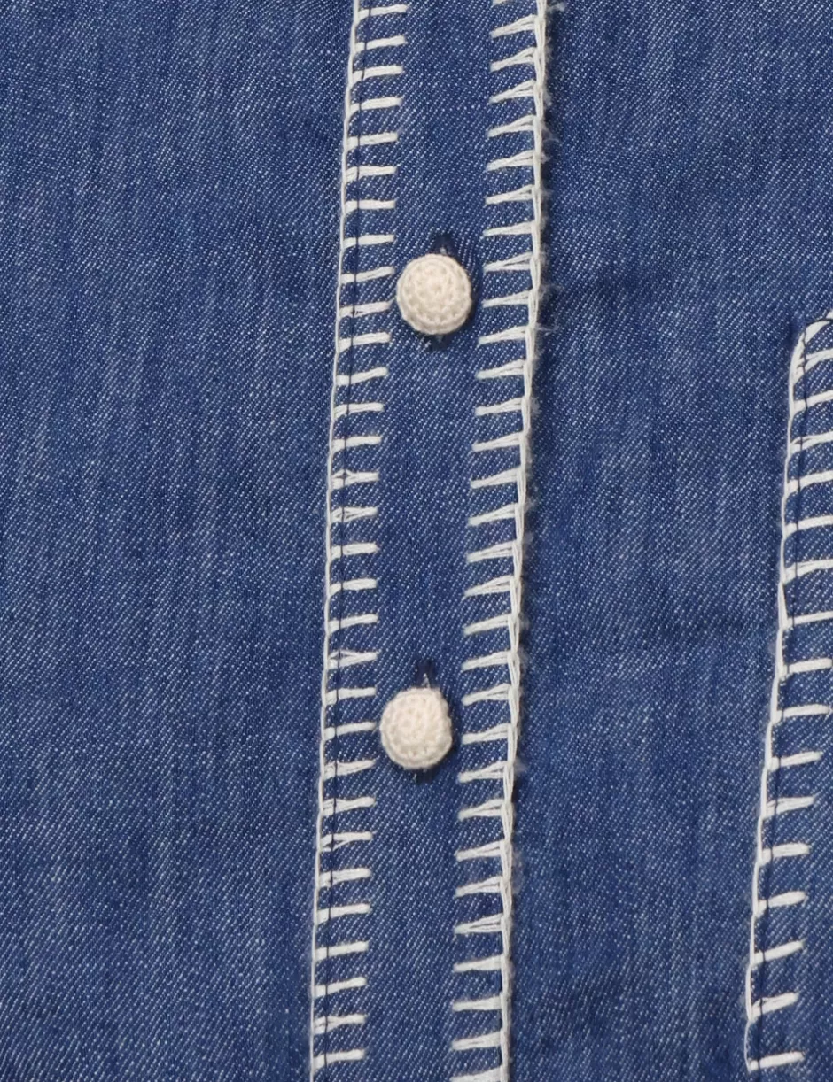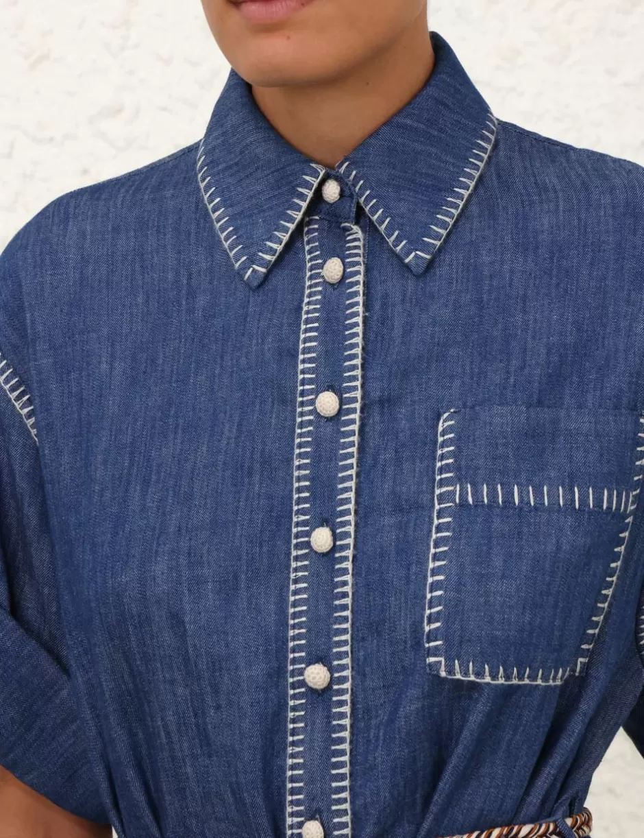 The Denim Shirt Dress in Railway Blue from our Summer Swim 2024 Collection. A mini shirt dress featuring a classic collar, buttons down the centre front and short cuffed sleeves, finished with a patch pocket on the chest and side pockets.