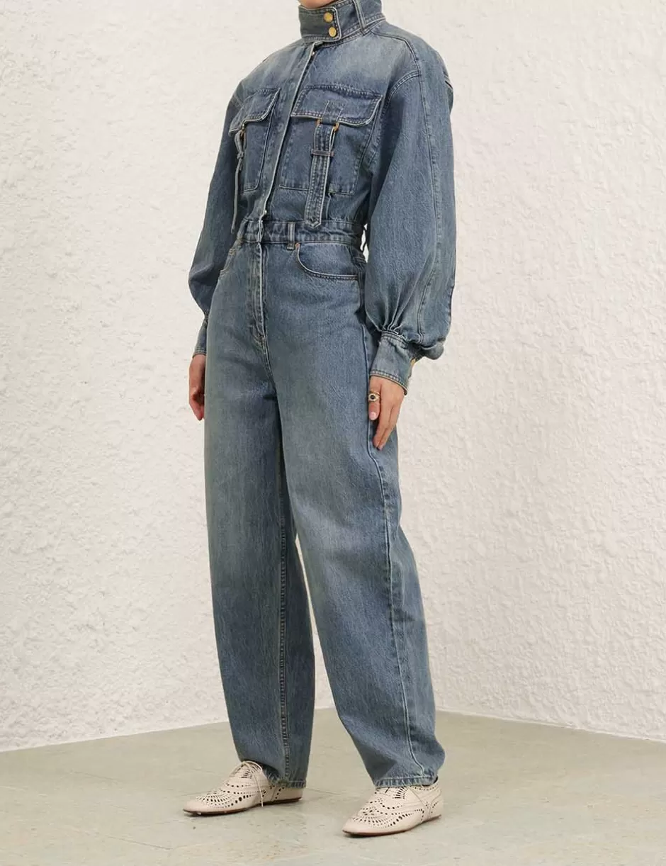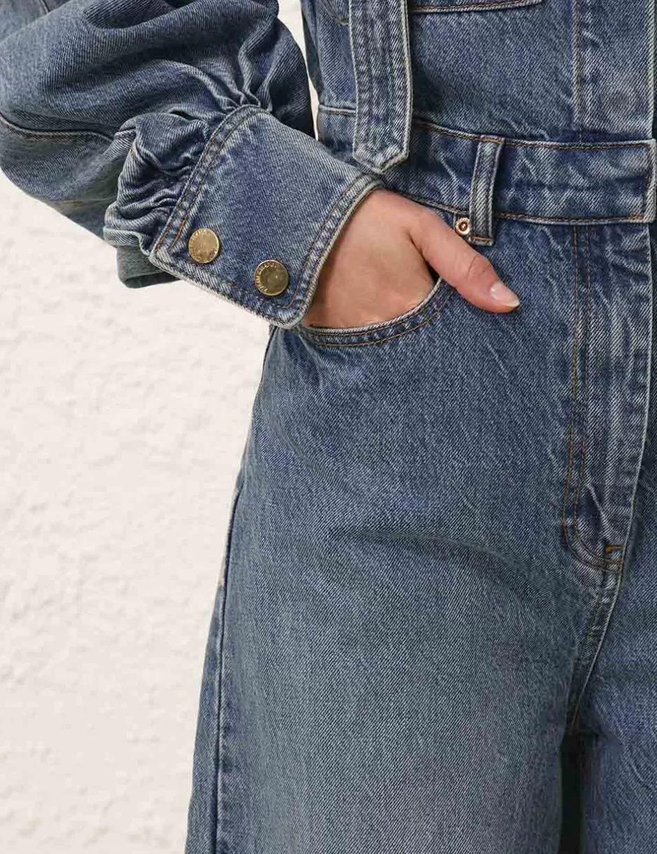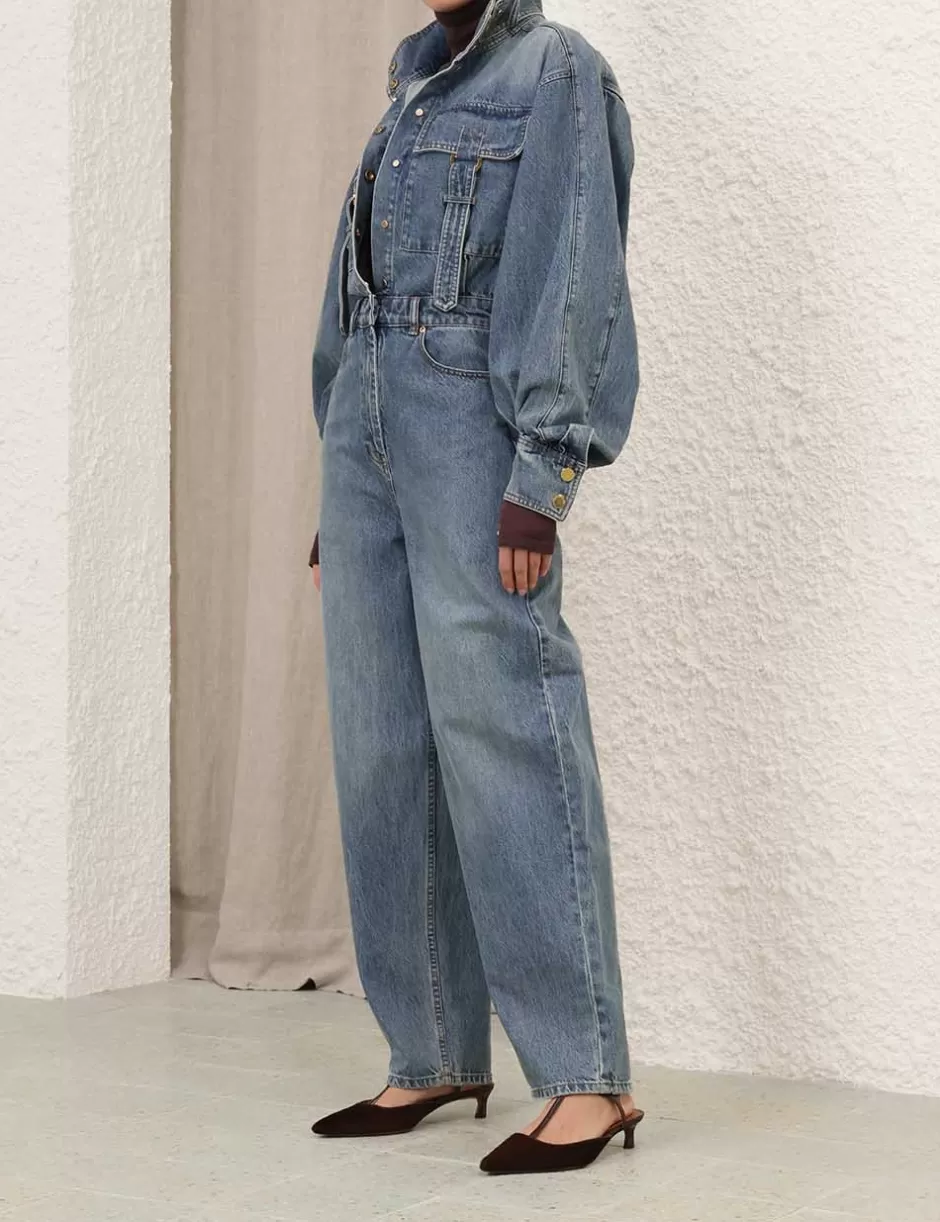 The Illustration Denim Boilersuit in Neptune from our Fall 2024 Collection, In Illustration. A denim boilersuit featuring a high collar with a removable strap, concealed snaps down the centre front and long blouson sleeves with a visible snap on the cuff.