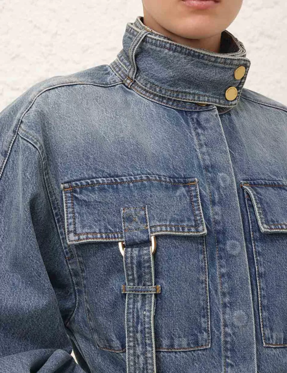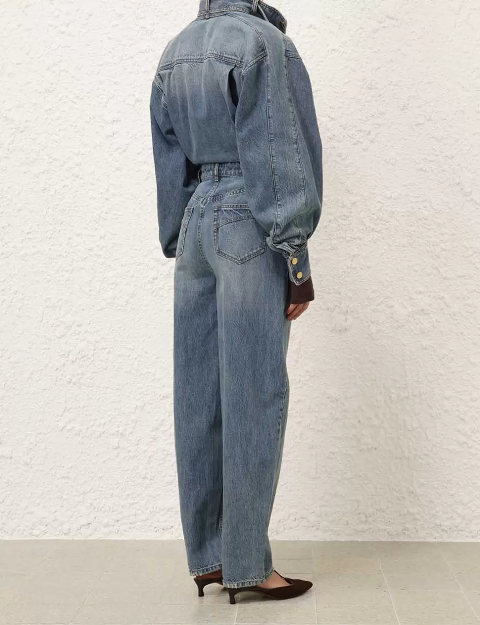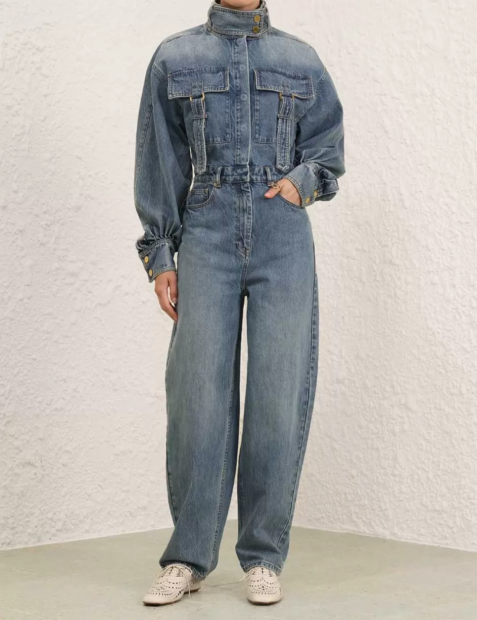 The Illustration Denim Boilersuit in Neptune from our Fall 2024 Collection, In Illustration. A denim boilersuit featuring a high collar with a removable strap, concealed snaps down the centre front and long blouson sleeves with a visible snap on the cuff.