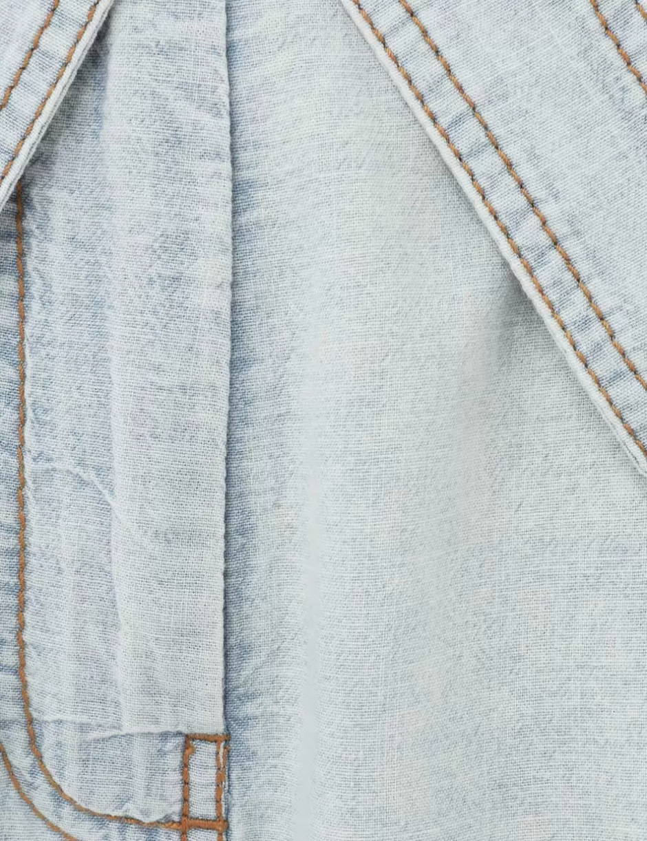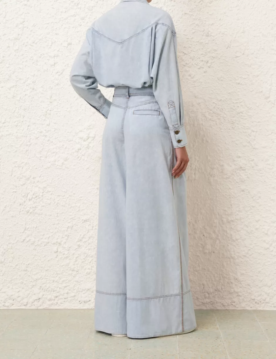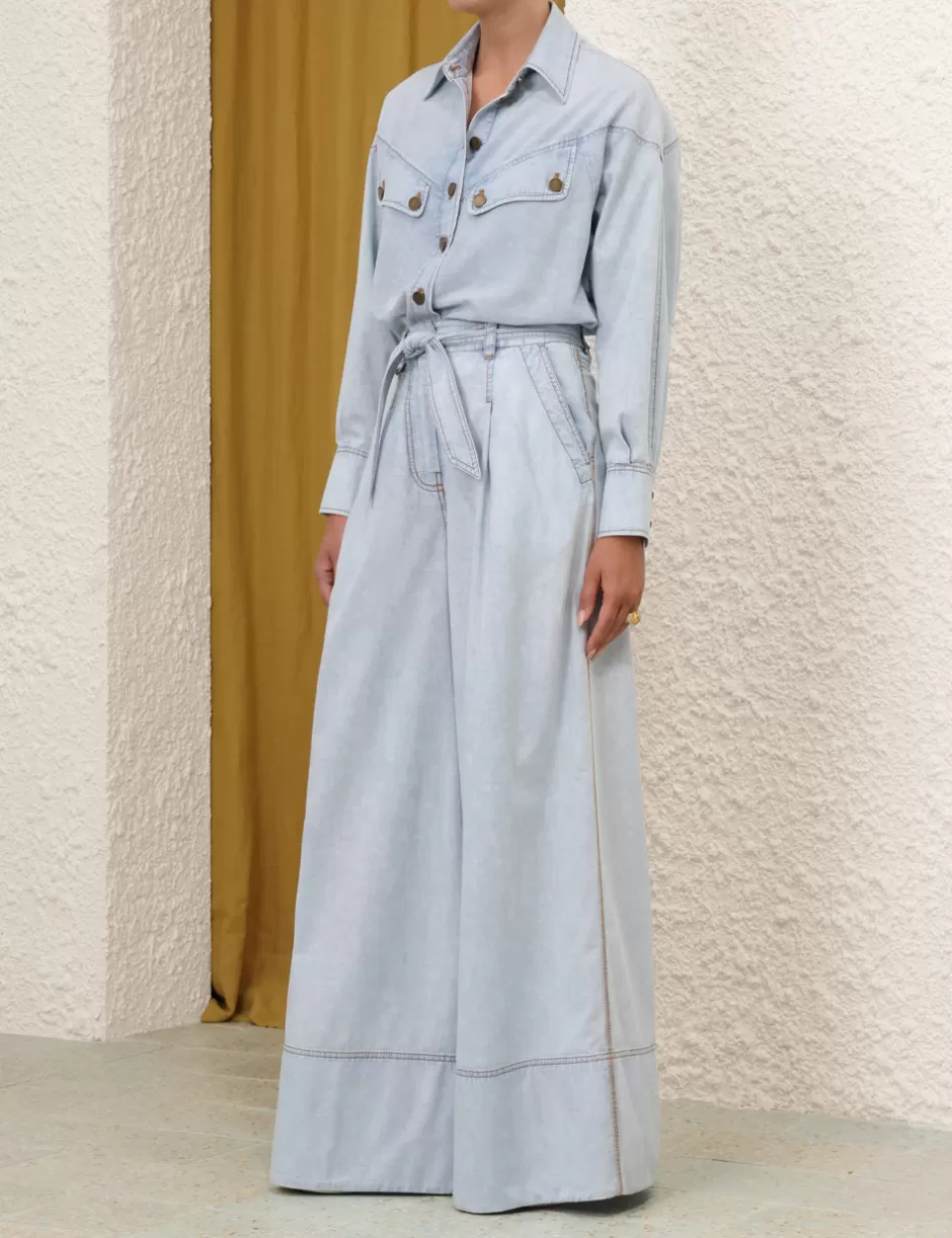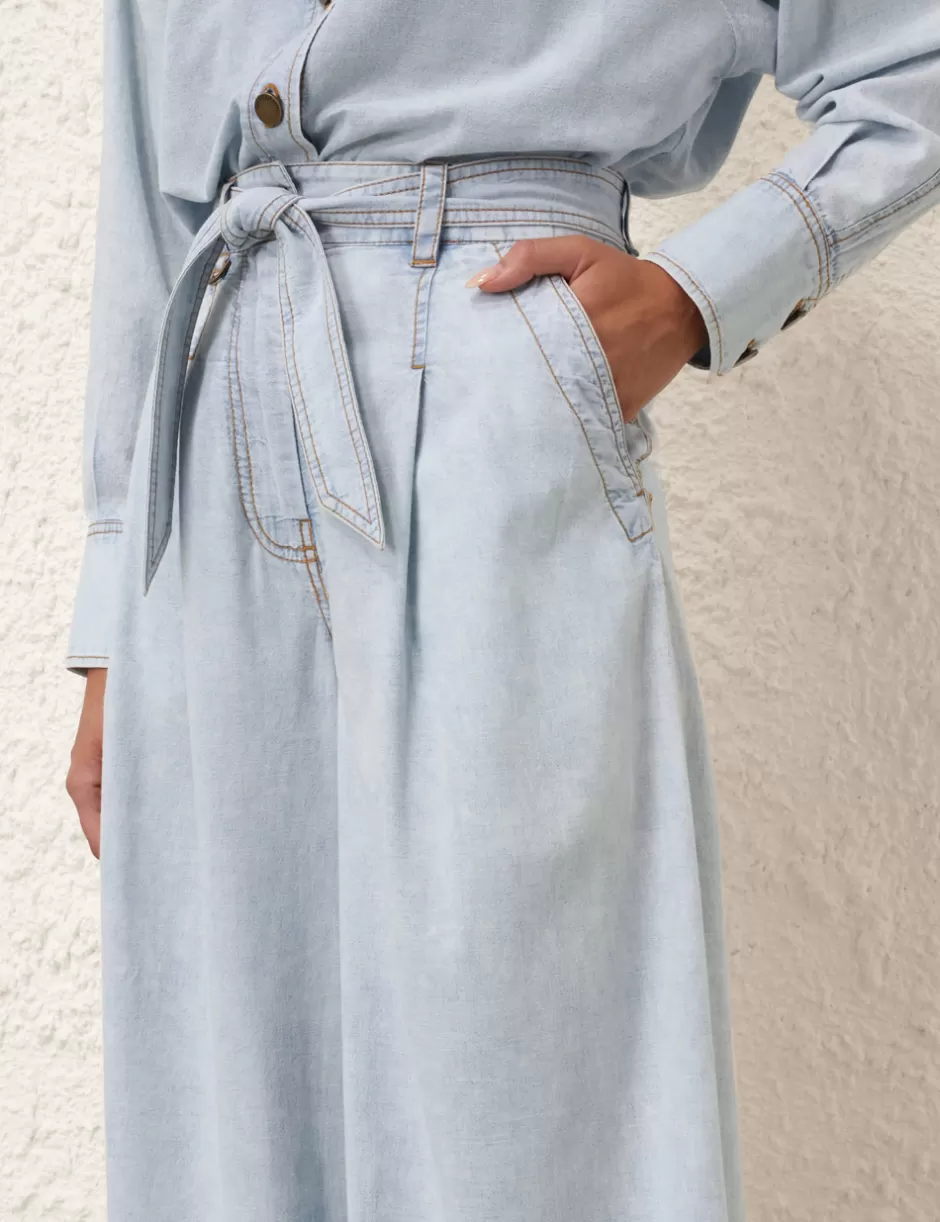 The Wide Leg Denim Pant in Blue Smoke from our Summer Swim 2024 Collection. A denim wide leg pant featuring topstitching and a removable belt.