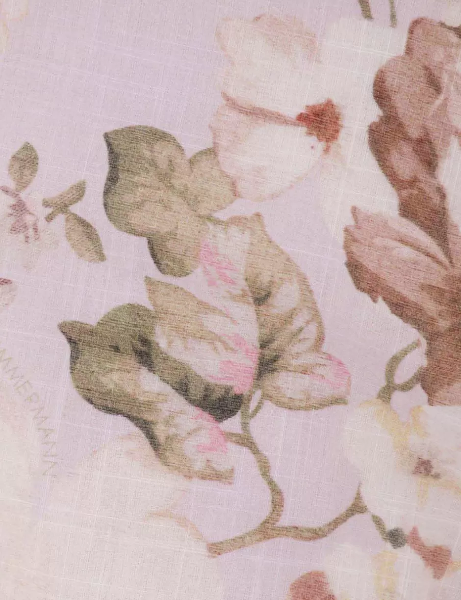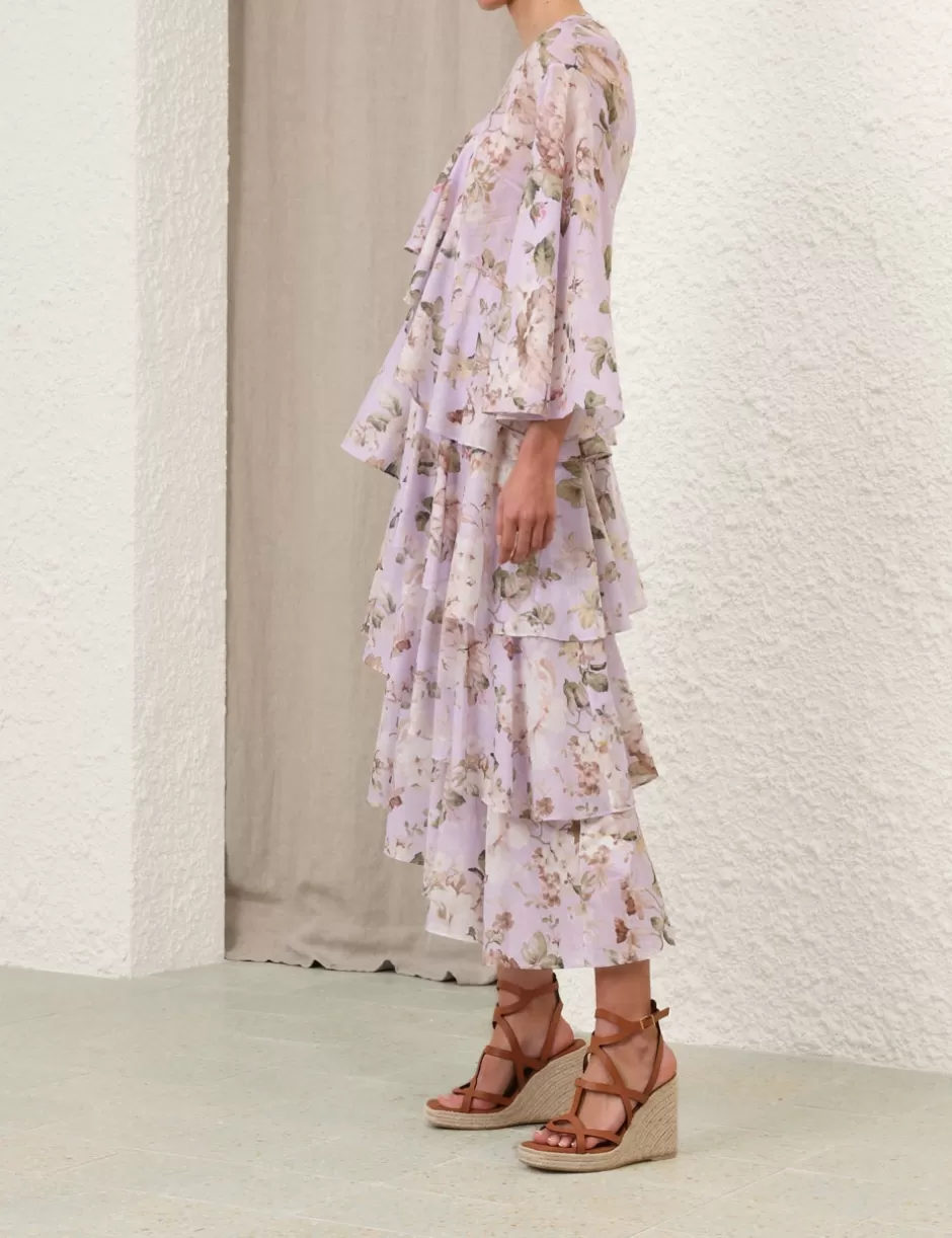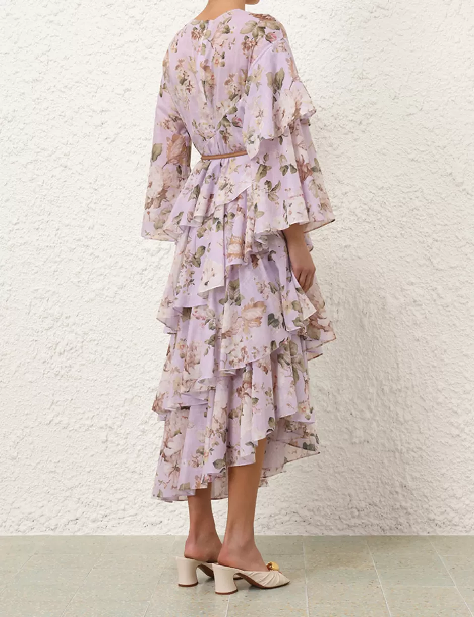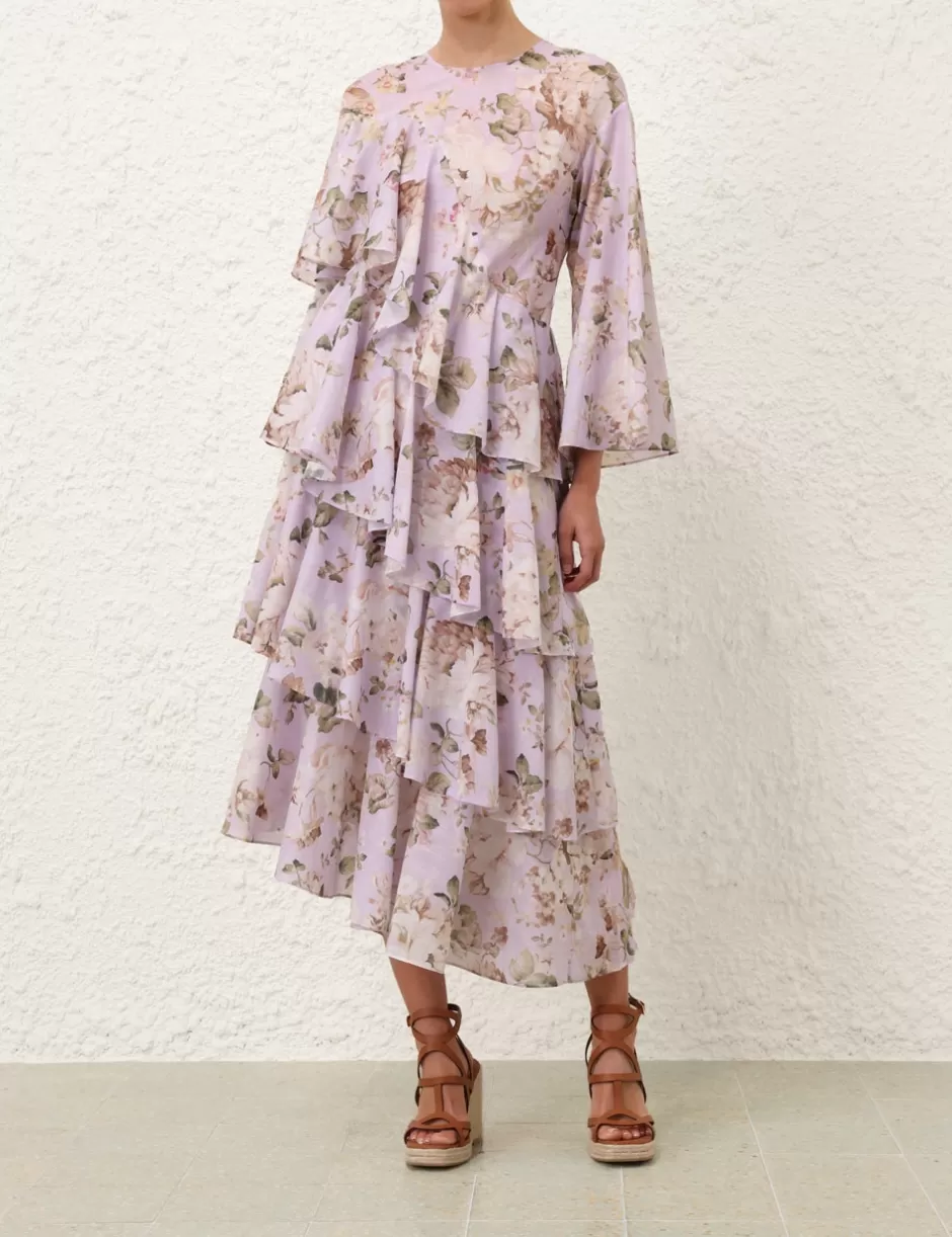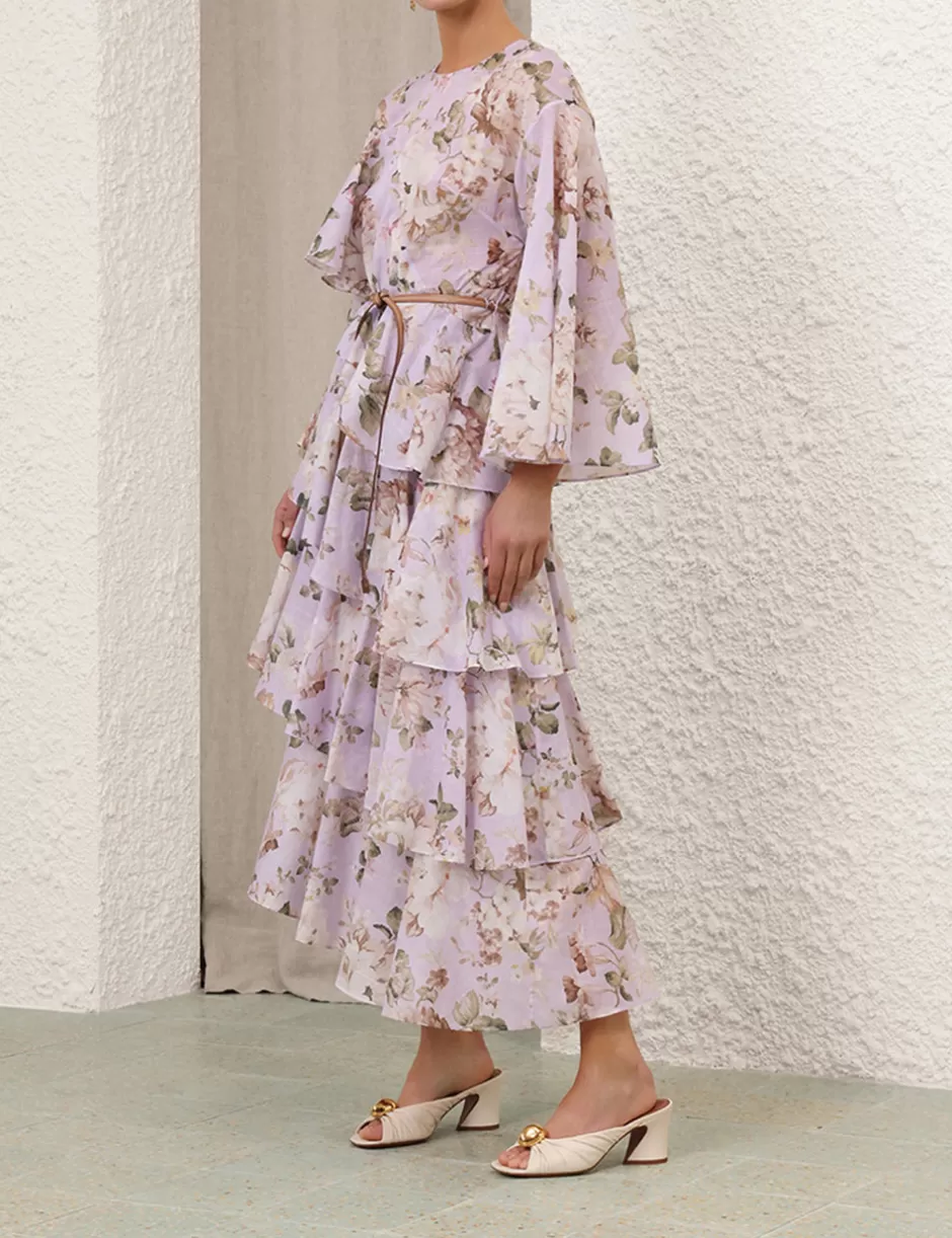 The Acacia Asymmetric Midi Dress in Lilac Floral from our Resort Swim 2025 Collection. A cotton midi dress featuring asymmetric tiers, a round neckline, wide sleeves and a removable belt.