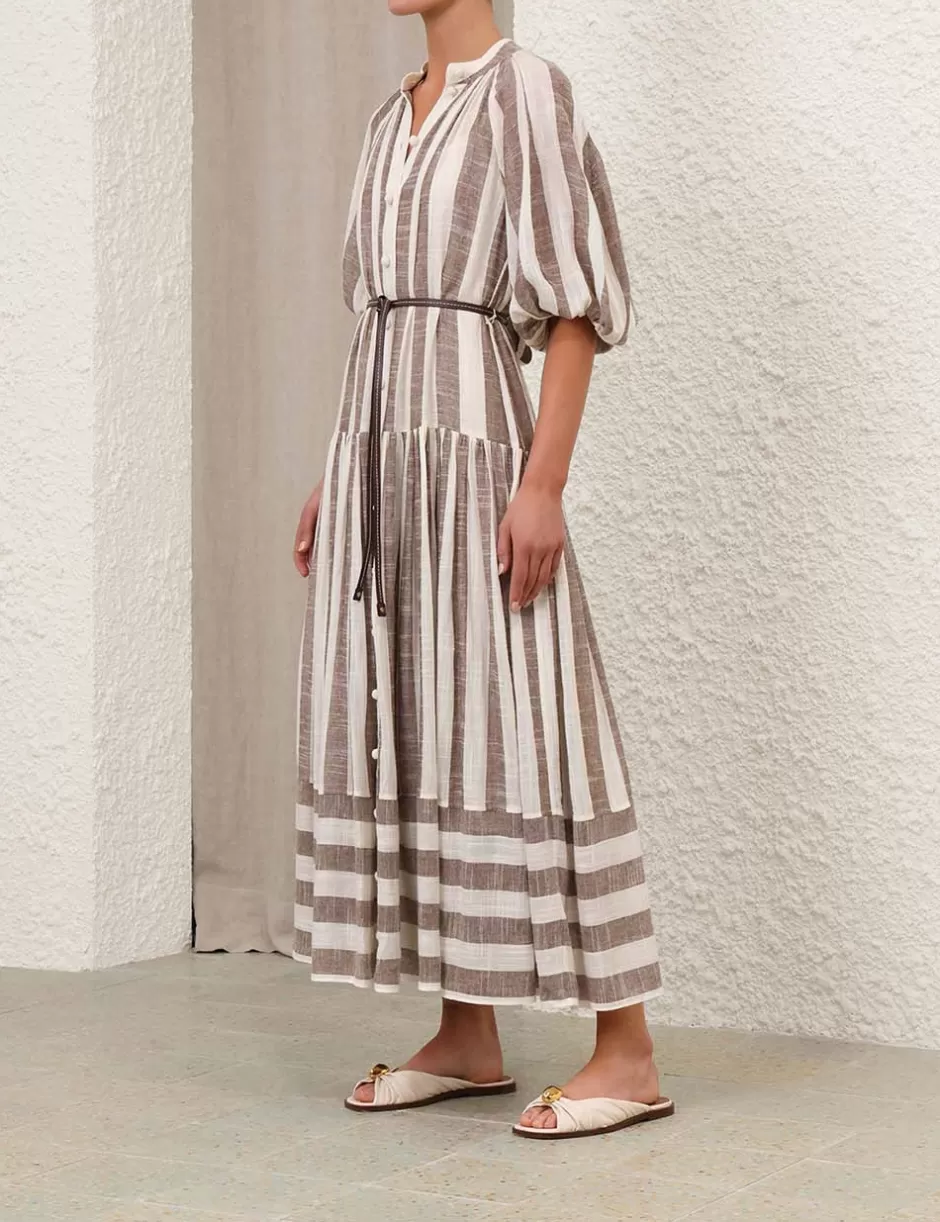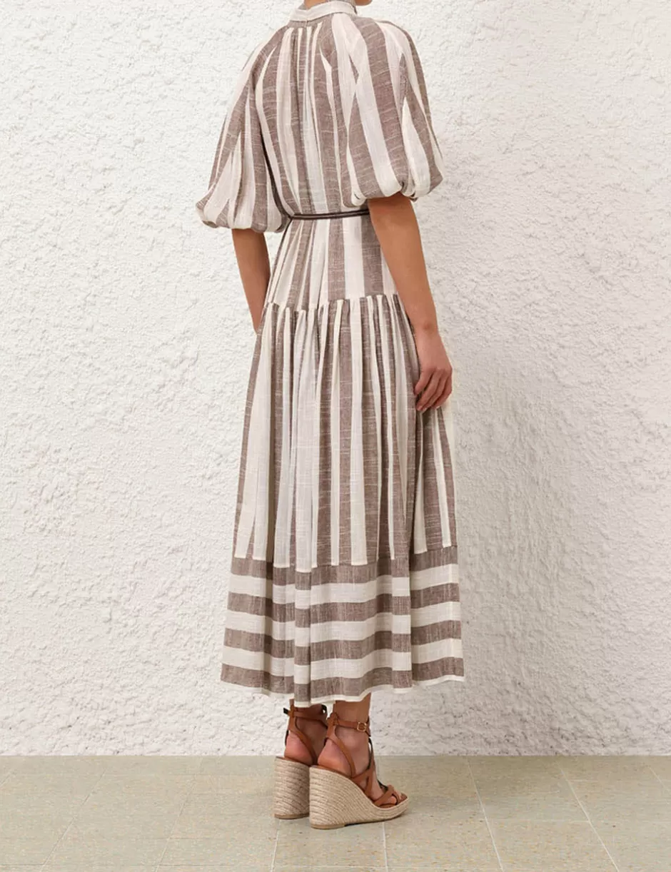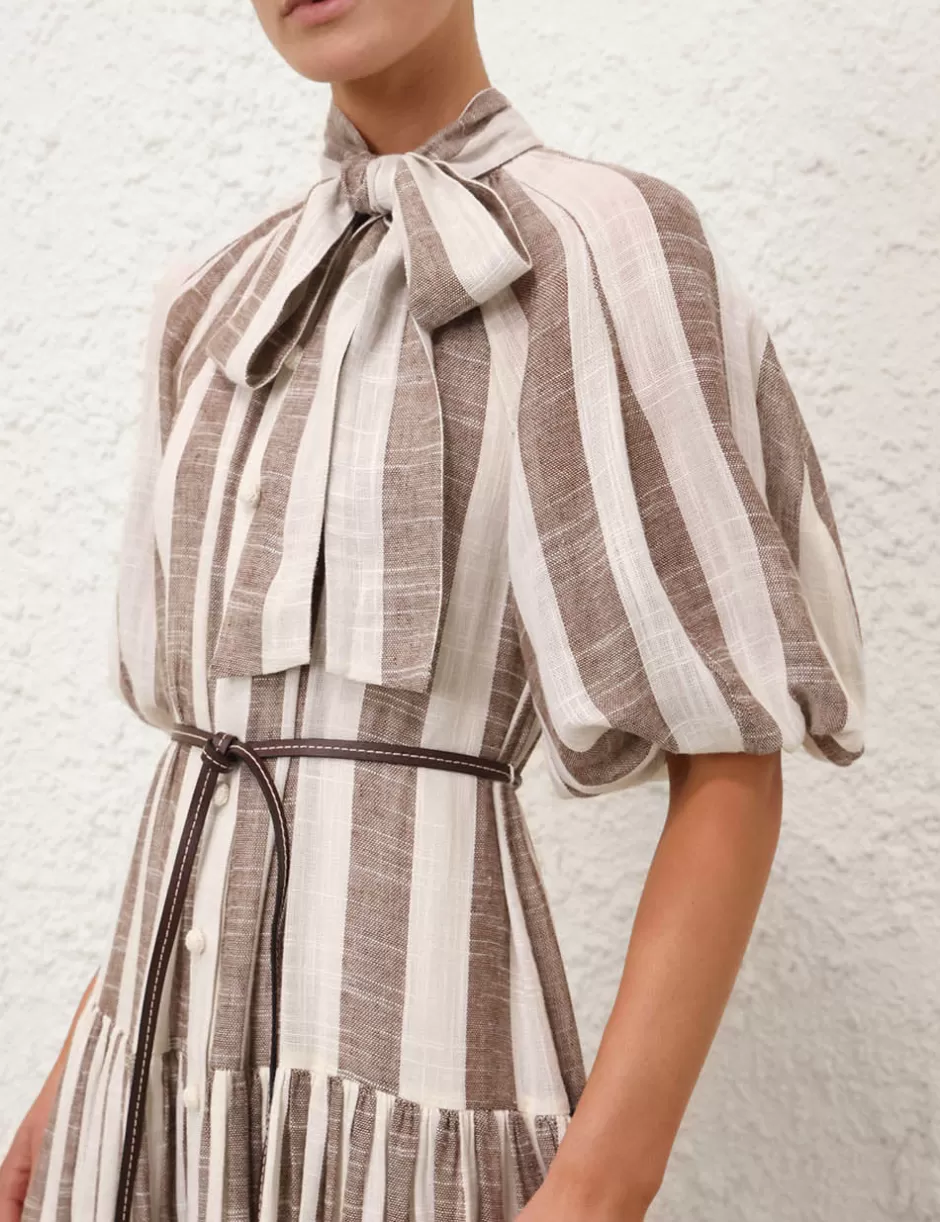 The Acacia Blouson Shirt Dress in Chocolate/Cream Stripe from our Resort Swim 2025 Collection. A short sleeve midi dress featuring a self tie neckline finished with rouleau loops and crochet buttons down the centre front.