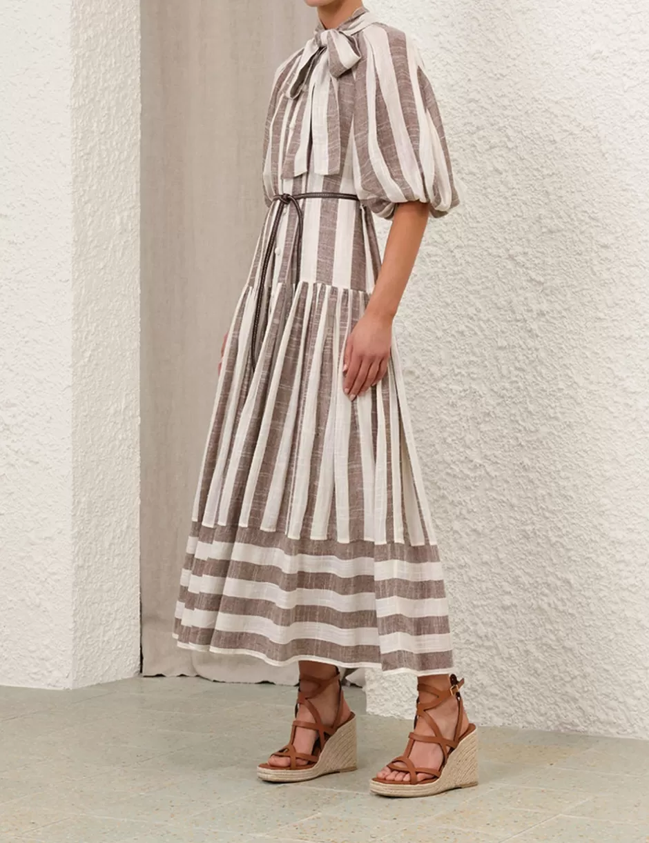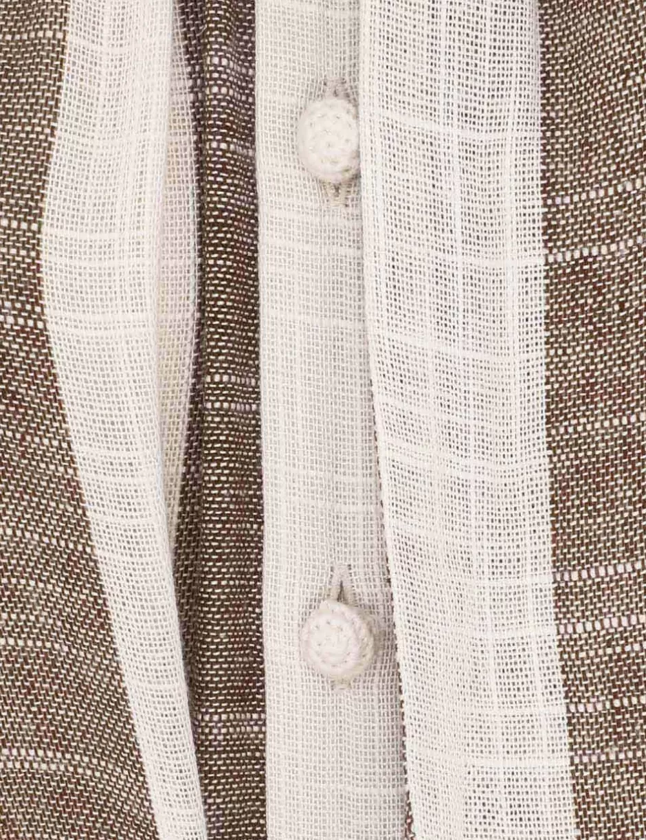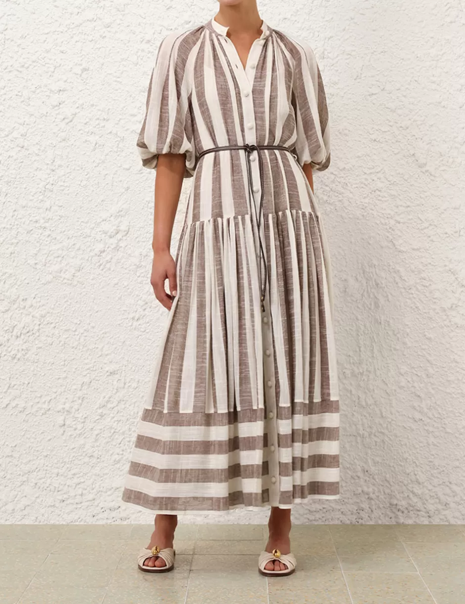 The Acacia Blouson Shirt Dress in Chocolate/Cream Stripe from our Resort Swim 2025 Collection. A short sleeve midi dress featuring a self tie neckline finished with rouleau loops and crochet buttons down the centre front.