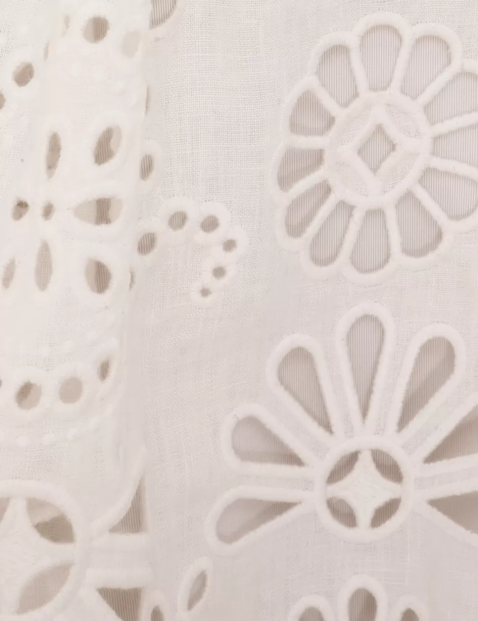 The Acacia Broderie Mini Dress in Ivory from our Resort Swim 2025 Collection. A linen mini dress featuring buttons down the top front placket and embroidered detailing throughout; finished with a scalloped hem on the skirt.