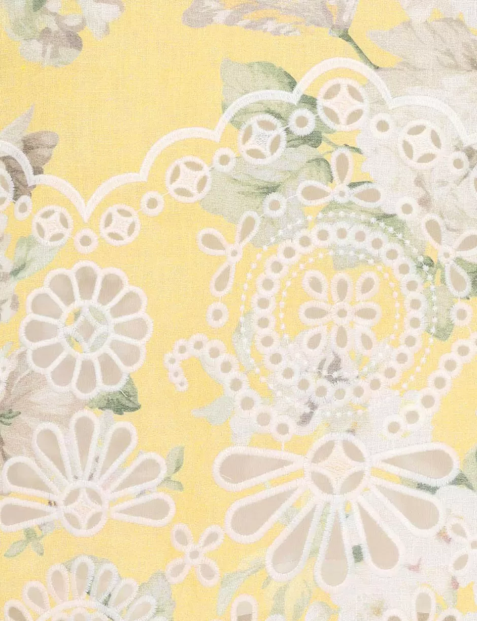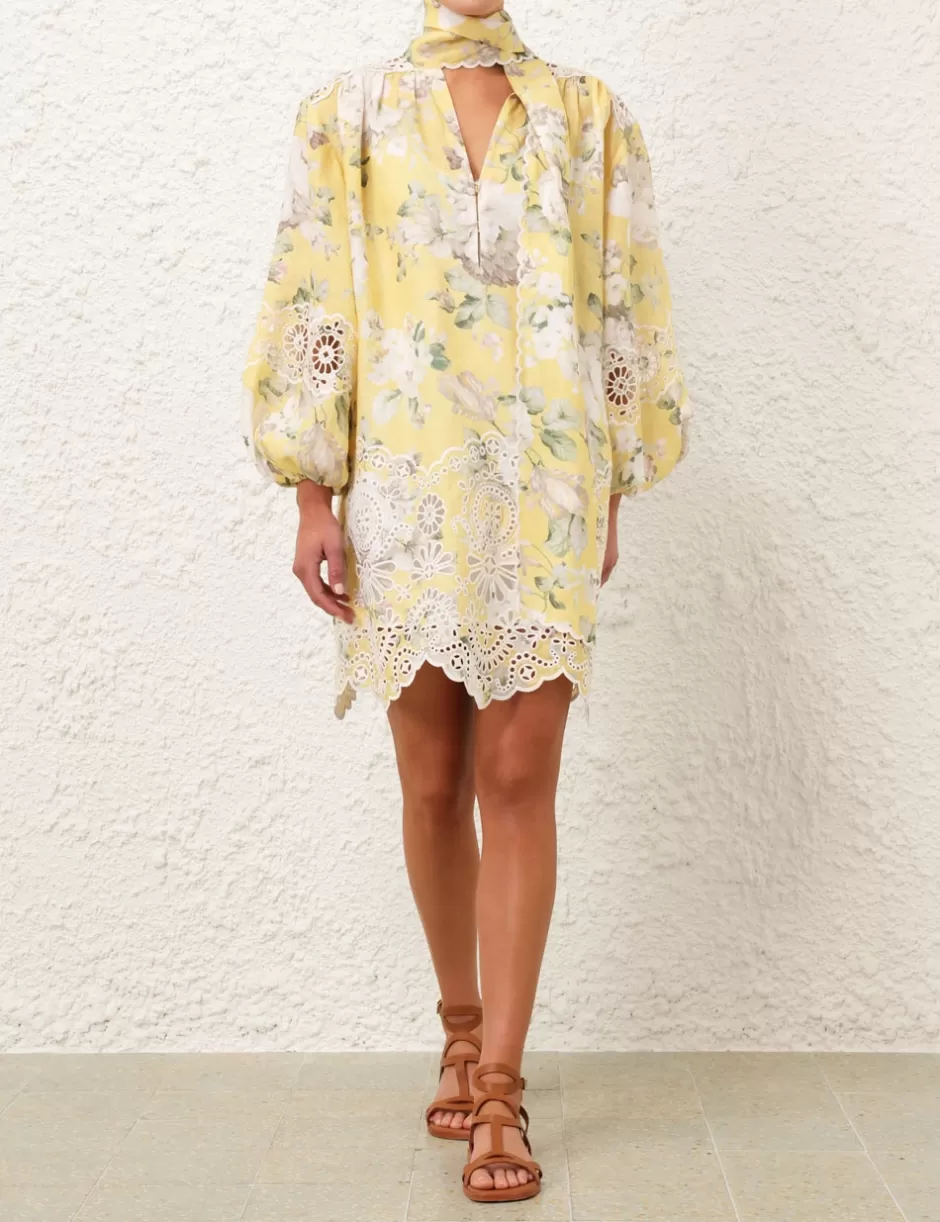 The Acacia Broderie Tie Mini Dress in Yellow Floral from our Resort Swim 2025 Collection. A linen mini dress featuring an embroidered detailing, plunging V-neckline with a self tie neck tie and scalloped hem edges.