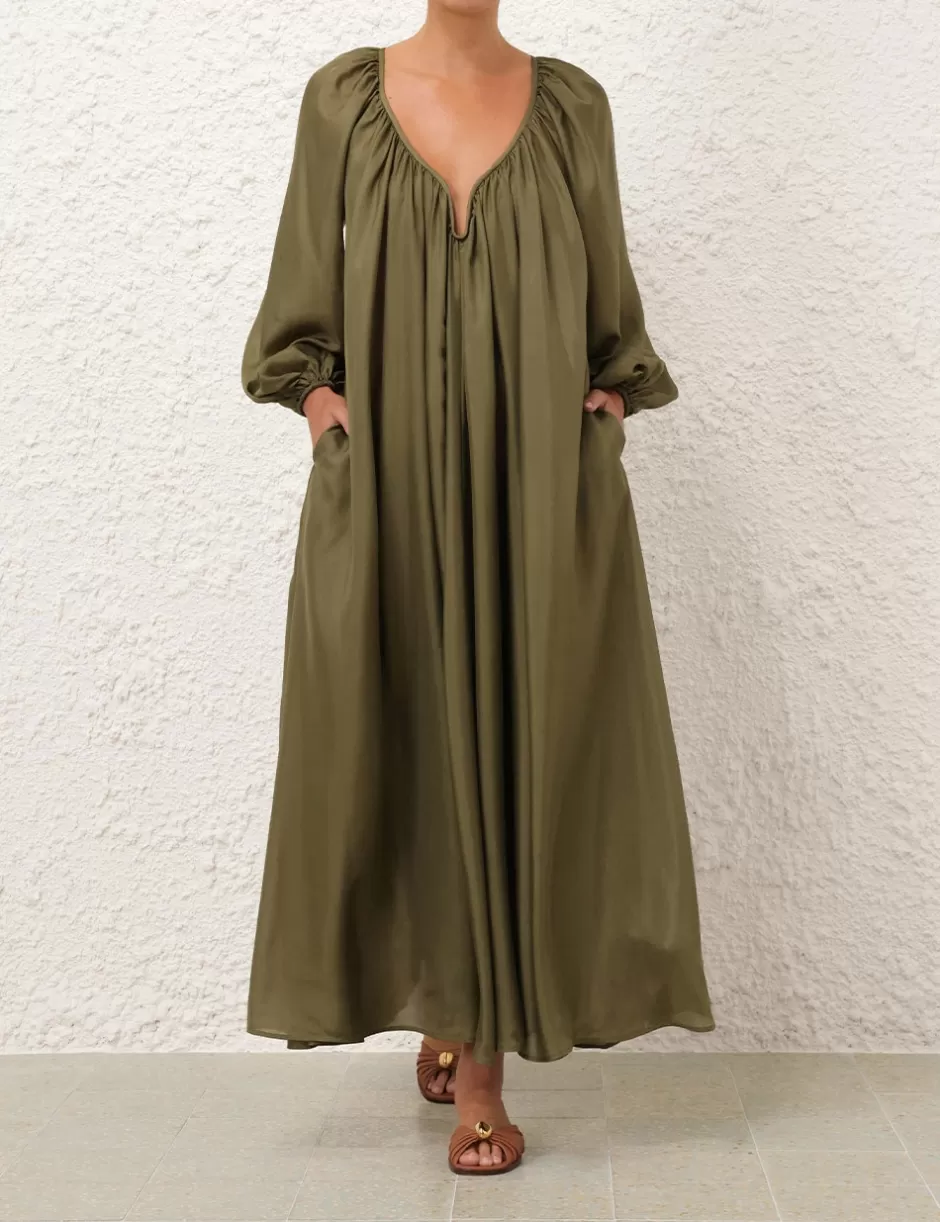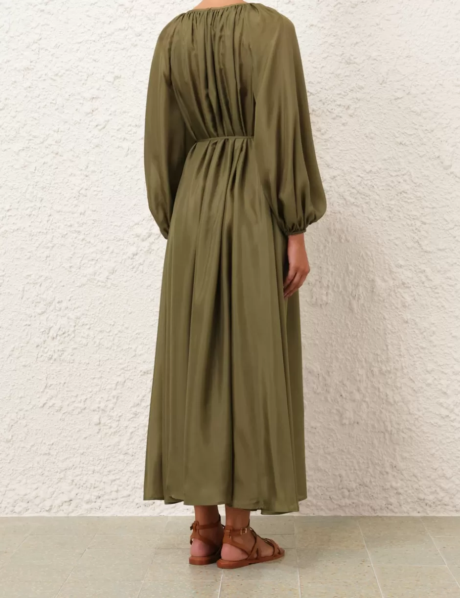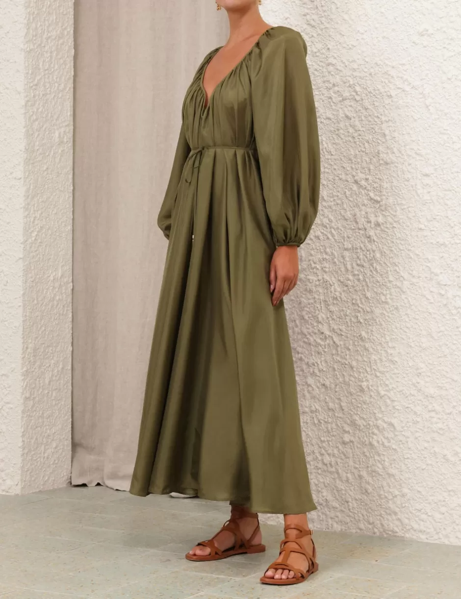 The Acacia Maxi Dress in Khaki from our Resort Swim 2025 Collection. A silk long sleeve midi dress featuring a V wire gathered neckline, a removable belt and blouson sleeves.