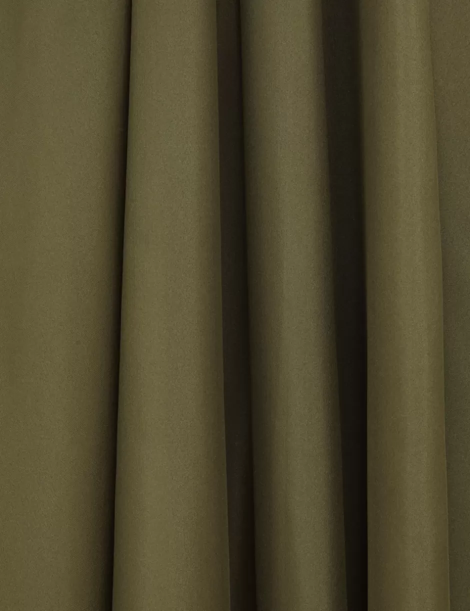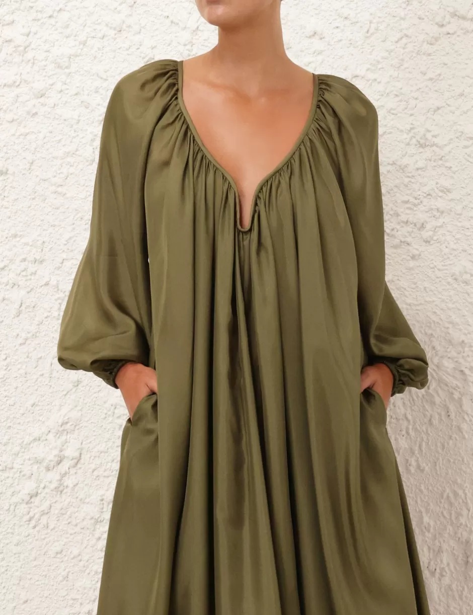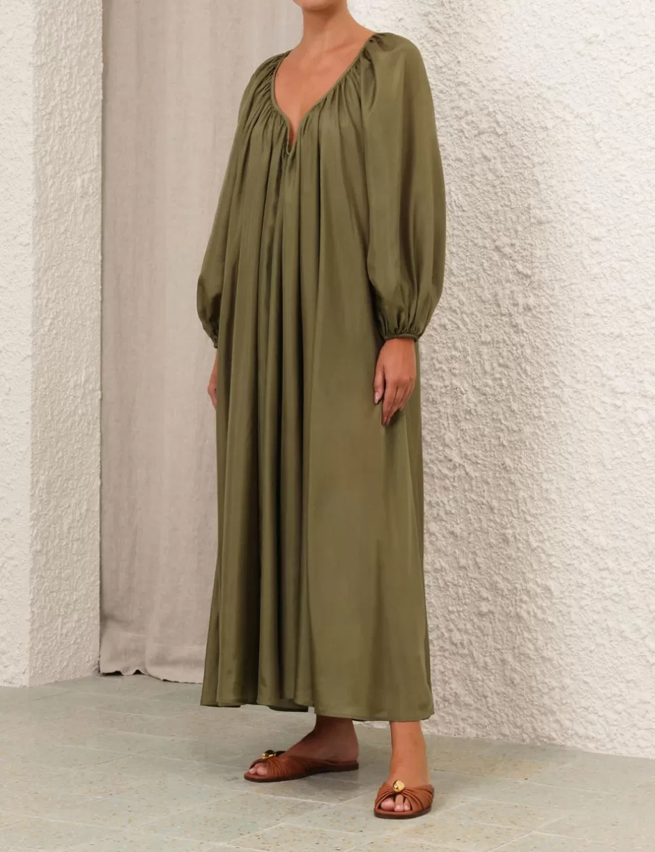 The Acacia Maxi Dress in Khaki from our Resort Swim 2025 Collection. A silk long sleeve midi dress featuring a V wire gathered neckline, a removable belt and blouson sleeves.