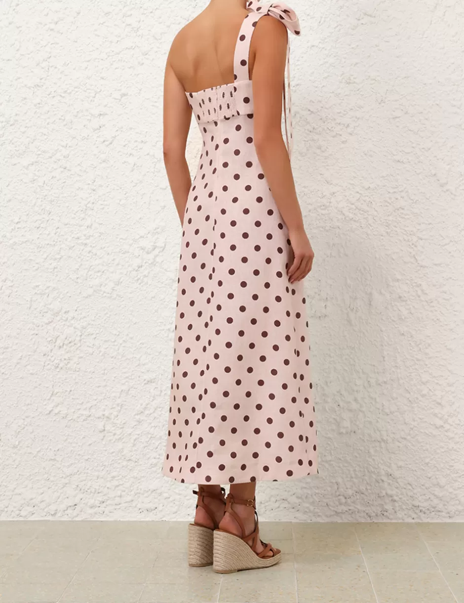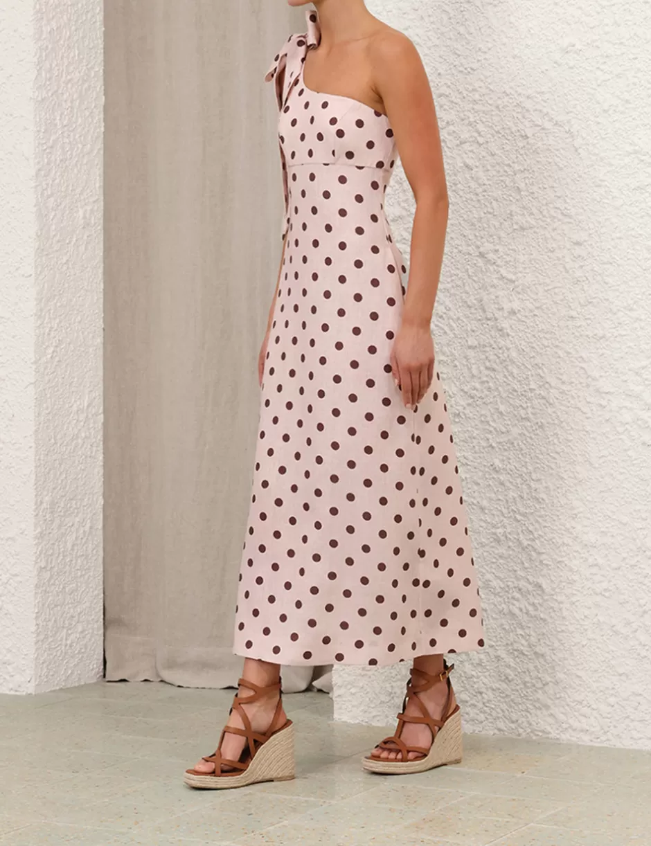The Acacia One Shoulder Midi Dress in Cream/Tan Dot from our Resort Swim 2025 Collection. A linen midi dress with a one shoulder silhouette, featuring a self tie shoulder bow and a shirred back panel with a centre back zip.