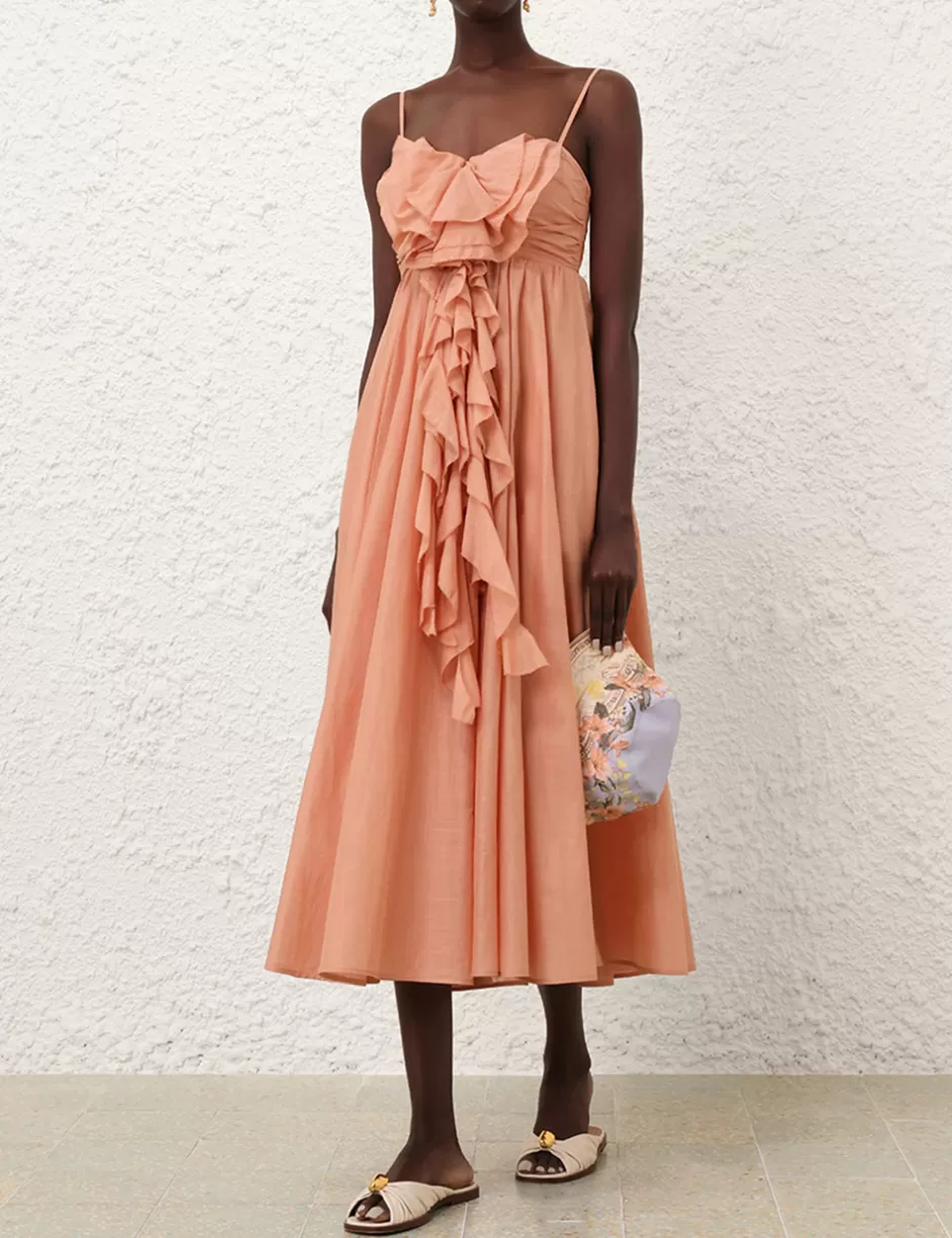 The Acacia Ruffle Maxi Dress in Tan from our Resort Swim 2025 Collection. A cotton maxi dress featuring centre front ruffle detail, shirring at the back and a removable adjustable straps.