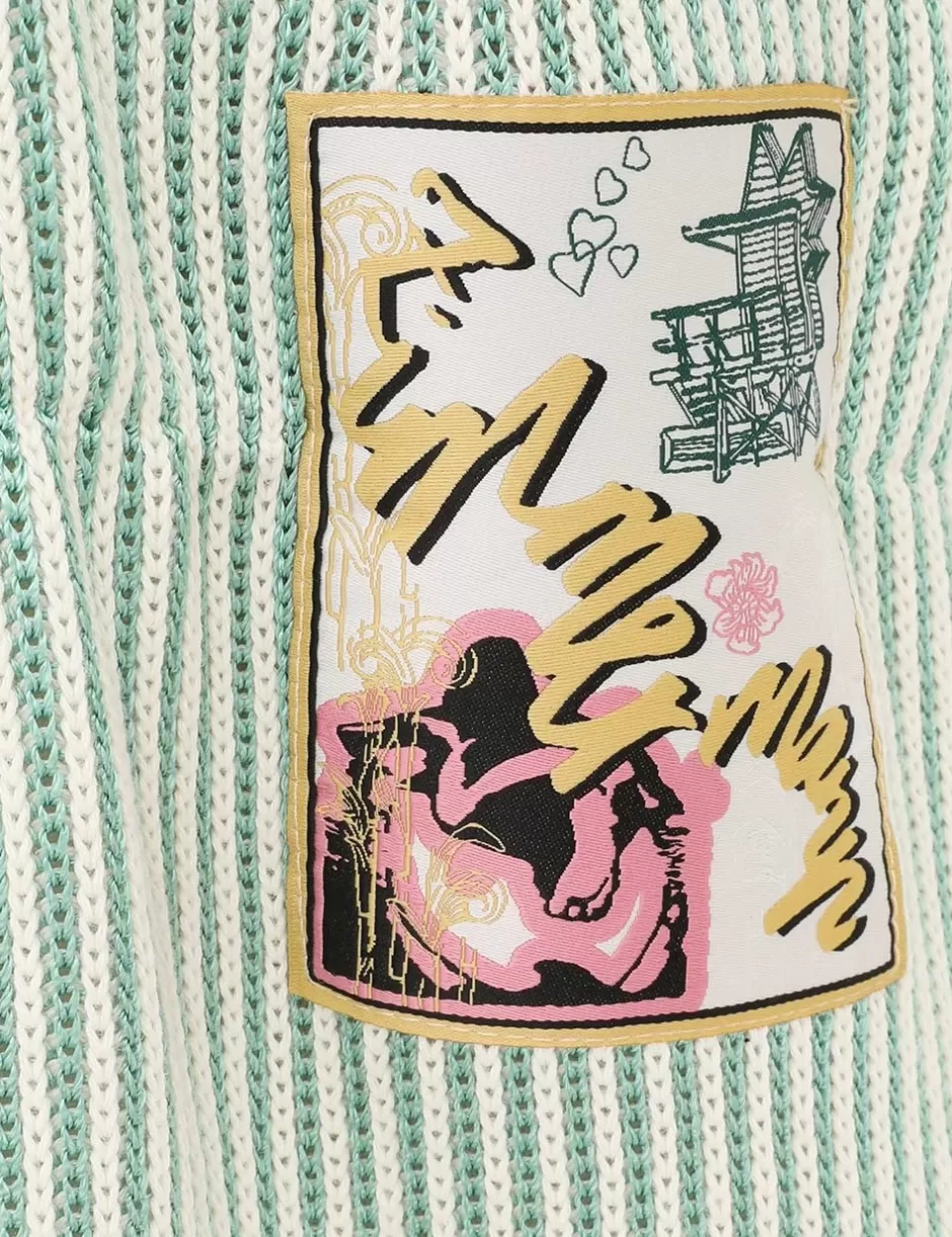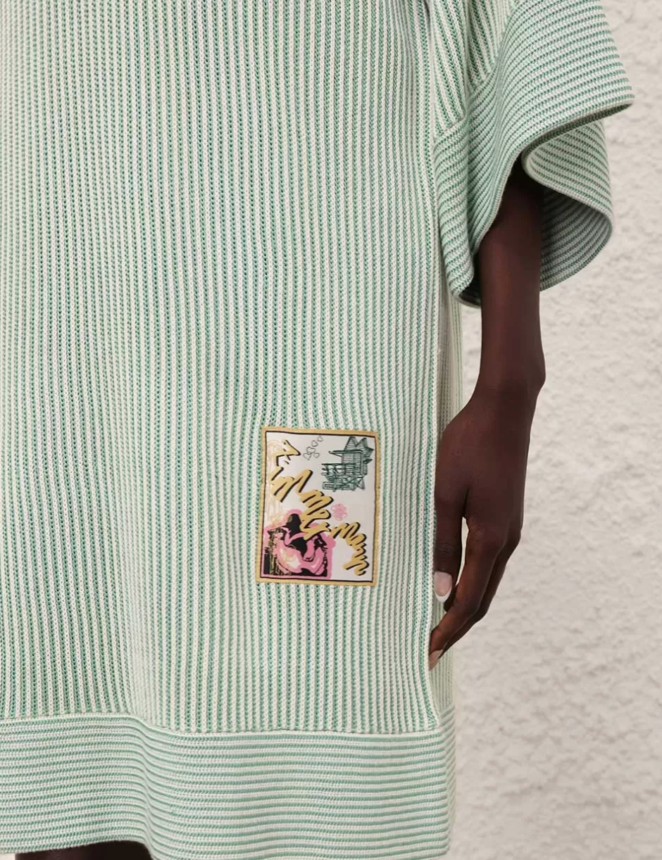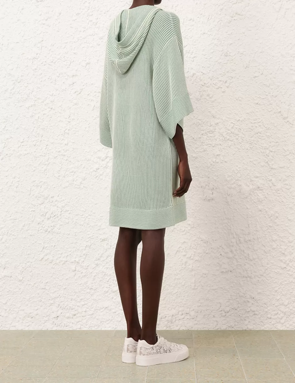 The Acacia Stripe Hooded Mini in Green/Cream from our Resort Swim 2025 Collection. A mini dress featuring a V-neckline with hood, striped detailing and wide sleeves.