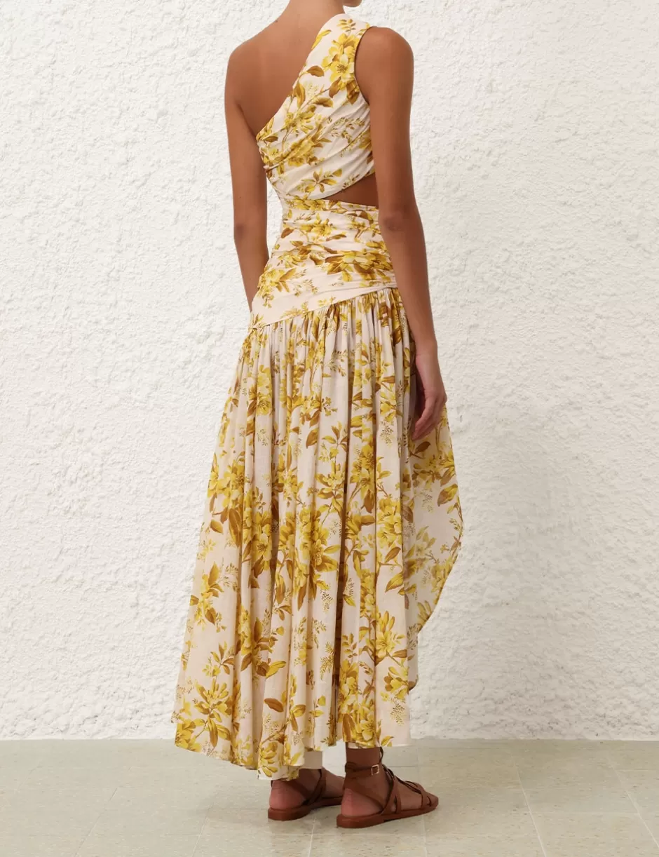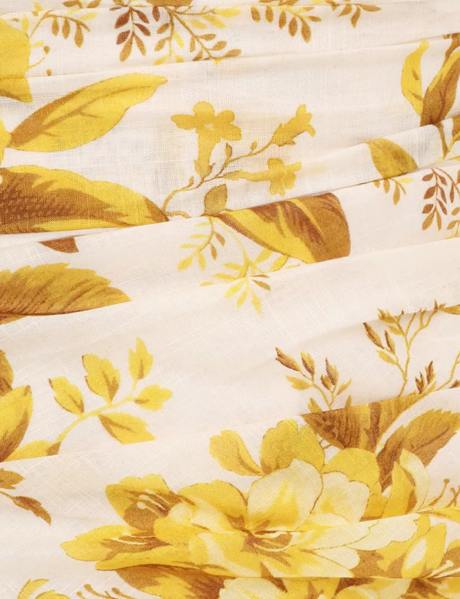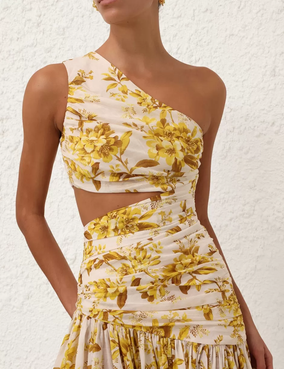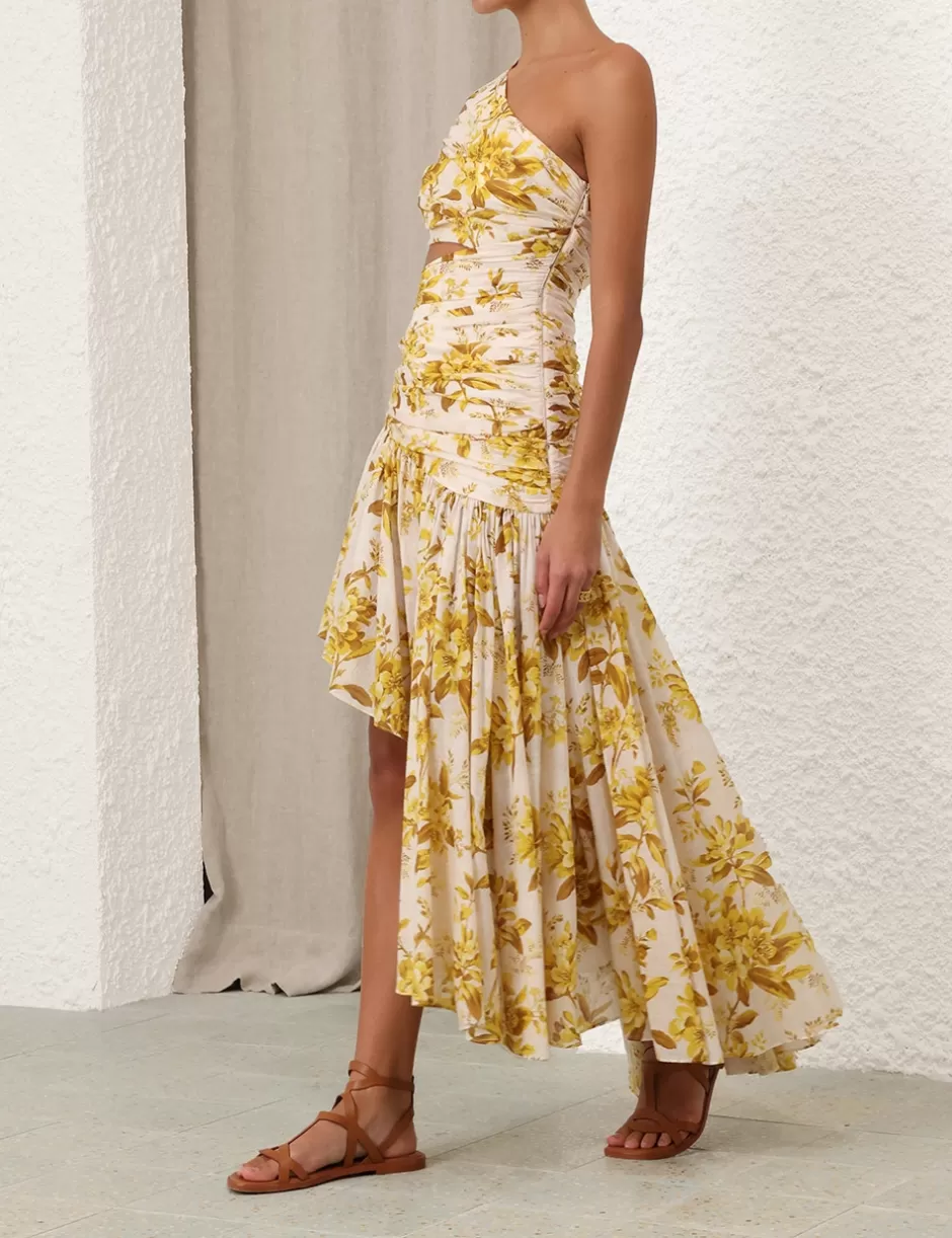 The Golden Asymmetric Dress in Yellow Toile Floralfrom our Summer Swim 2024 Collection. A cotton midi dress featuring an asymmetric high-low silhouette with a waist cut out.