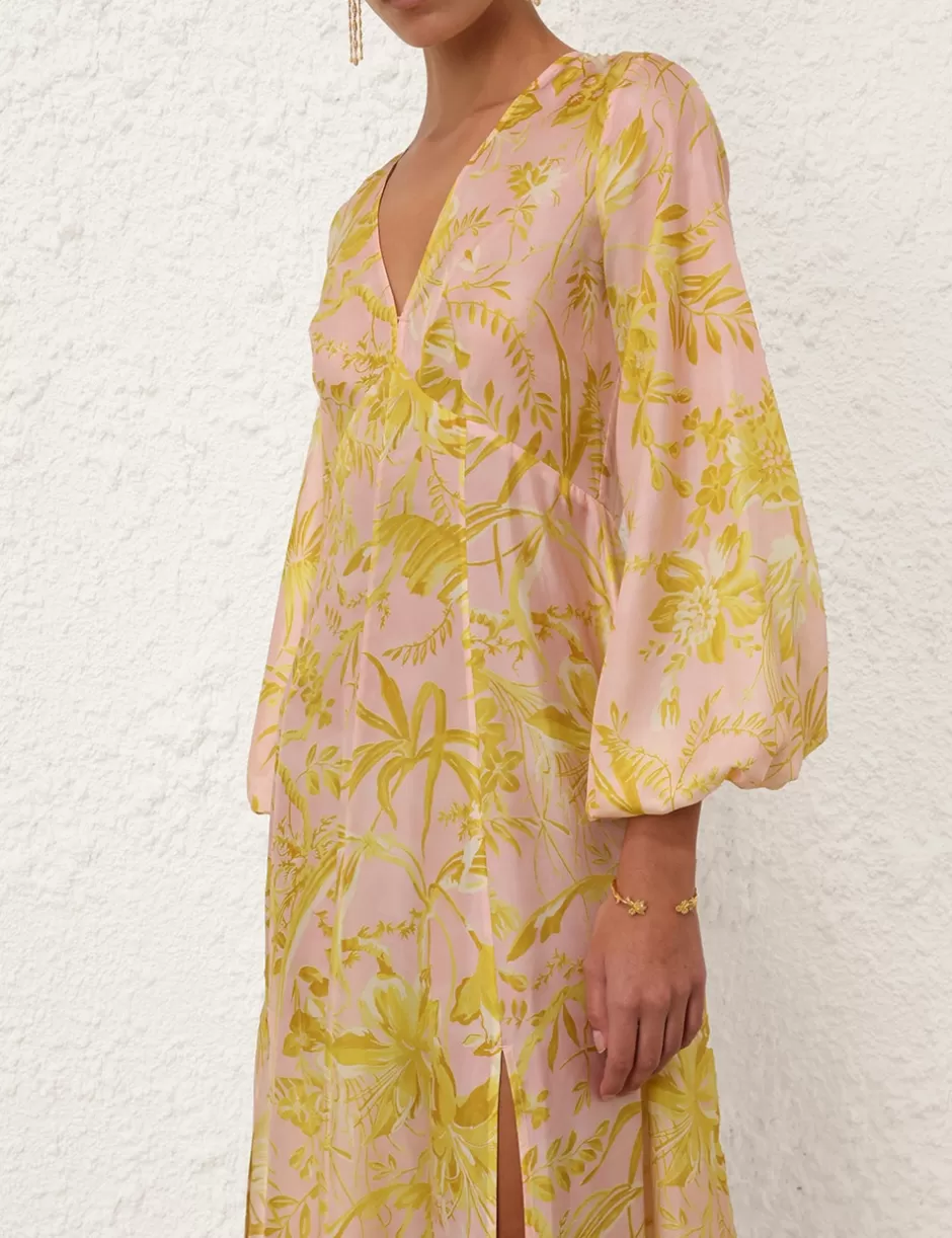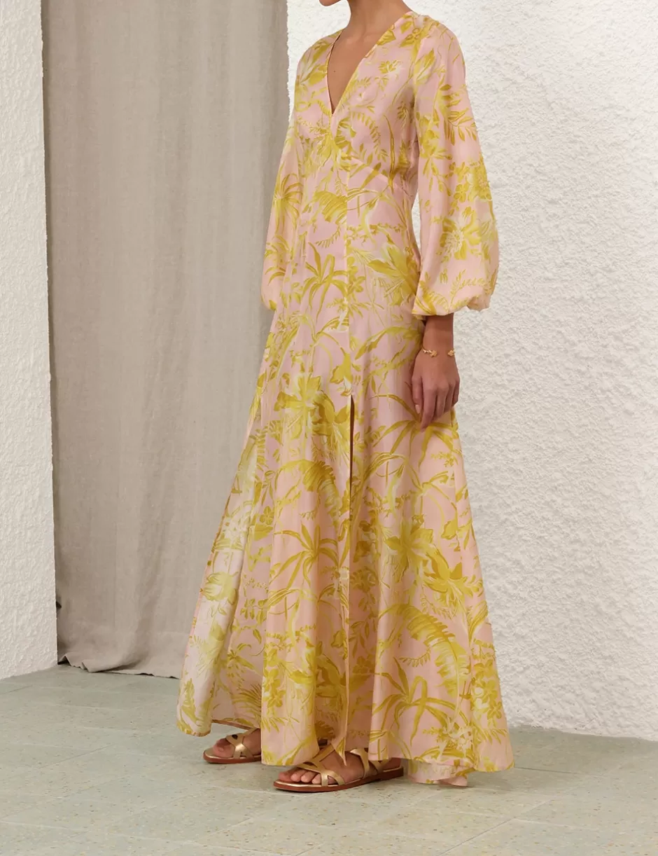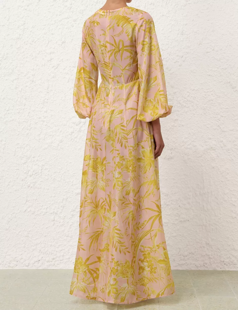 The Golden Long Sleeve Maxi Dress in Pink/Gold Floral from our Summer Swim 2024 Collection. A silk maxi dress featuring a plunging V-neckline and long blouson sleeves with elasticated cuff.