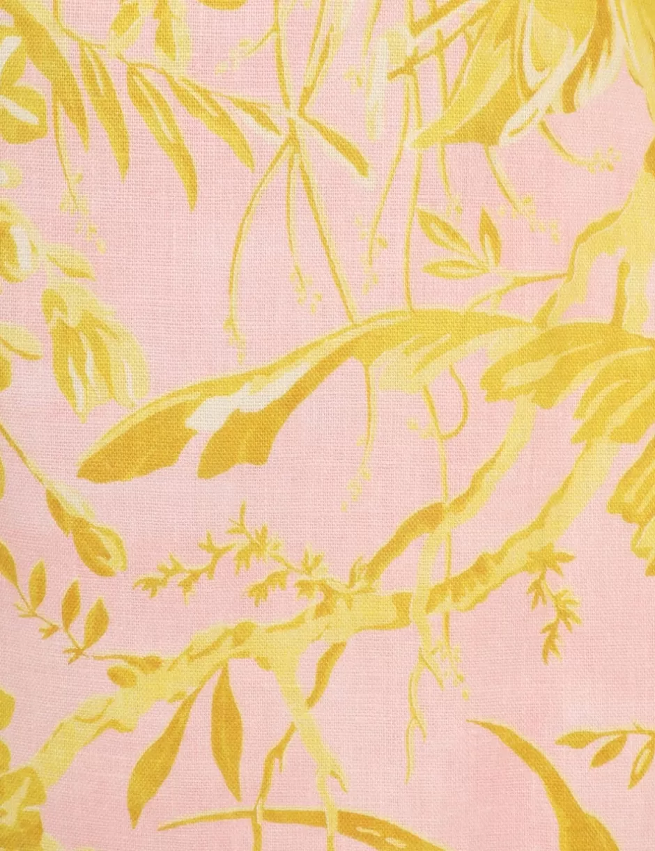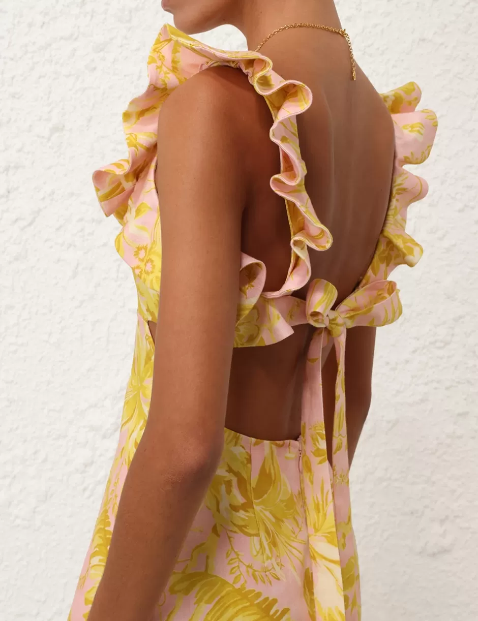 The Golden Ruffle Mini Dress in Pink/Gold Floral from our Summer Swim 2024 Collection. A linen mini dress featuring shoulder and bodice ruffles with a self tie back.