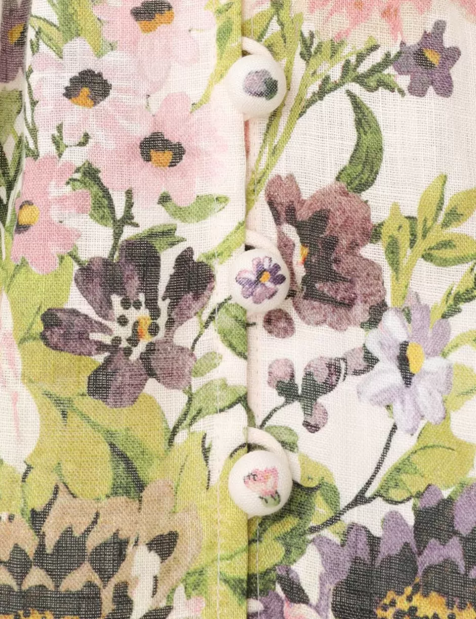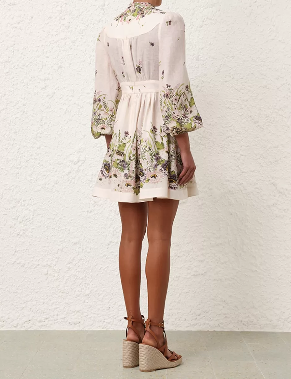 The Halliday Plunge Mini Dress in Cream Multi Floral from our Summer Swim 2024 Collection. A linen long sleeve mini dress featuring a plunging neckline and spaghetti loops along the centre front.