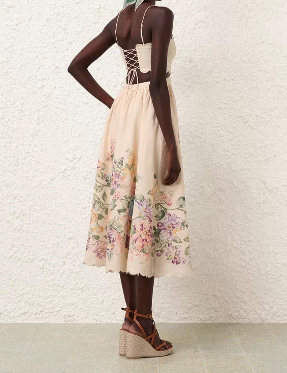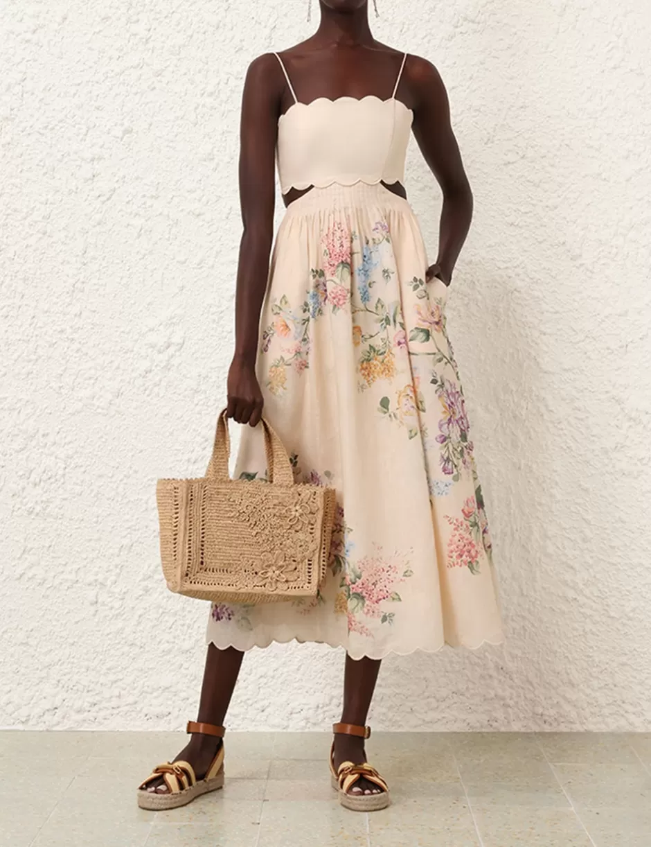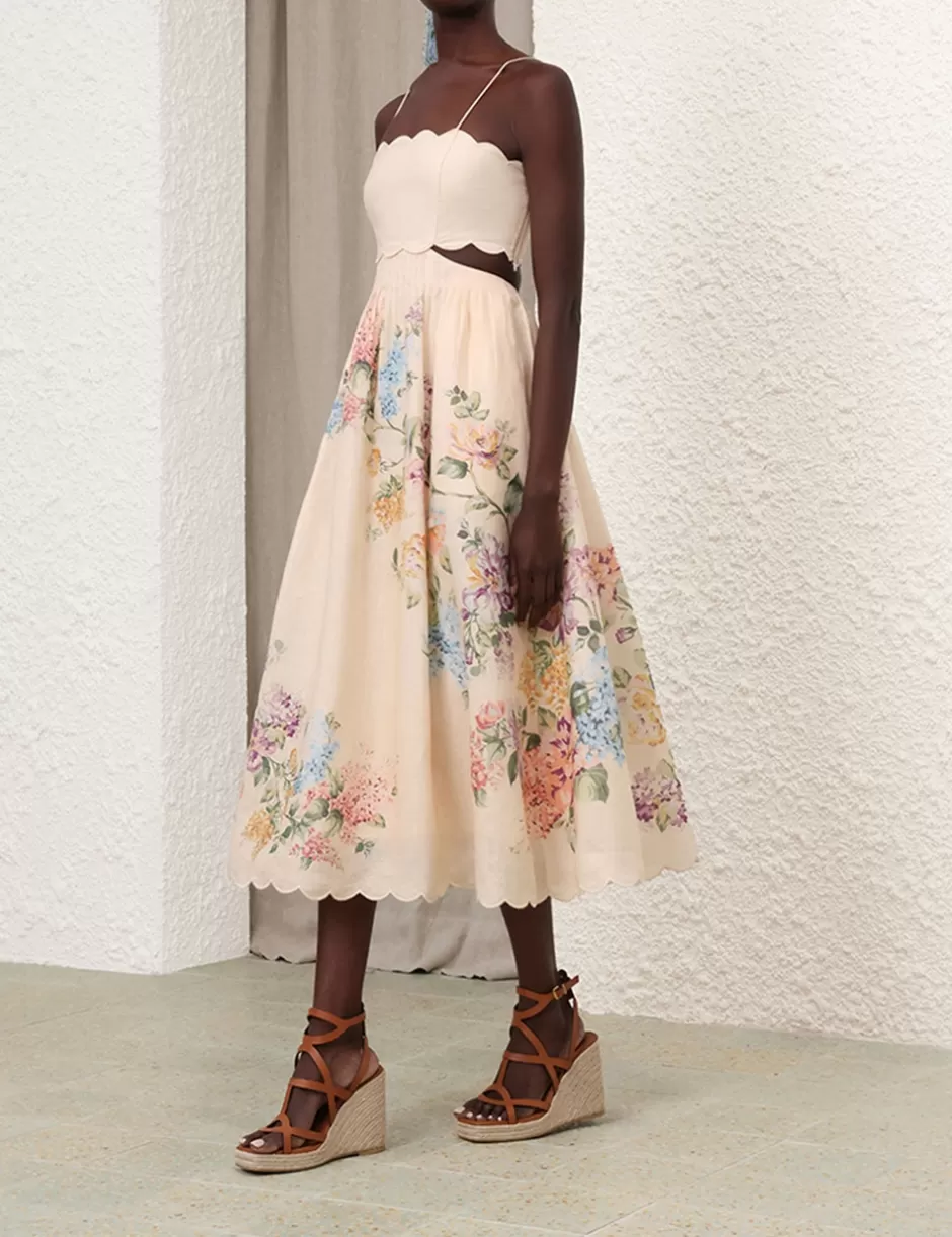 The Halliday Scallop Midi Dress in Cream Watercolour Floral from our Summer Swim 2024 Collection. A linen midi dress featuring waist cut outs, side seam pockets and lace up back bodice, finished with embroidered scalloped edging throughout.