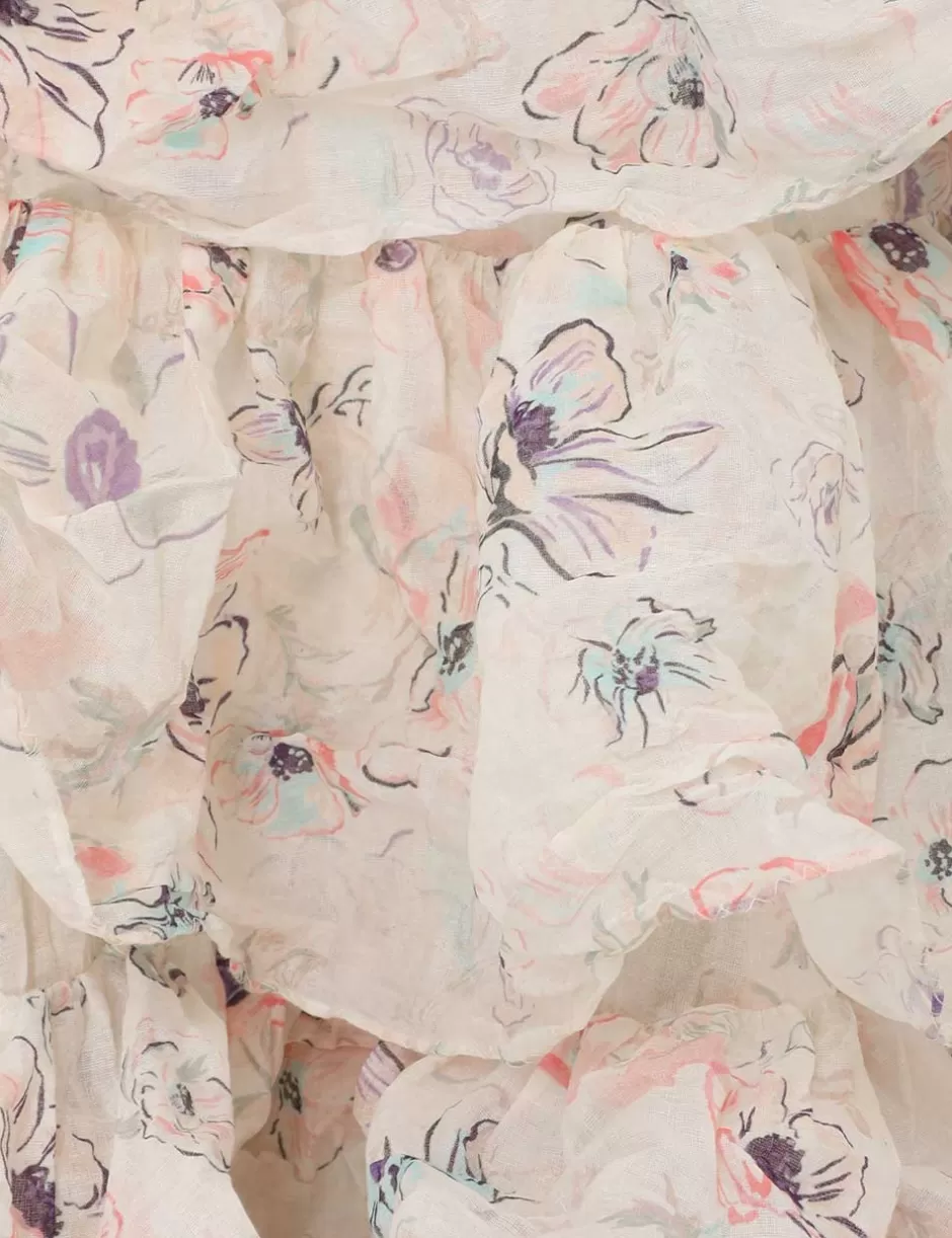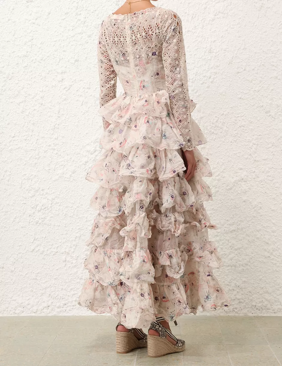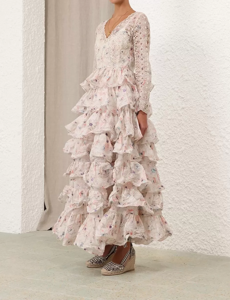 The Halliday Tiered Ruffle Gown in Ivory Watercolour Floral from our Summer Swim 2024 Collection. A midi gown featuring a plunging v-neckline with lace bodice and sleeve with scallop edge, finished with a lightly crushed textured tiered skirt.