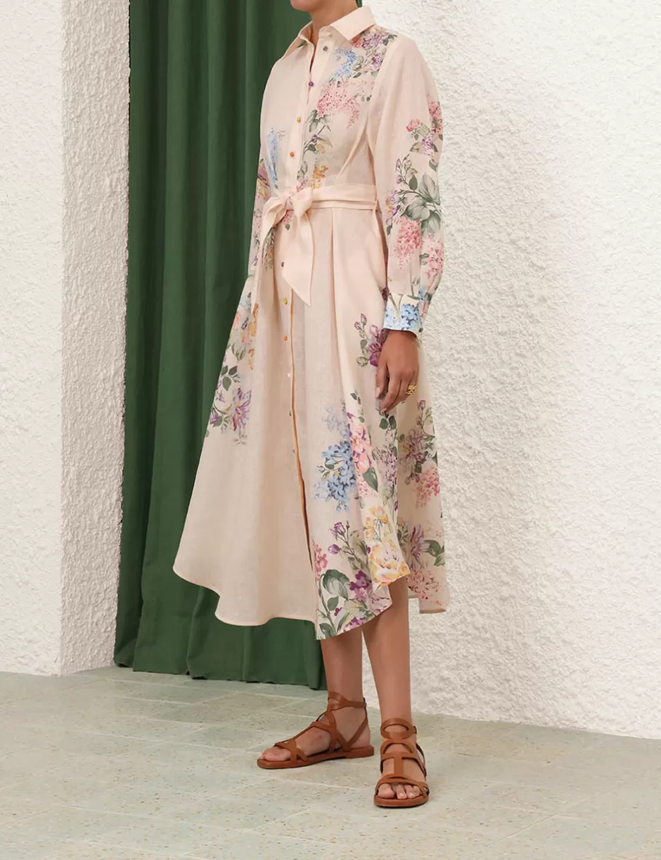The Halliday Tucked Shirt Dress in Cream Watercolour Floral from our Summer Swim 2024 Collection. A linen midi dress featuring placement artwork and a self tie belt.