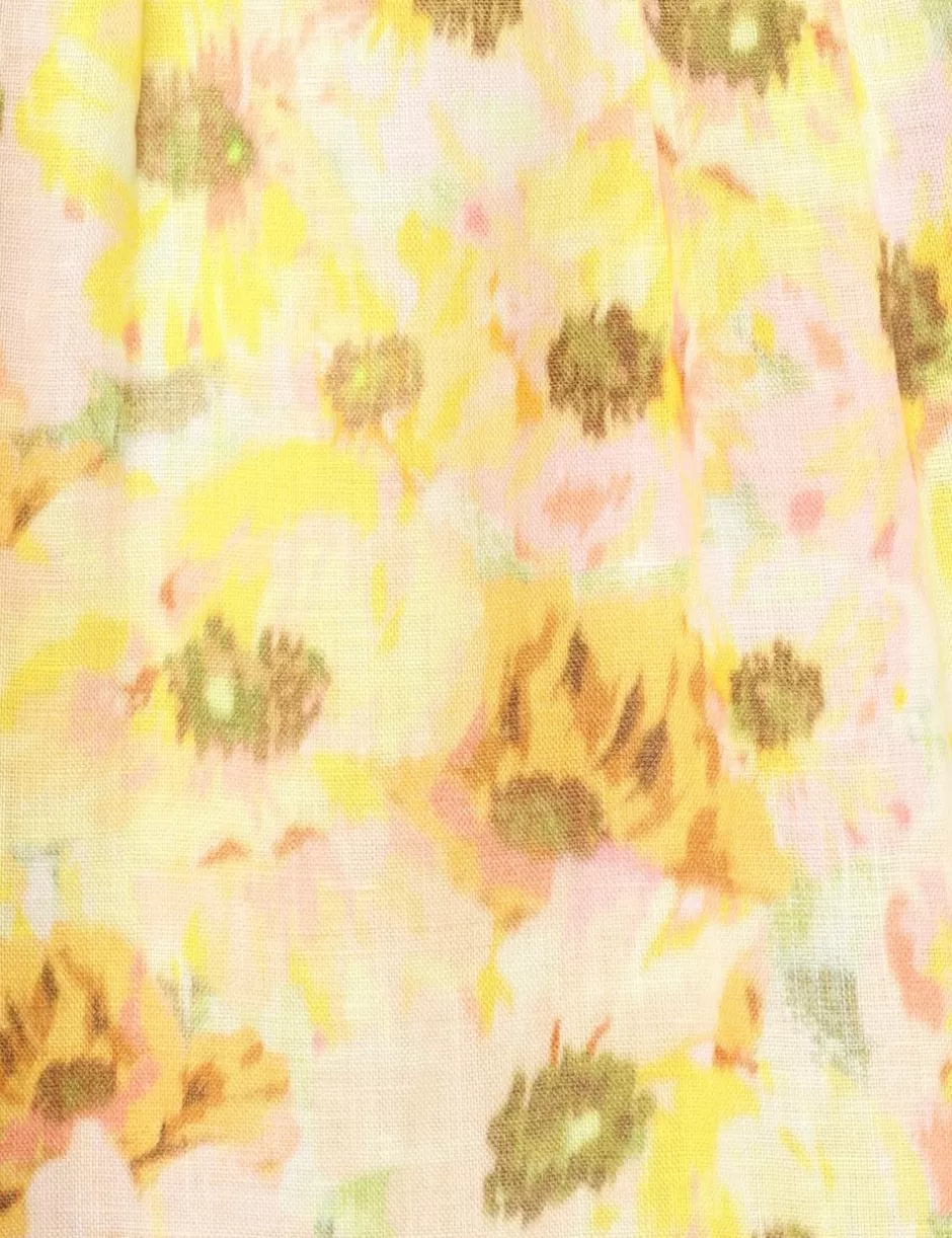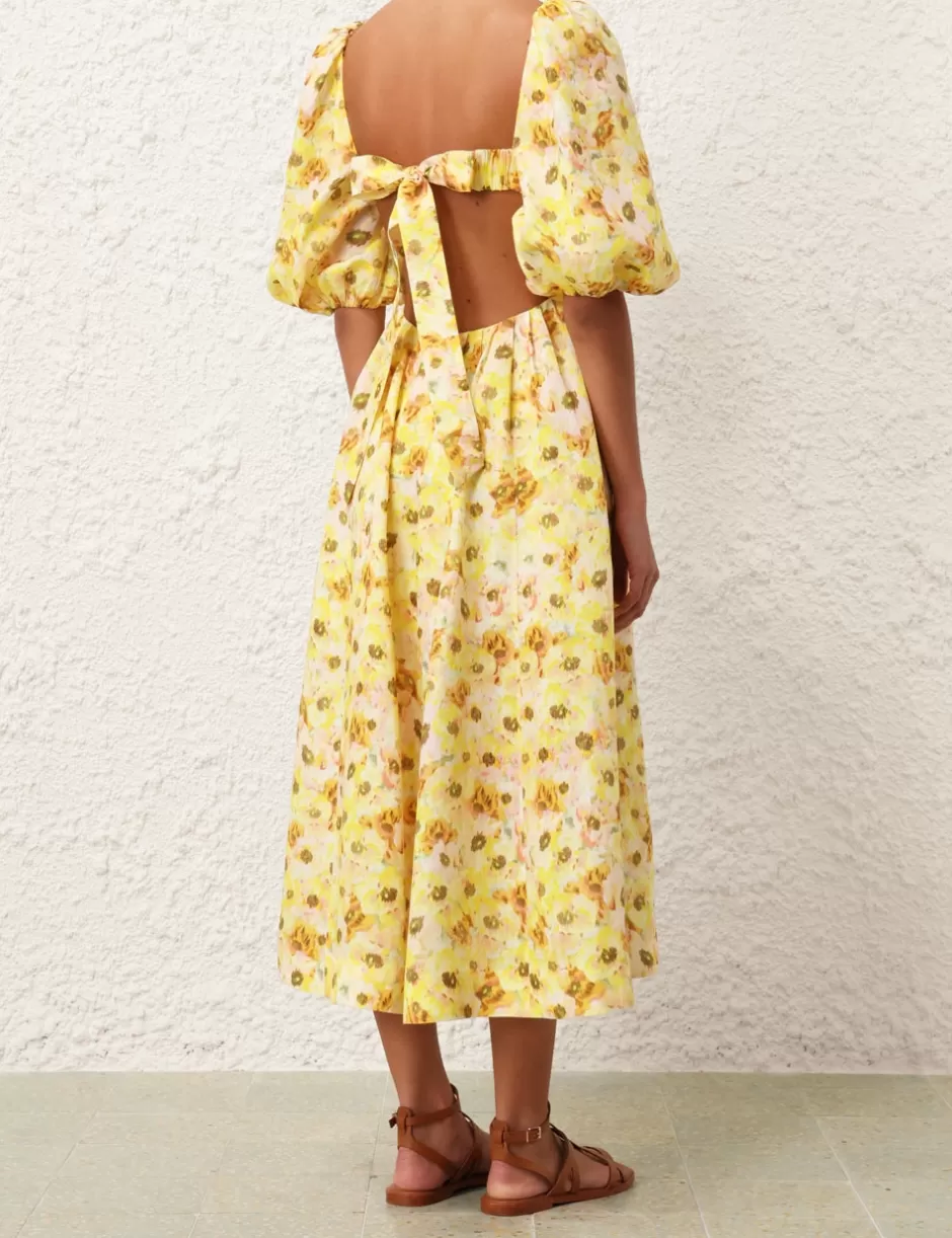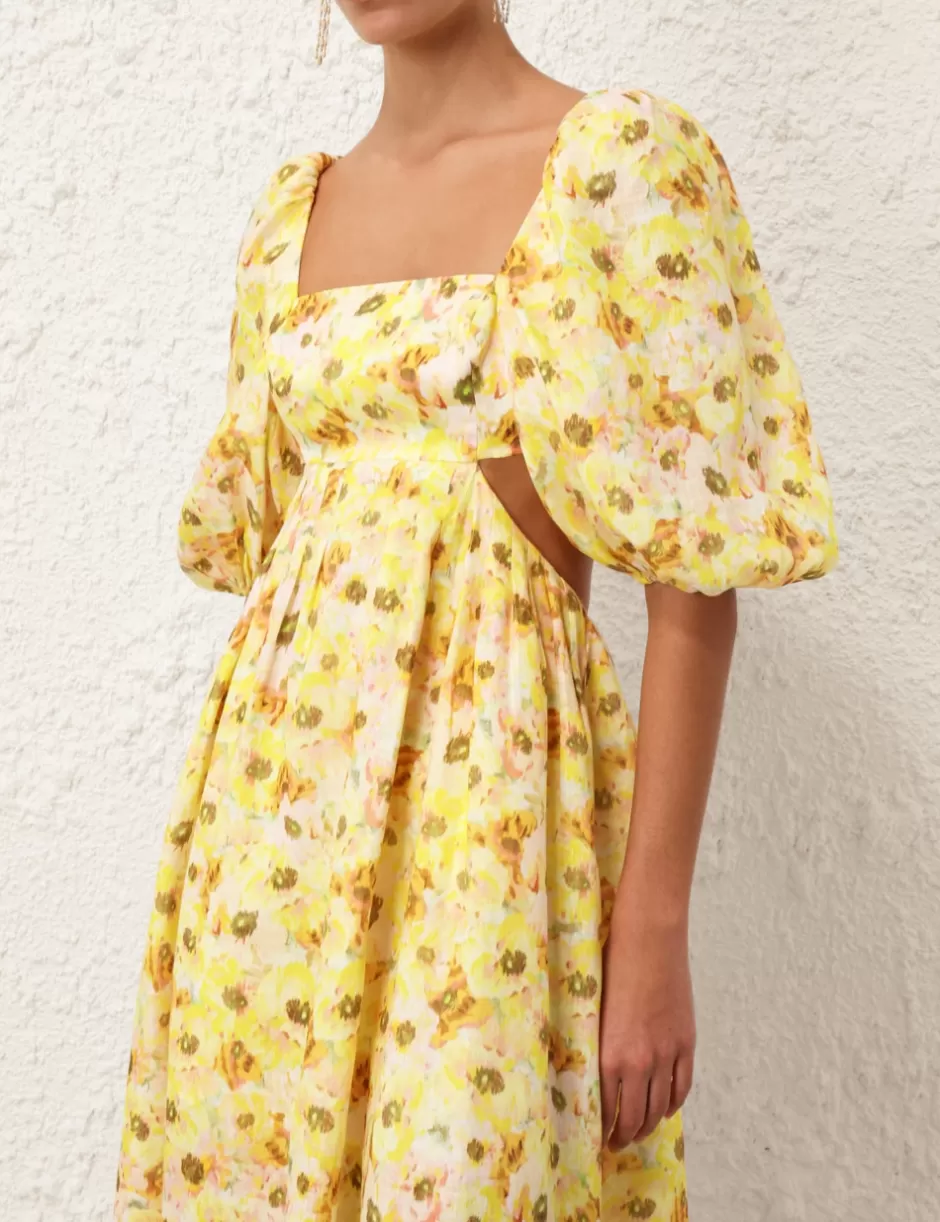 The Lightburst Cut Out Midi Dress in Yellow Floral from our Summer Swim 2024 Collection. A linen midi dress featuring short blouson sleeves with elasticated cuff and a self tie back.