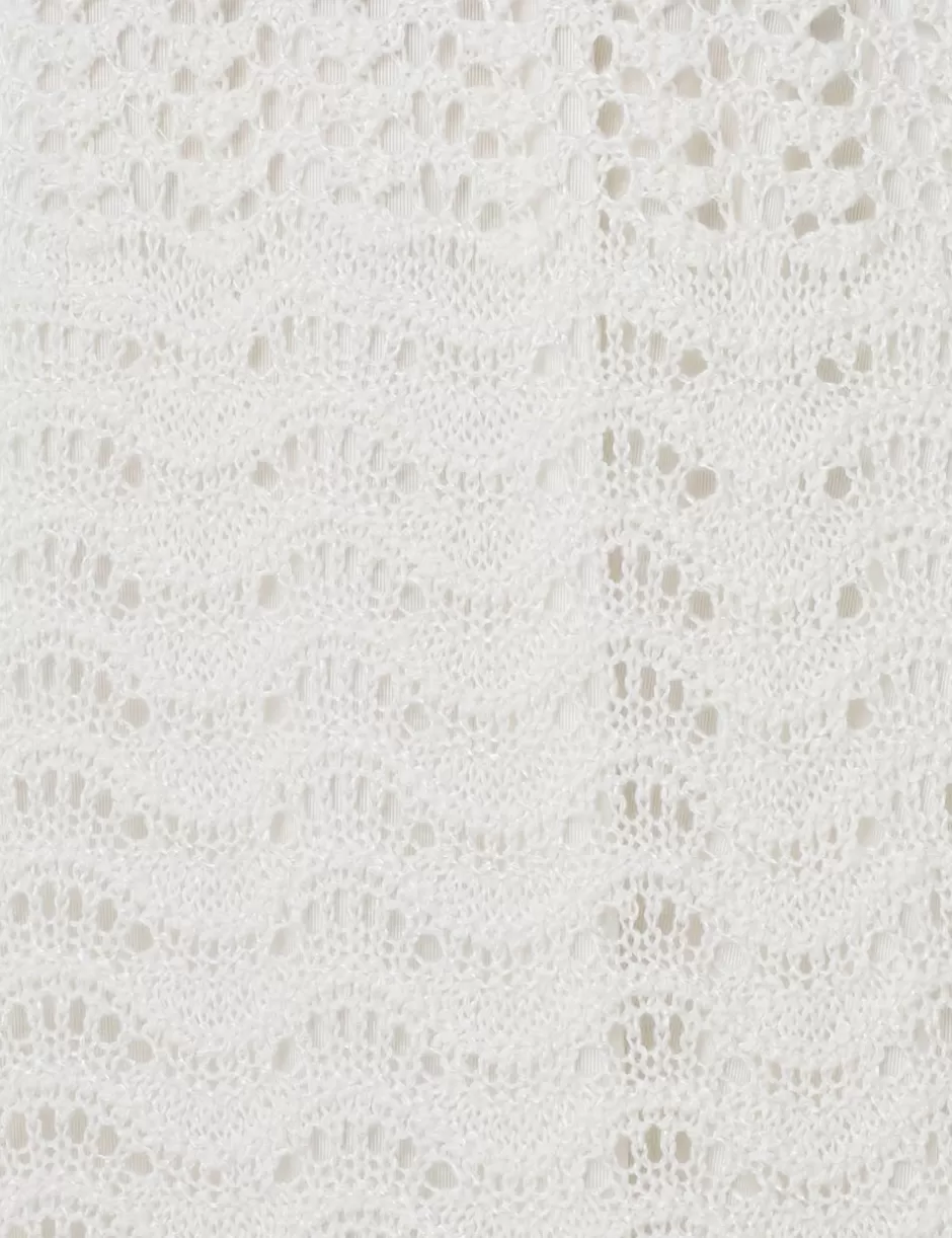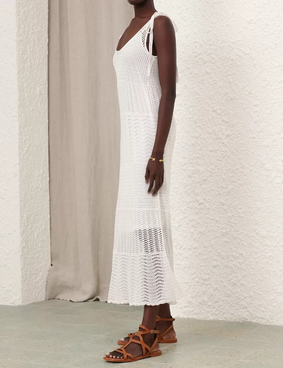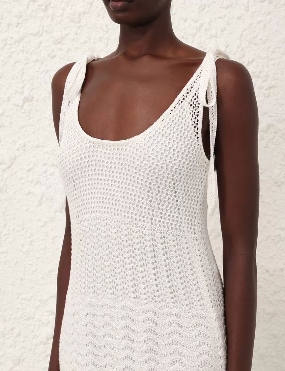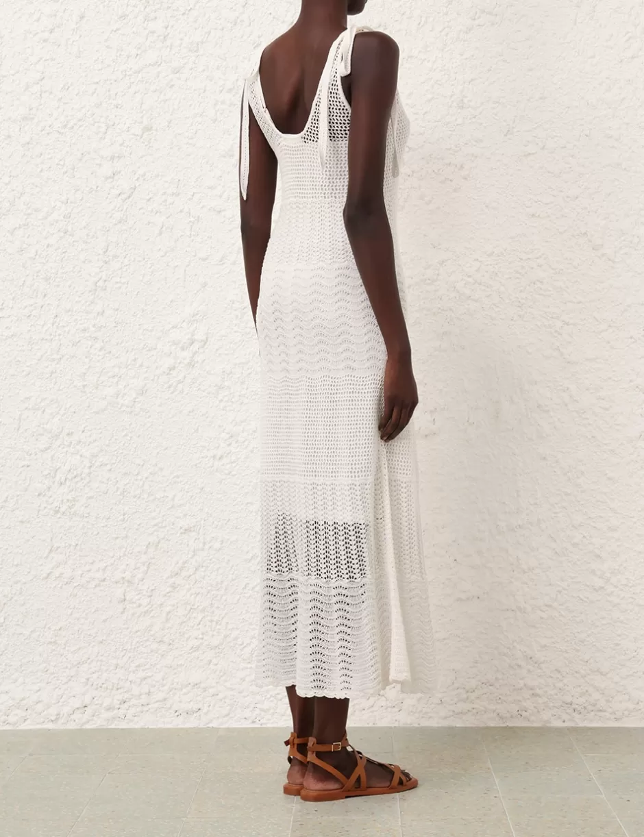 The Lightburst Textured Dress in Ivory from our Summer Swim 2024 Collection. A crochet midi dress featuring a scoop neckline and self tie shoulder straps.