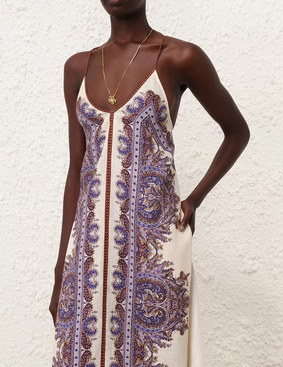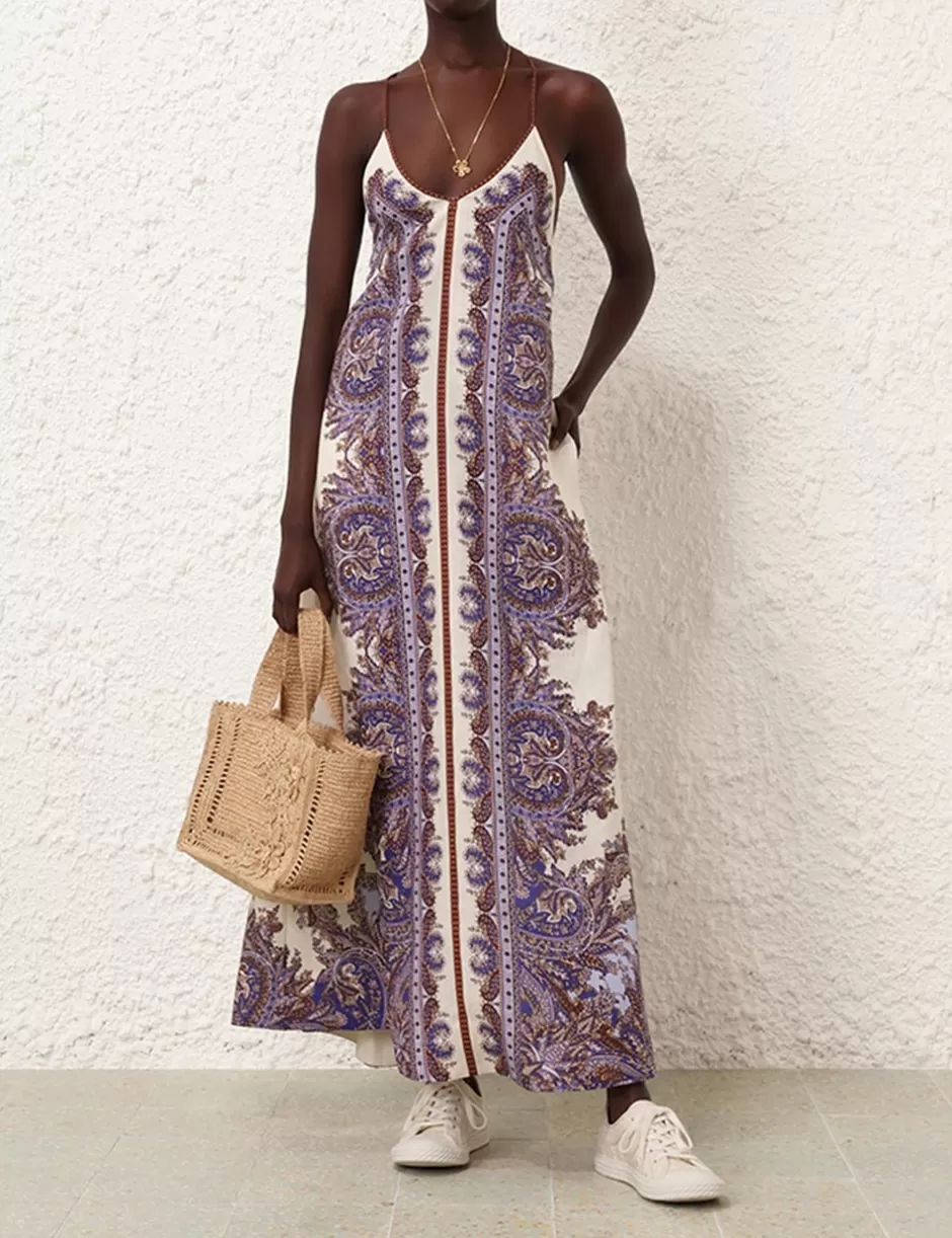 The Ottie A-line Maxi Dress in Purple Paisley from our Summer Swim 2024 Collection. A linen slip style dress featuring a placement print and side seam pockets.