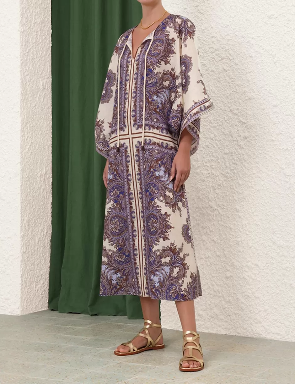 The Ottie Kaftan Midi Dress in Purple Paisley from our Summer Swim 2024 Collection. A relaxed style kaftan dress constructed from a sloppy linen.
