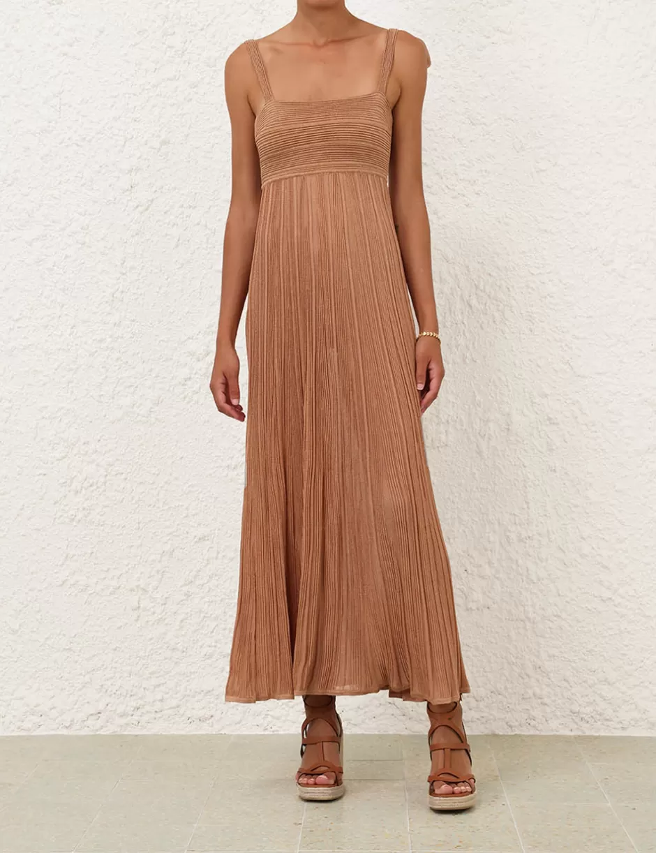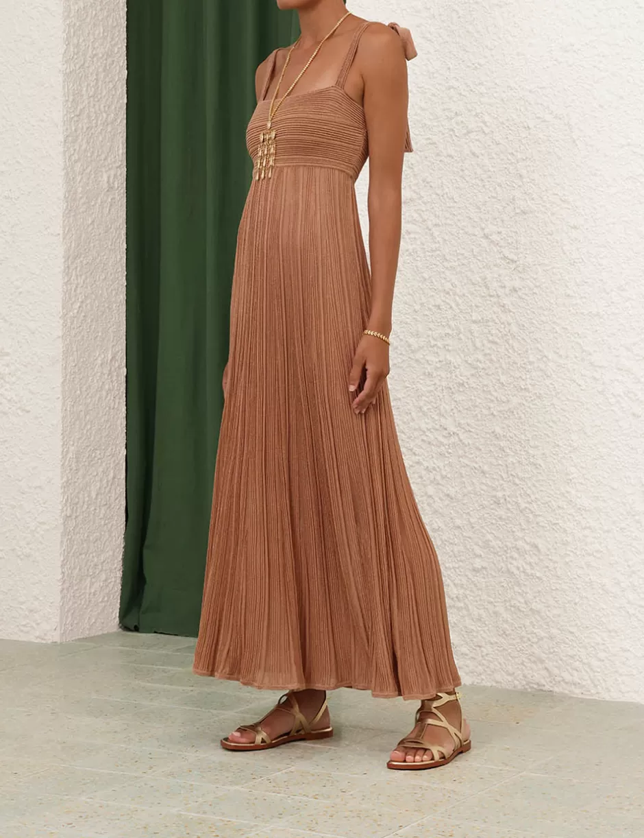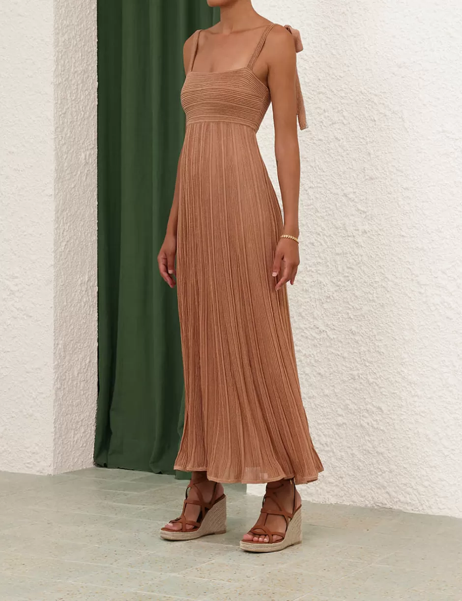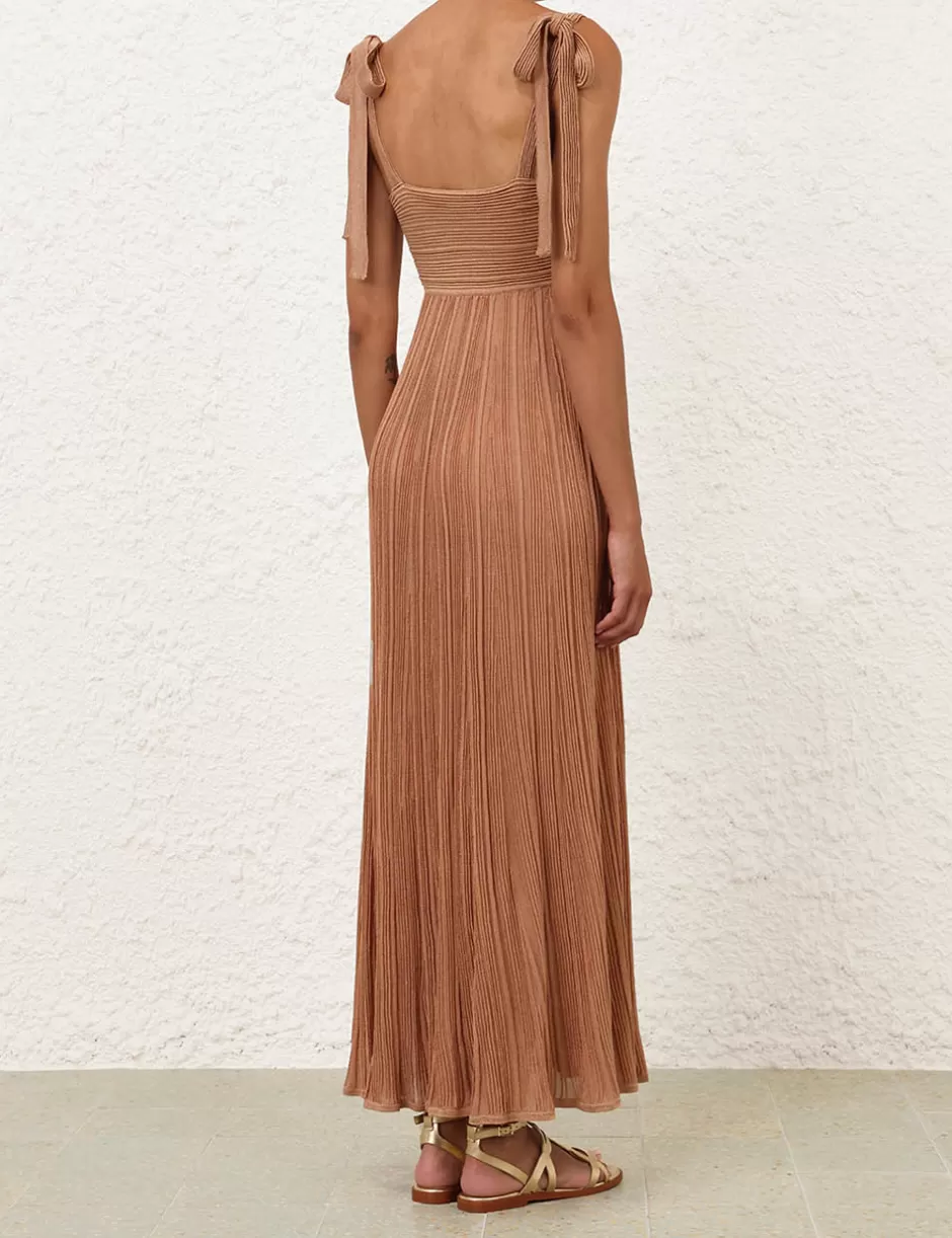 The Ottie Metallic Tie Dress in Rose from our Summer Swim 2024 Collection. A metallic midi dress featuring tie up shoulder straps.