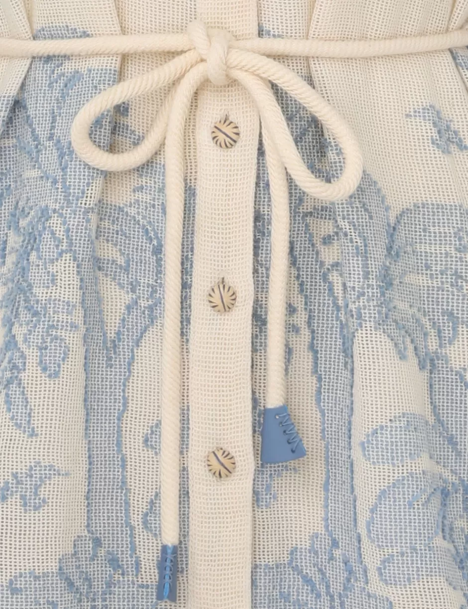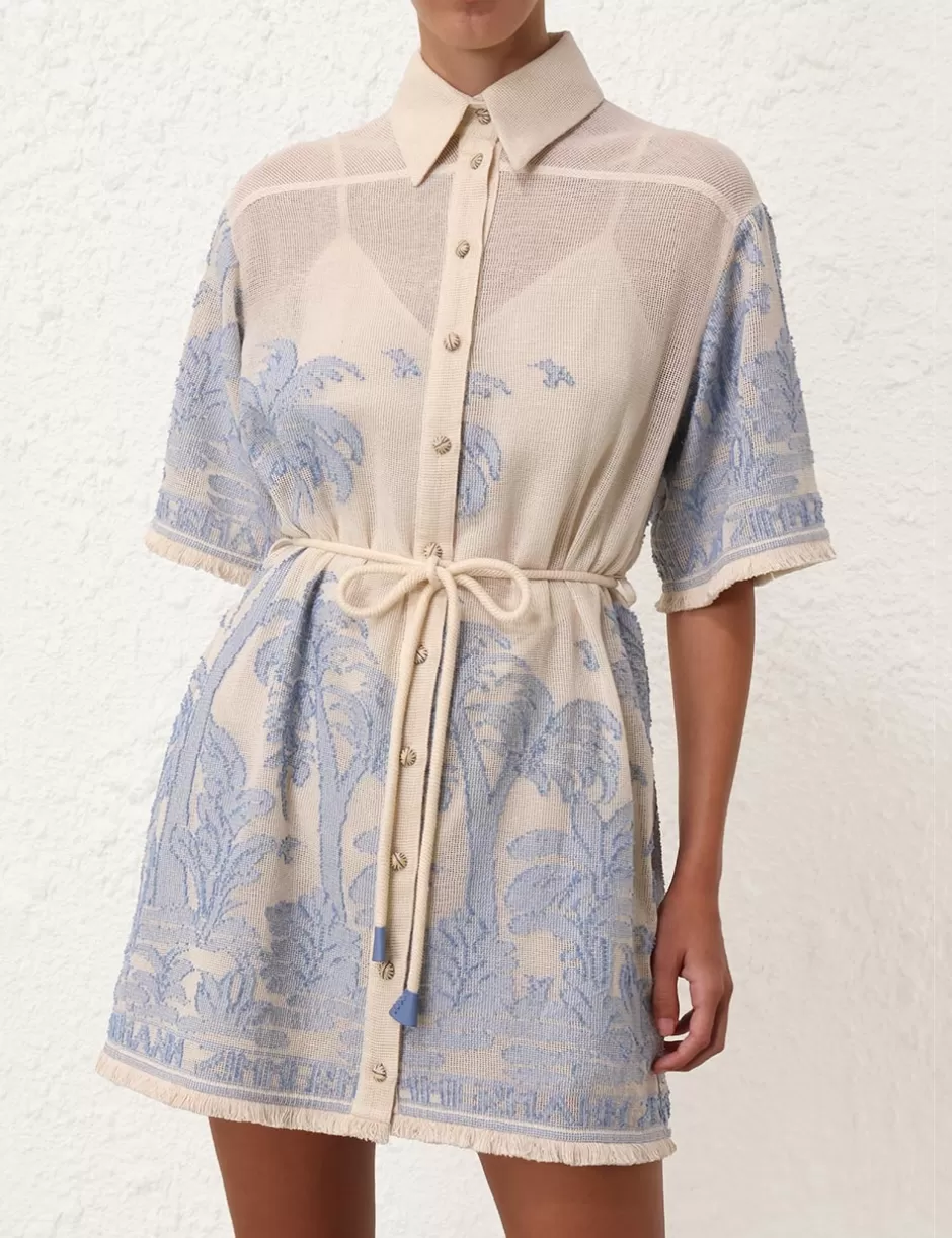 The Ottie Palm Shirt Dress in Cream/Blue from our Summer Swim 2024 Collection. A cotton mini dress featuring short sleeves and a self tie belt.